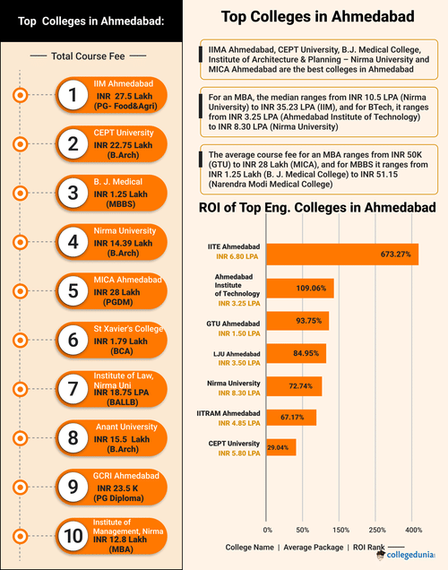 - Placement: For an MBA, IIM Ahmedabad has the highest ROI of 128%, with a total course fee of INR 27.5 lakh and a median of INR 35.23 LPA. For B.Tech., IITE Ahmedabad is the top B.Tech. college in Ahmedabad in terms of ROI; the total ROI offered is 673.27%, and the Fees & Average package of the college are INR 1.01 lakh & INR 6.80 LPA.
