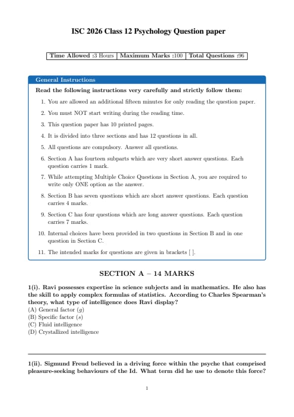 | ISC Class 12 Psychology Question Paper 2026 with Solution PDF | Download PDF | Check Solutions |