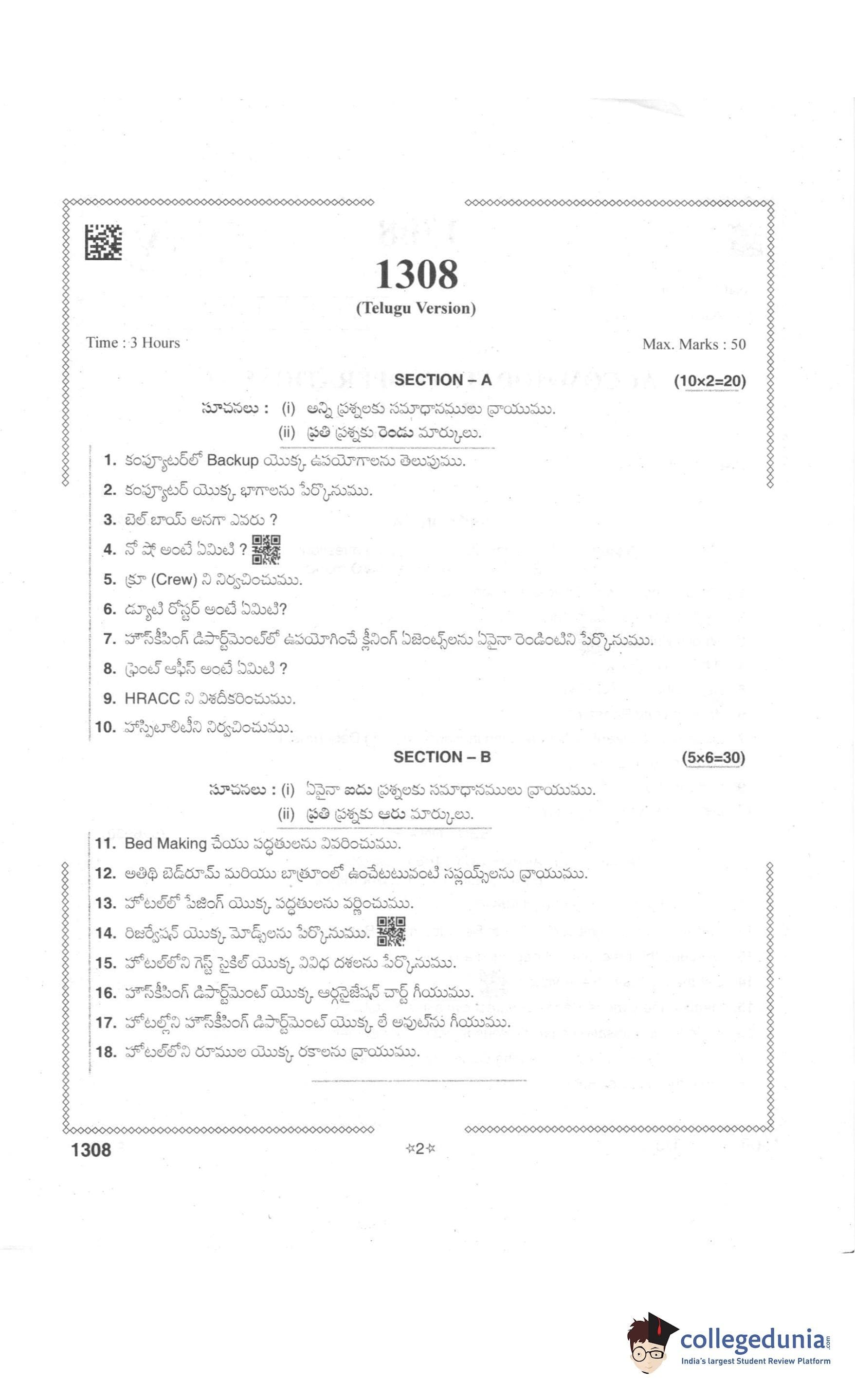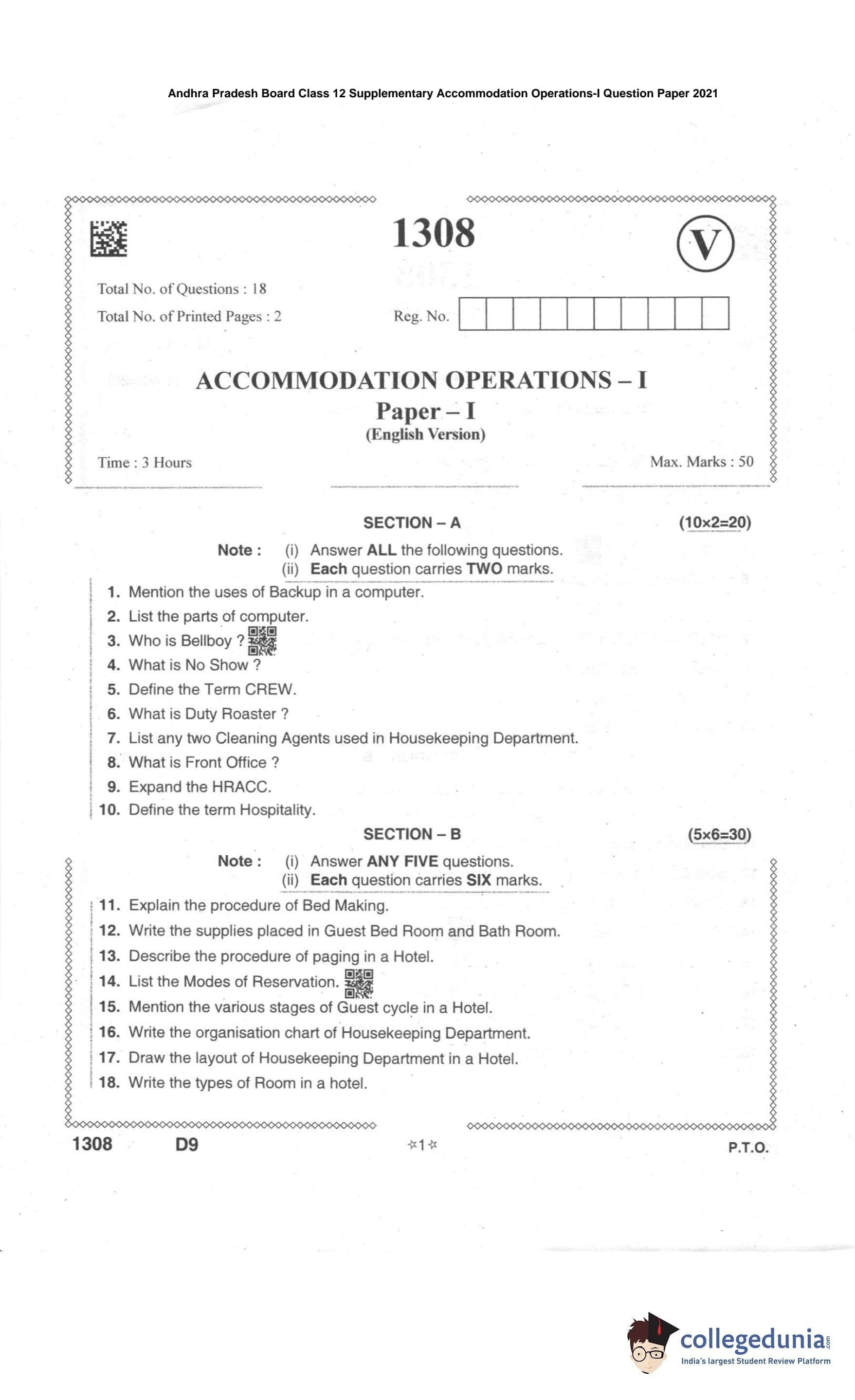 AP Intermediate 2nd year Accommodation Operations Supplementary Question Paper 2021