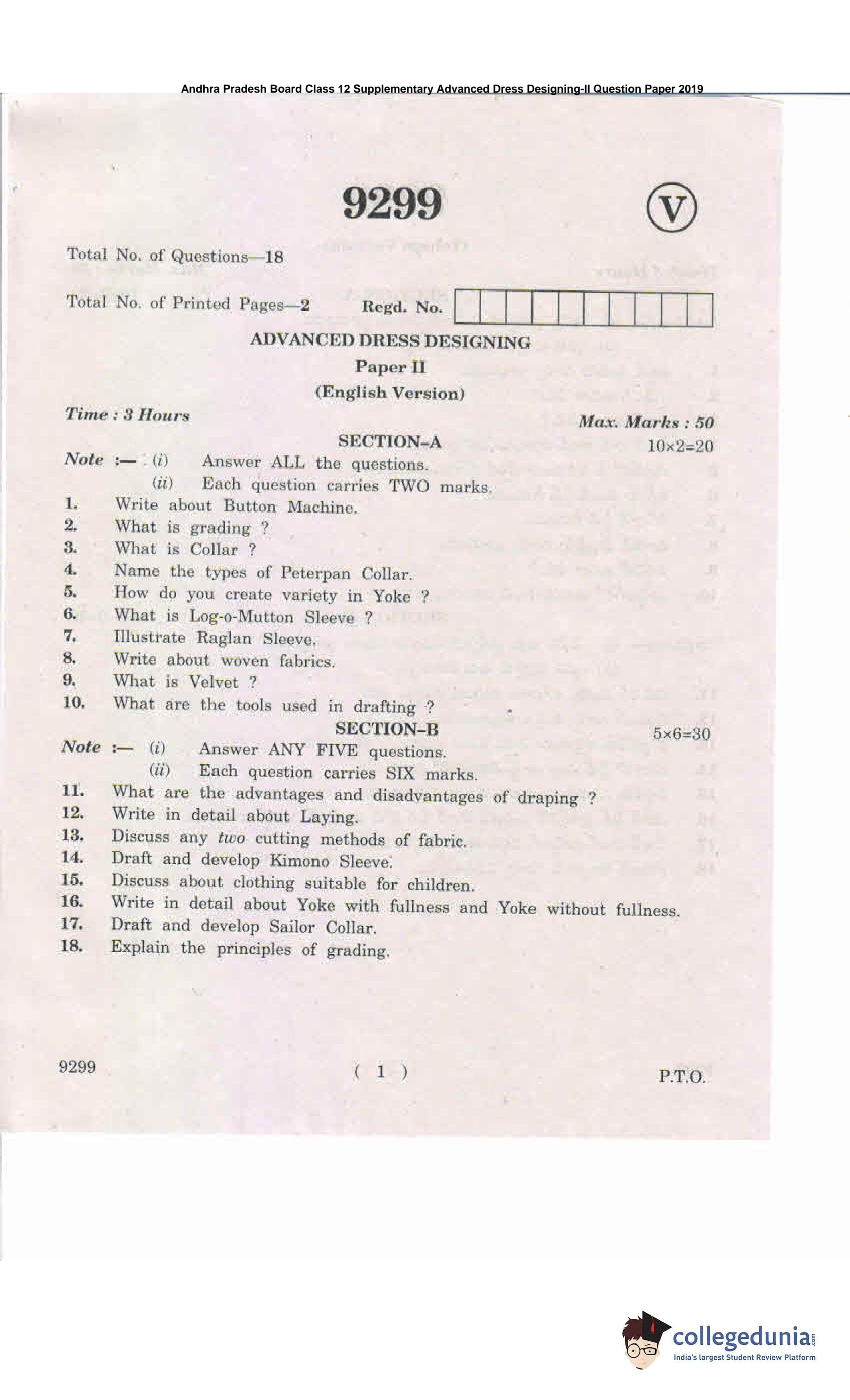 AP Intermediate 2nd year Advanced Dress Designing Supplementary Question Paper 2019 with Answer Key 9299 is available for download. The exam was conducted by the Andhra Pradesh Board of Intermediate Education (APBIE). The medium of paper was English and Telugu. The question paper comprised a total of 18 questions divided among 2 sections.