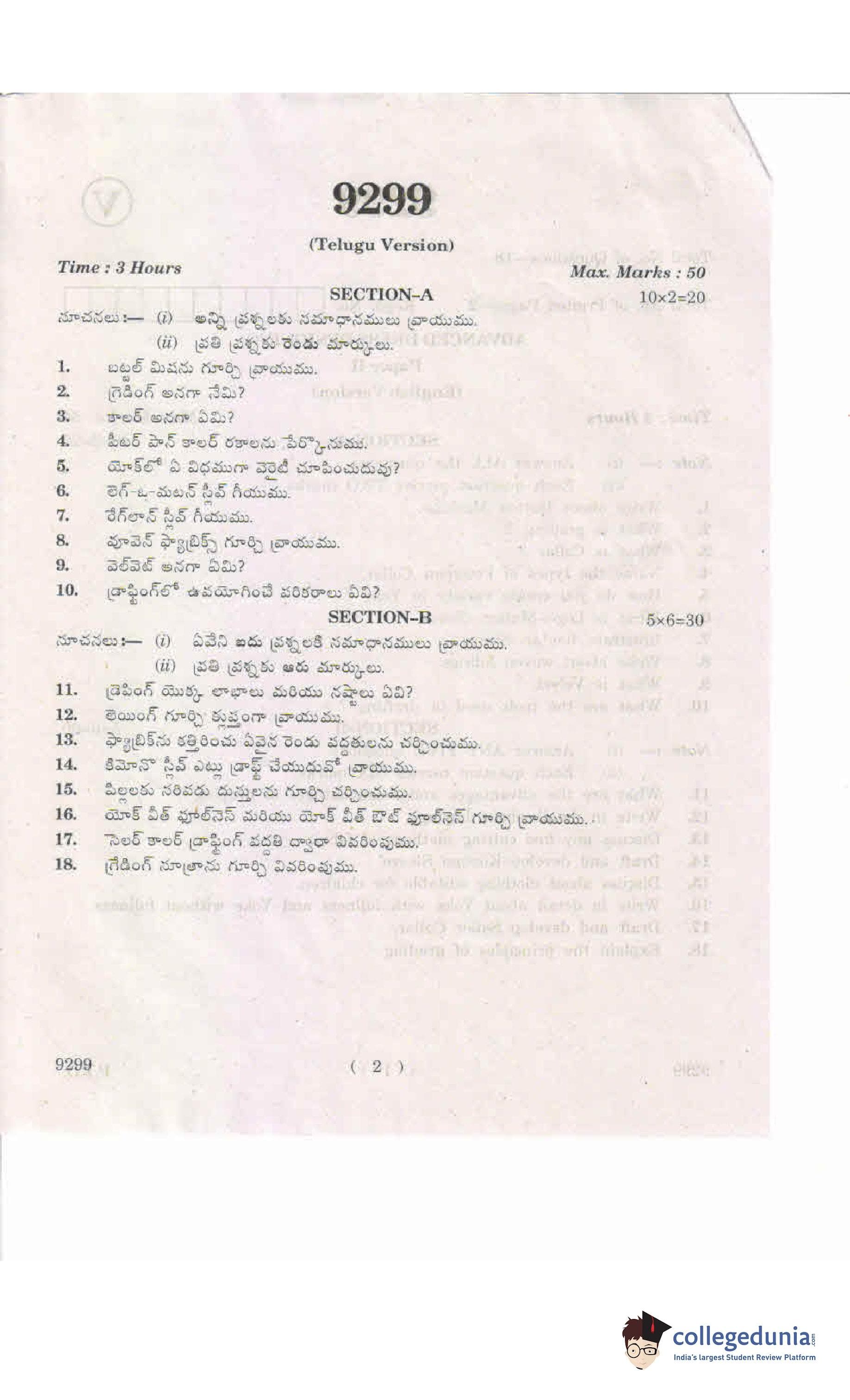 AP Intermediate 2nd year Advanced Dress Designing 9299 Supplementary Question Paper 2019