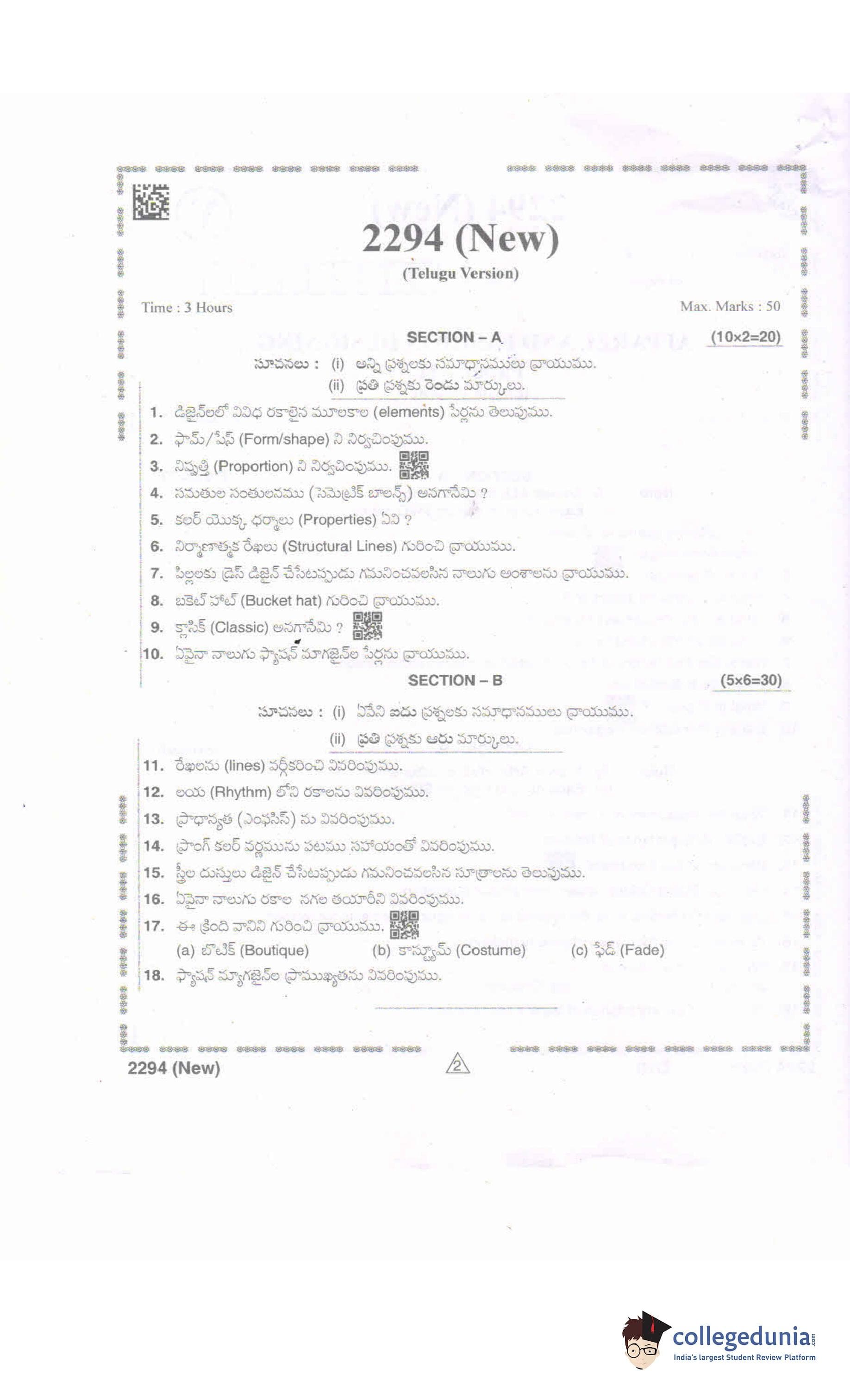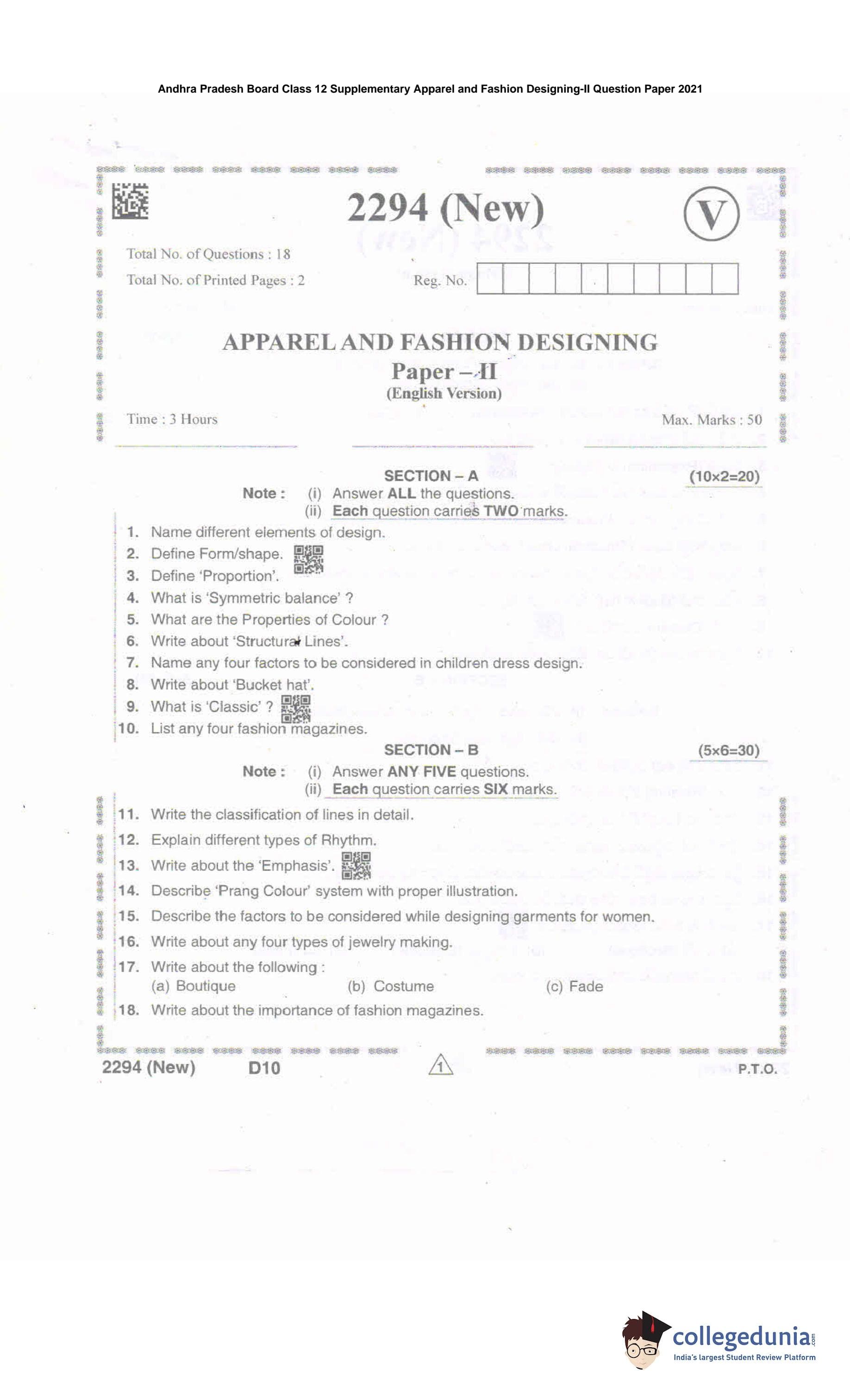 AP Intermediate 2nd year Apparel and Fashion Designing Supplementary Question Paper 2021 with Answer Key is available for download. The exam was conducted by the Andhra Pradesh Board of Intermediate Education (APBIE) . The medium of paper was English and Telugu. The question paper comprised a total of 18 questions divided among 2 sections.