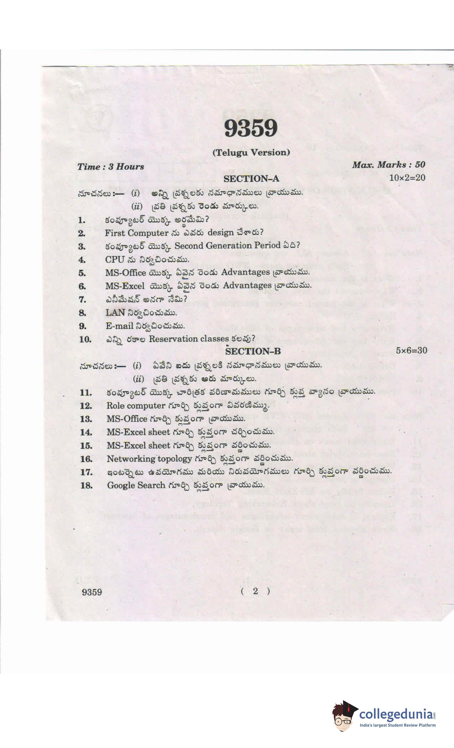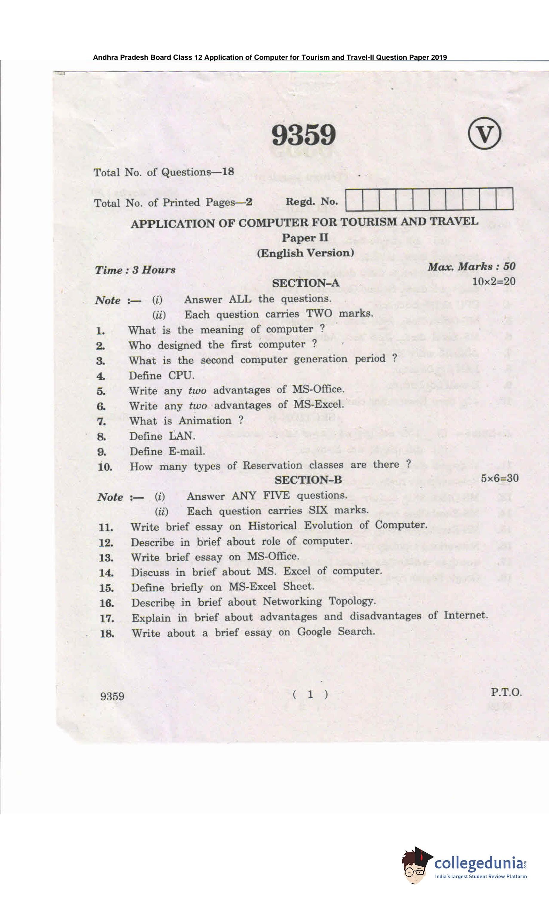 AP Intermediate 2nd year Application of Computer for Tourism and Travel Question Paper 2019 with Answer Key is available for download. The exam was conducted by the Andhra Pradesh Board of Intermediate Education (APBIE) . The medium of paper was English and Telugu.The question paper comprised a total of 18 questions divided among 2 sections.