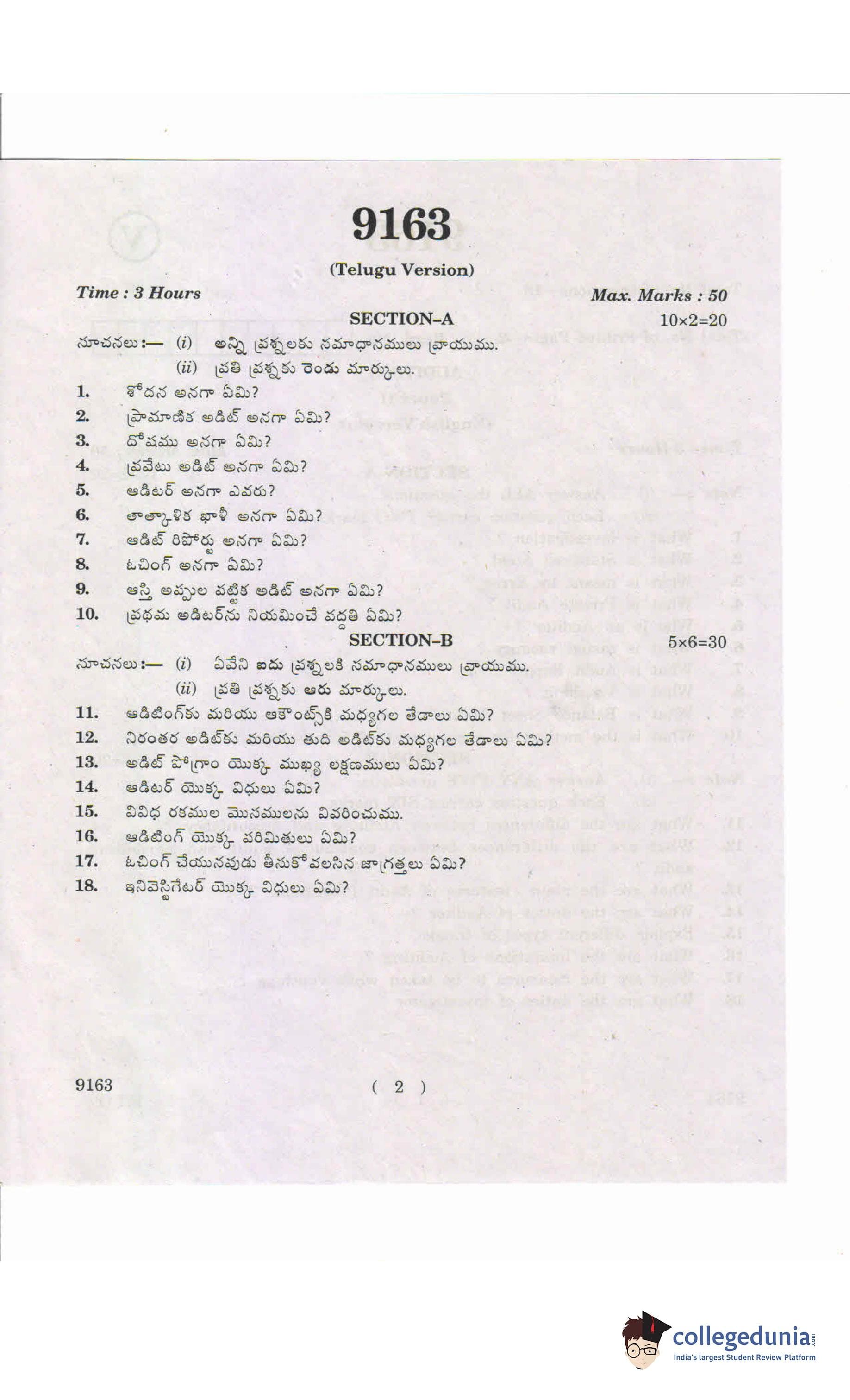 AP Intermediate 2nd year Auditing Supplementary Question Paper 2019 with Answer Key 9163 is available for download. The exam was conducted by the Andhra Pradesh Board of Intermediate Education (APBIE). The medium of paper was English and Telugu. The question paper comprised a total of 18 questions divided among 2 sections.