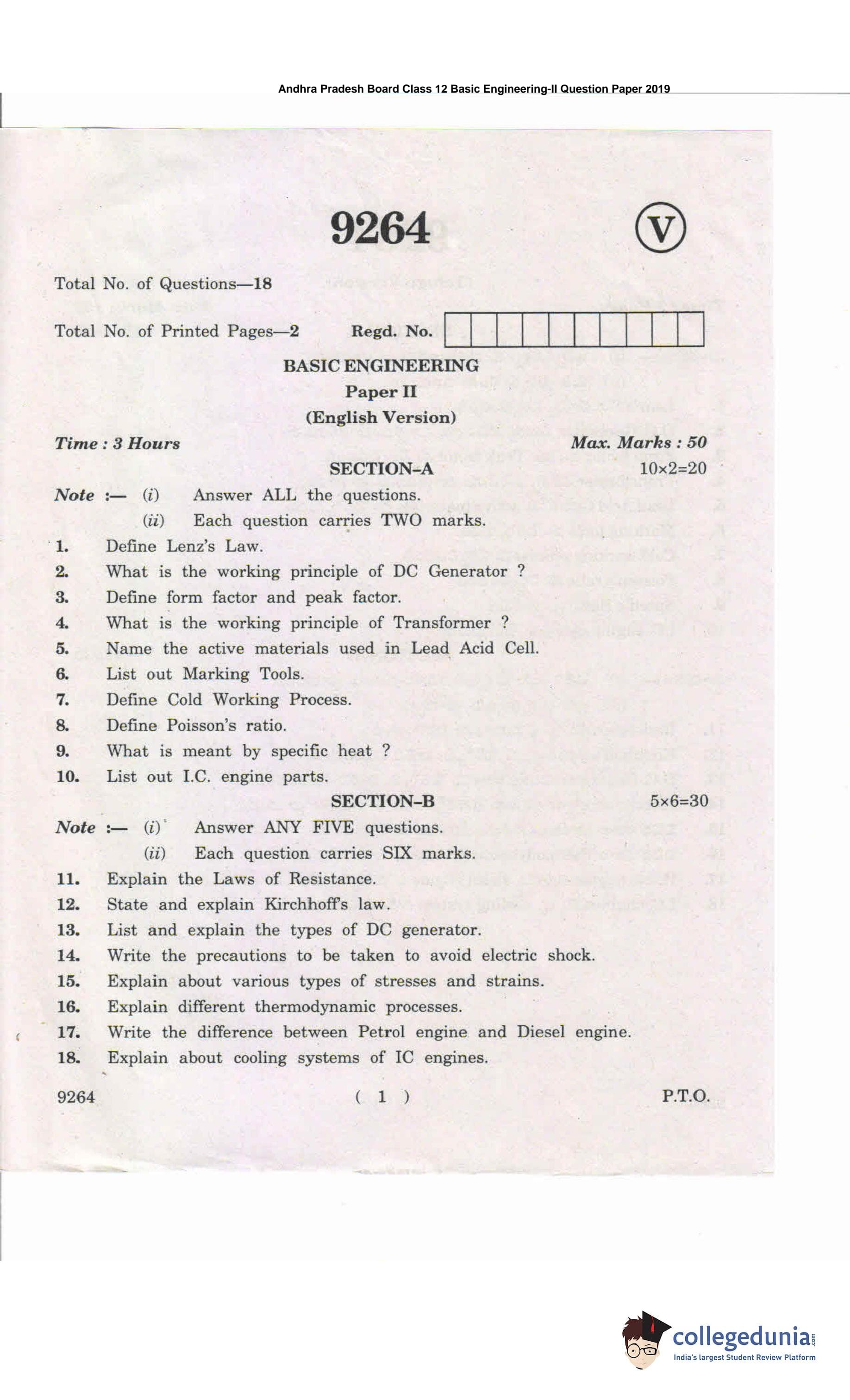 AP Intermediate 2nd year Basic Engineering Question Paper 2019 with Answer Key is available for download. The exam was conducted by the Andhra Pradesh Board of Intermediate Education (APBIE) . The medium of paper was English and Telugu.The question paper comprised a total of 18 questions divided among 2 sections.