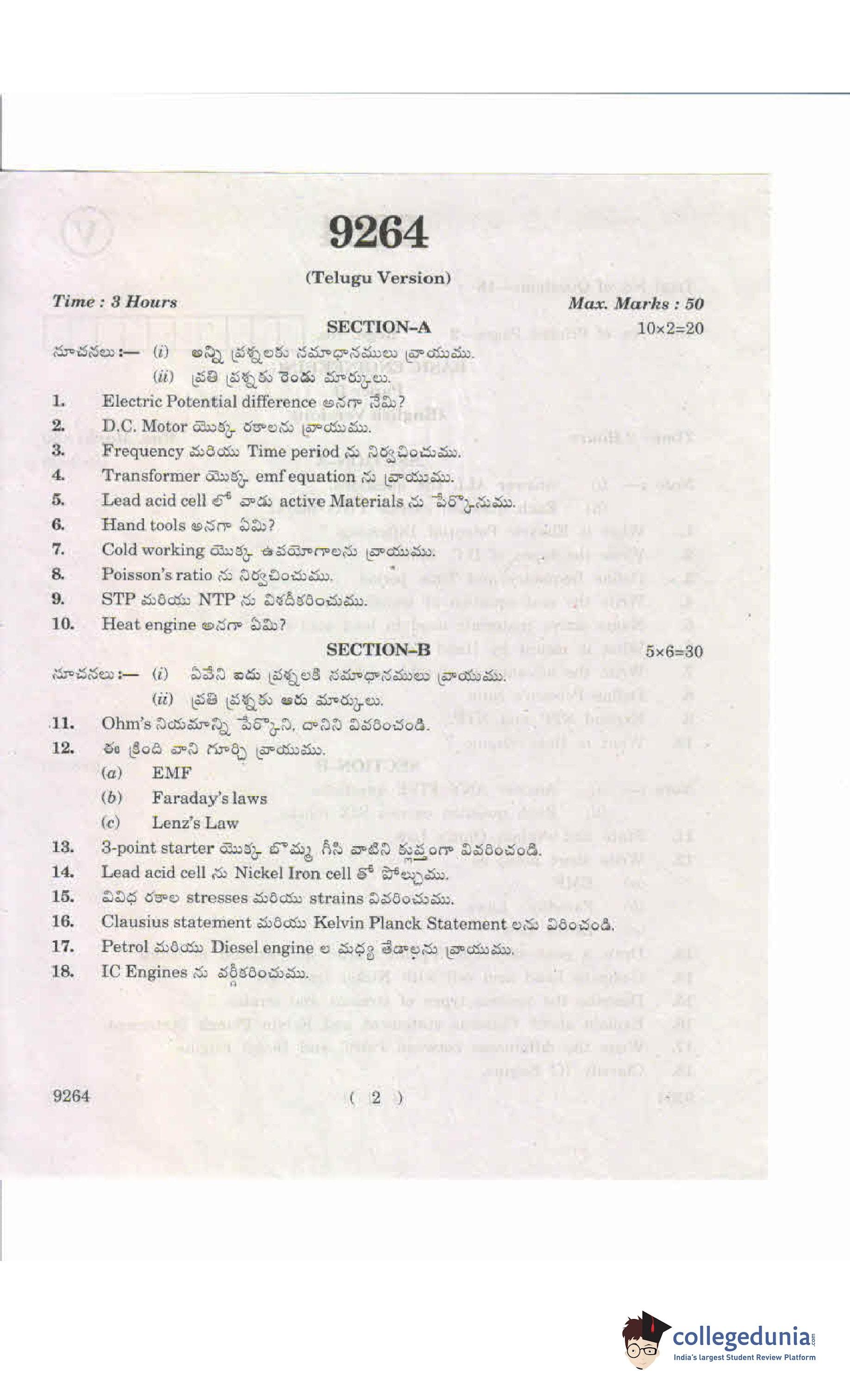 AP Intermediate 2nd year Basic Engineering Supplementary Question Paper 2019 with Answer Key 9264 is available for download. The exam was conducted by the Andhra Pradesh Board of Intermediate Education (APBIE). The medium of paper was English and Telugu. The question paper comprised a total of 18 questions divided among 2 sections.
