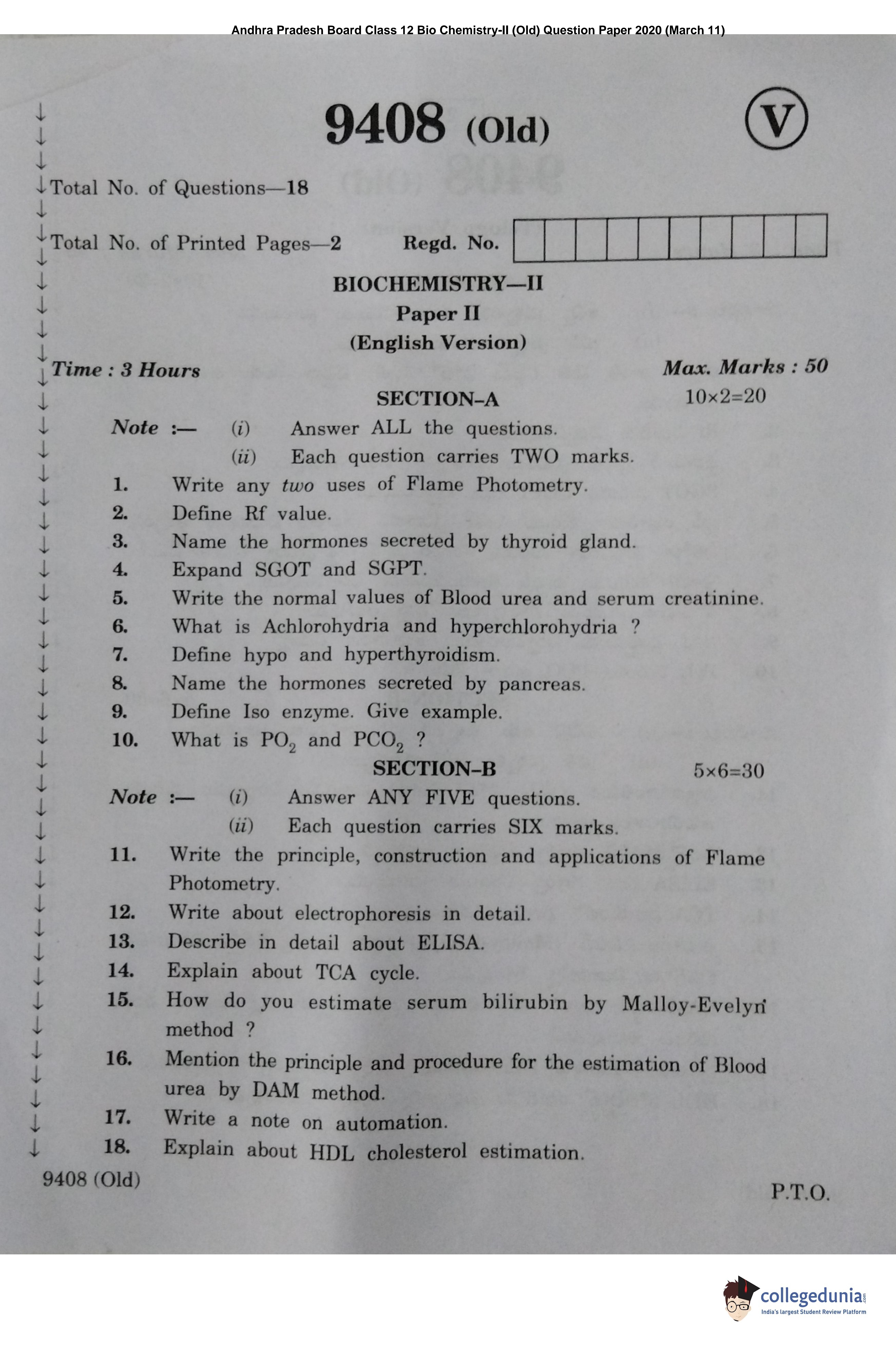 AP Intermediate 2nd year Bio Chemistry (Old) Question Paper 2020 with Answer Key (March 11)