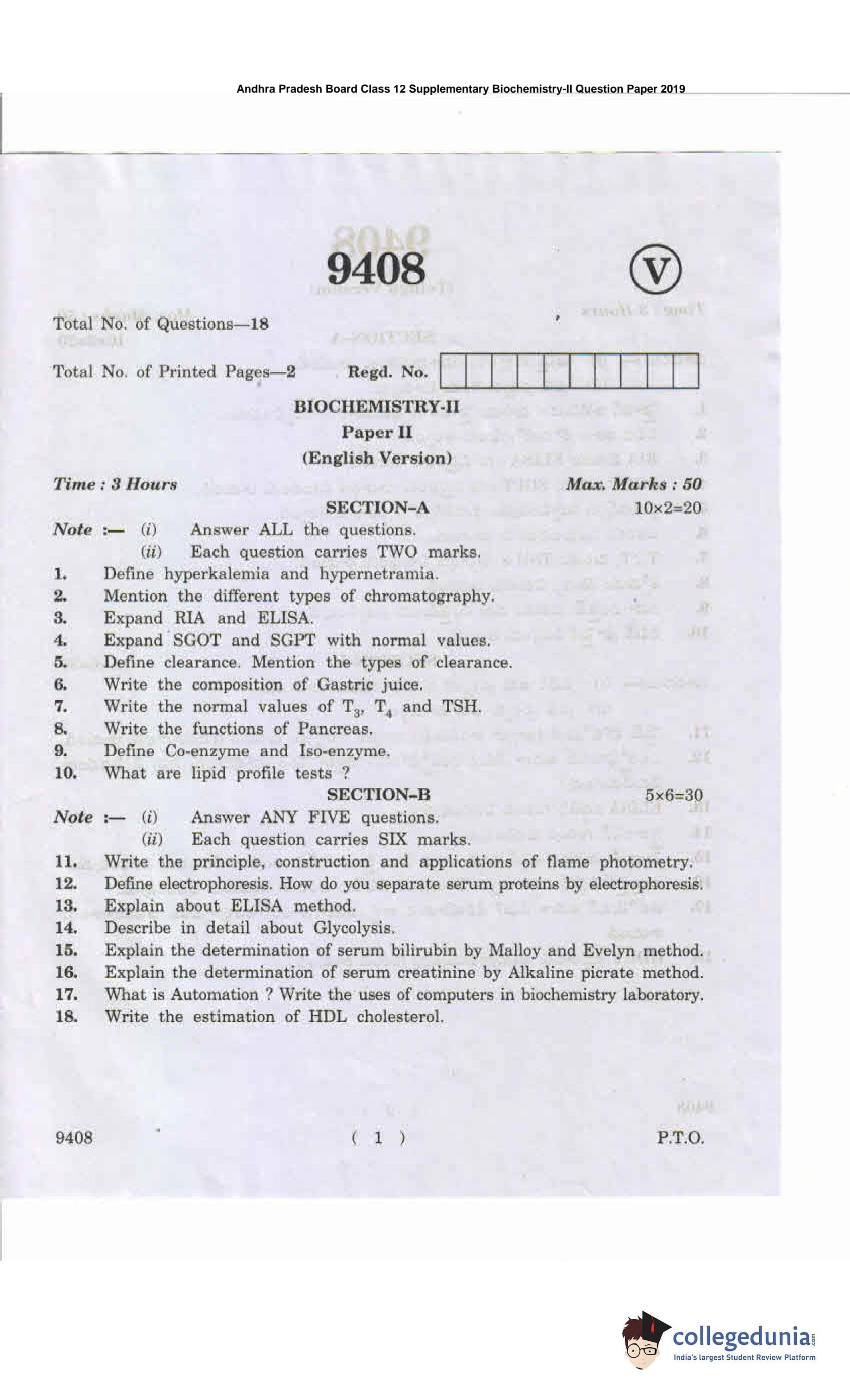 AP Intermediate 2nd year Biochemistry Supplementary Question Paper 2019 with Answer Key 9408 is available for download. The exam was conducted by the Andhra Pradesh Board of Intermediate Education (APBIE). The medium of paper was English and Telugu. The question paper comprised a total of 18 questions divided among 2 sections.