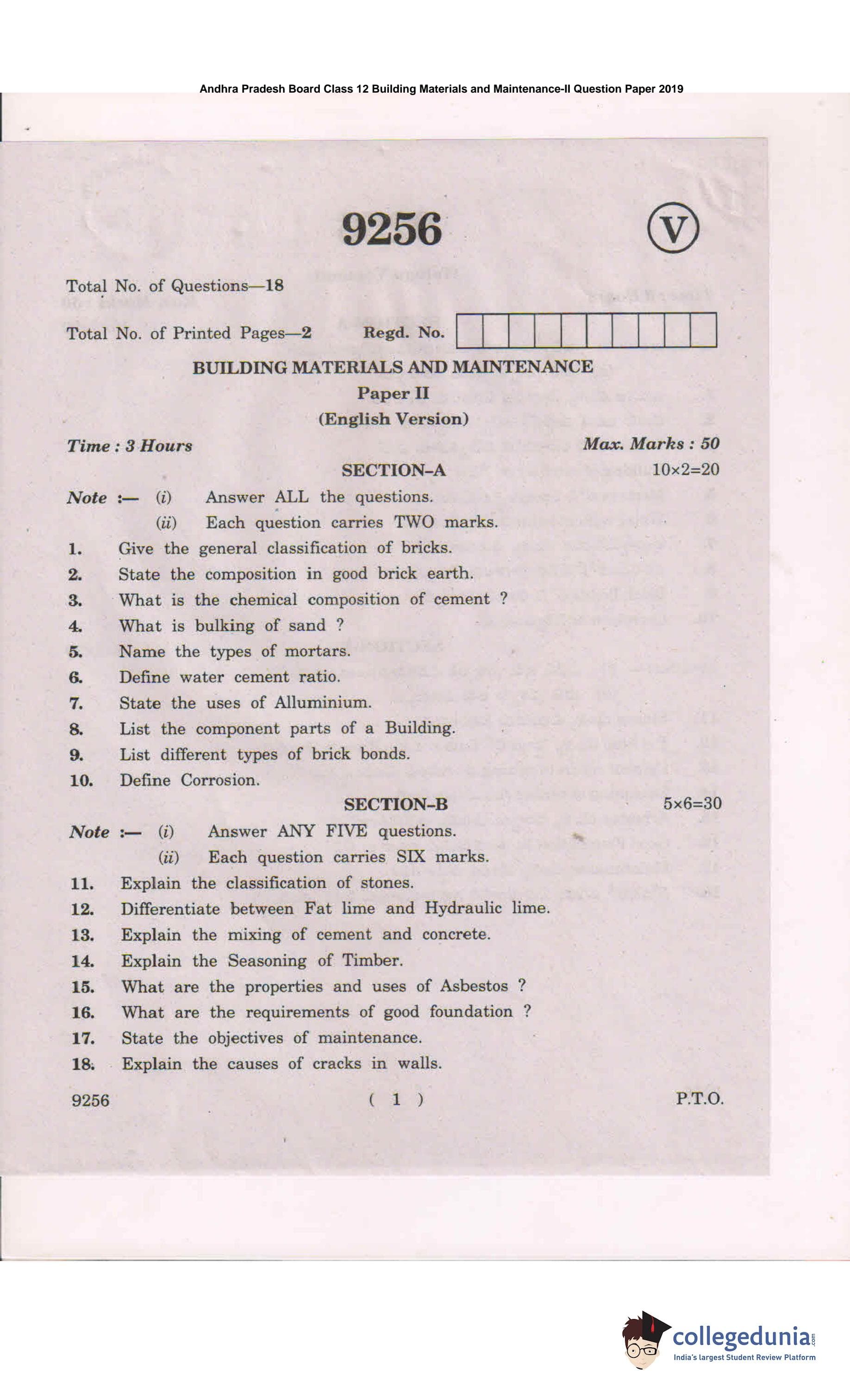 AP Intermediate 2nd year Building Materials and Maintenance Question Paper 2019 with Answer Key is available for download. The exam was conducted by the Andhra Pradesh Board of Intermediate Education (APBIE) . The medium of paper was English and Telugu.The question paper comprised a total of 18 questions divided among 2 sections.