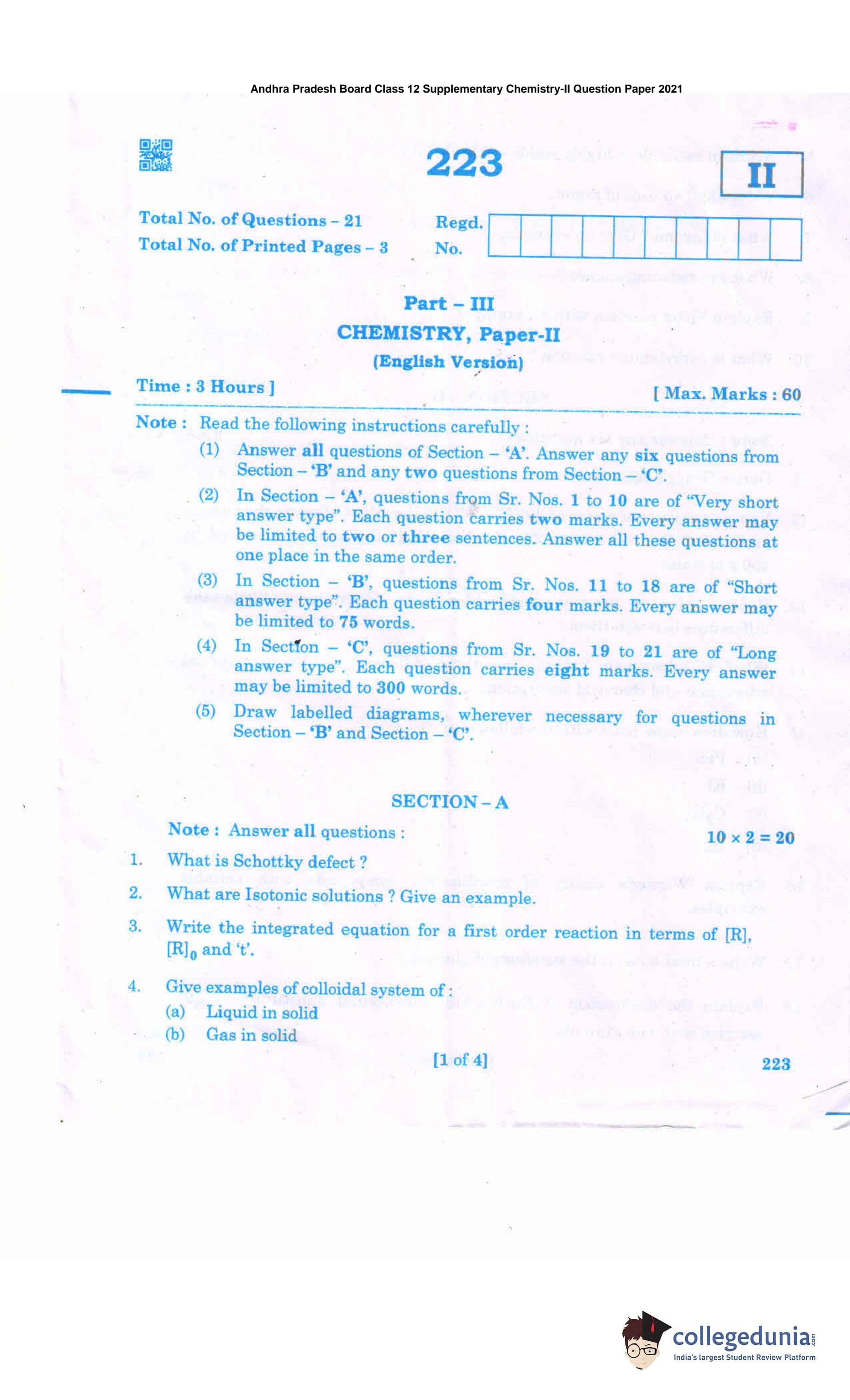 AP Intermediate 2nd year Chemistry Supplementary Question Paper 2021 with Answer Key II is available for download. The exam was conducted by the Andhra Pradesh Board of Intermediate Education (APBIE). The medium of paper was English. The question paper comprised a total of 21 questions divided among 3 sections.