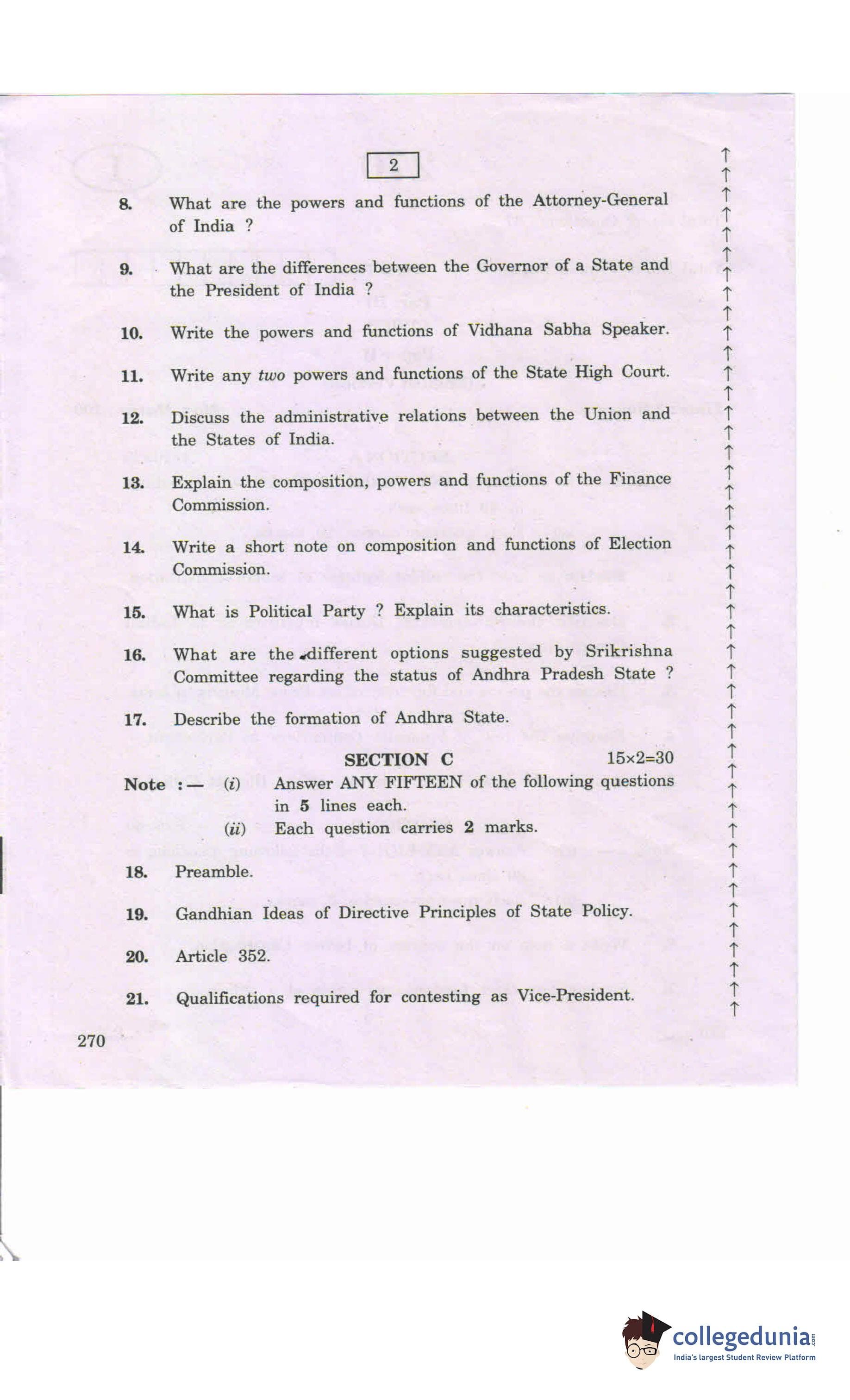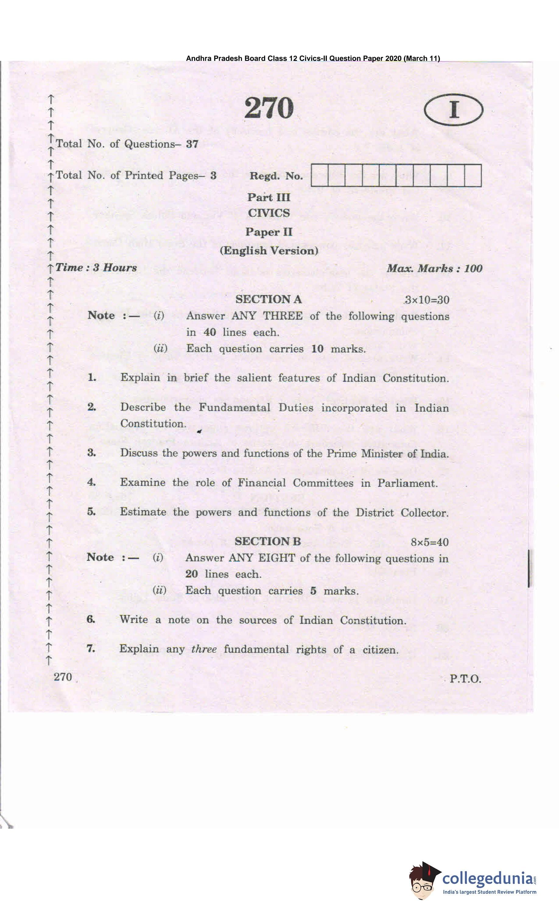 AP Intermediate 2nd year Civics Question Paper 2020 with Answer Key 270 is available for download. The exam was conducted by the Andhra Pradesh Board of Intermediate Education (APBIE) on March 11, 2020 in the Morning Session 9 AM to 12 PM. The medium of paper was English.The question paper comprised a total of 37 questions divided among 3 sections.