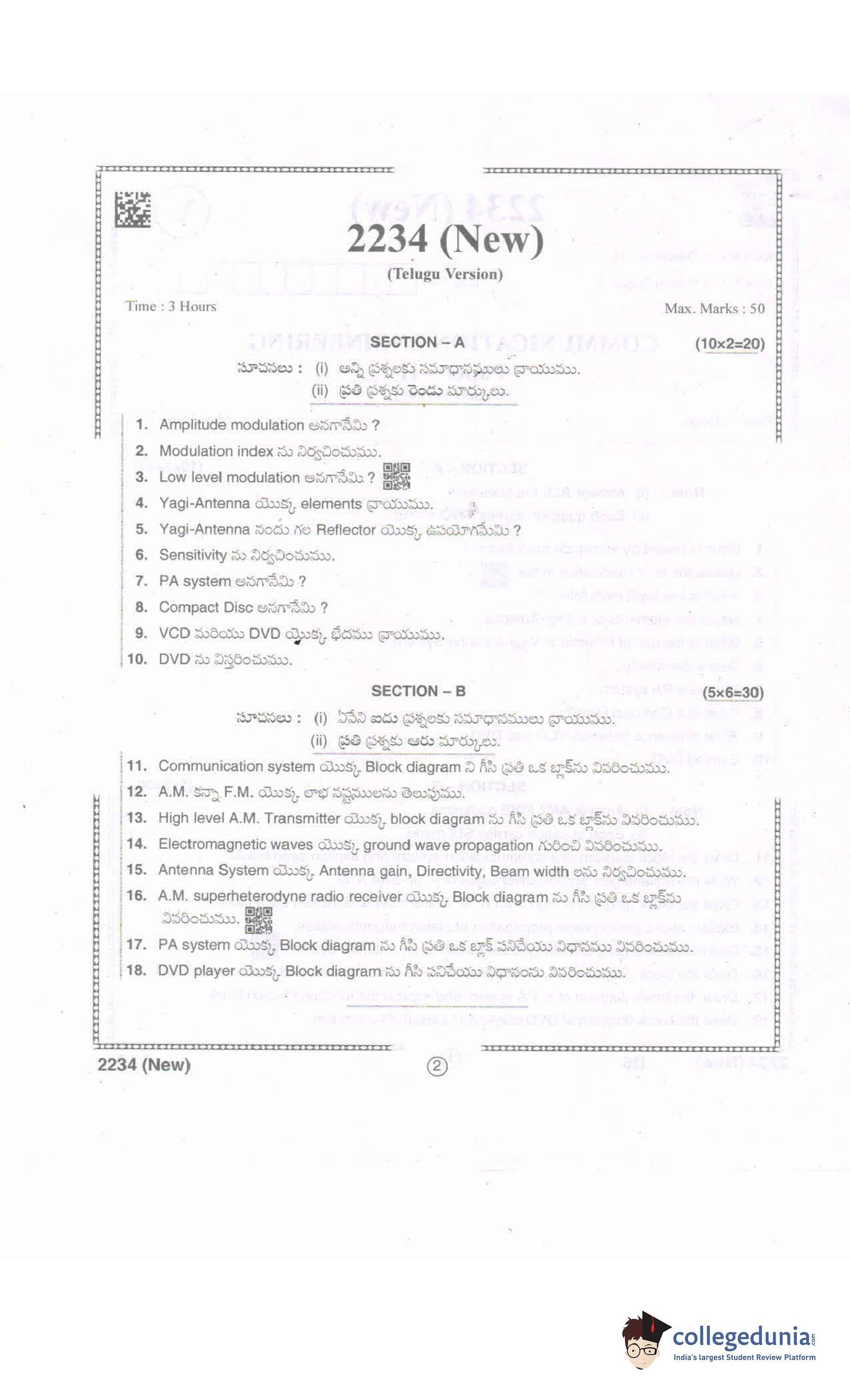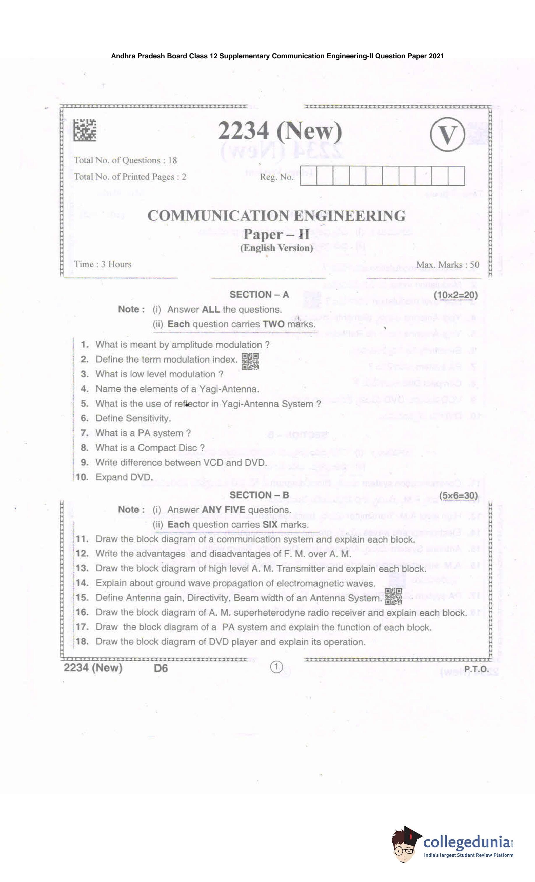 AP Intermediate 2nd year Communication Engineering Supplementary Question Paper 2021 with Answer Key is available for download. The exam was conducted by the Andhra Pradesh Board of Intermediate Education (APBIE) . The medium of paper was English and Telugu. The question paper comprised a total of 18 questions divided among 2 sections.