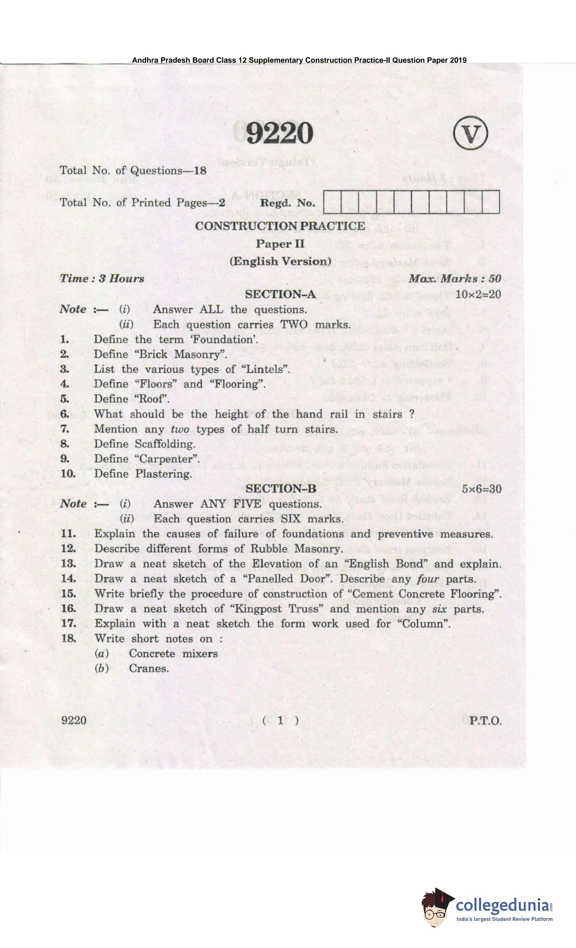 AP Intermediate 2nd year Construction Practice Supplementary Question Paper 2019 with Answer Key 9220 is available for download. The exam was conducted by the Andhra Pradesh Board of Intermediate Education (APBIE). The medium of paper was English and Telugu. The question paper comprised a total of 18 questions divided among 2 sections.