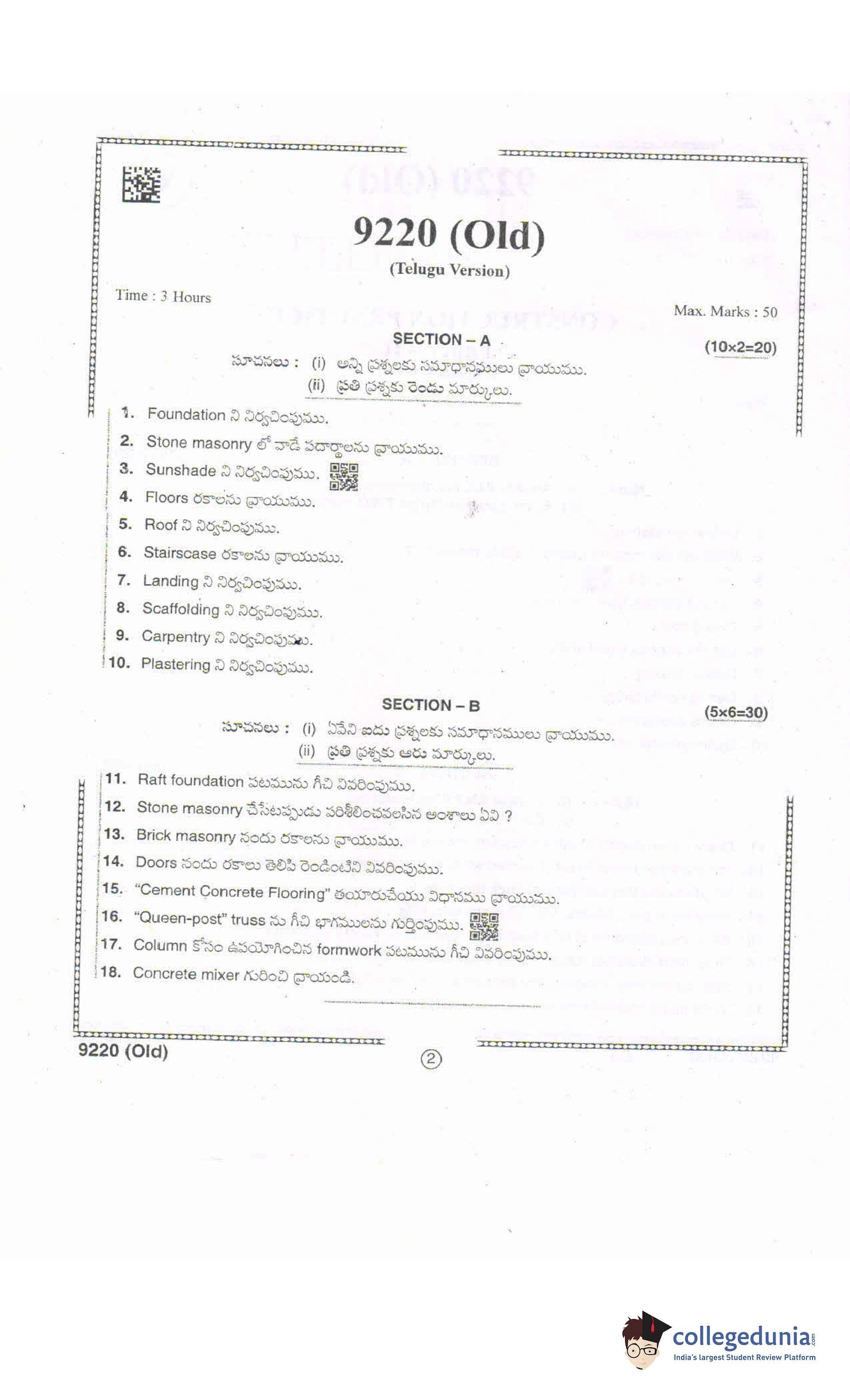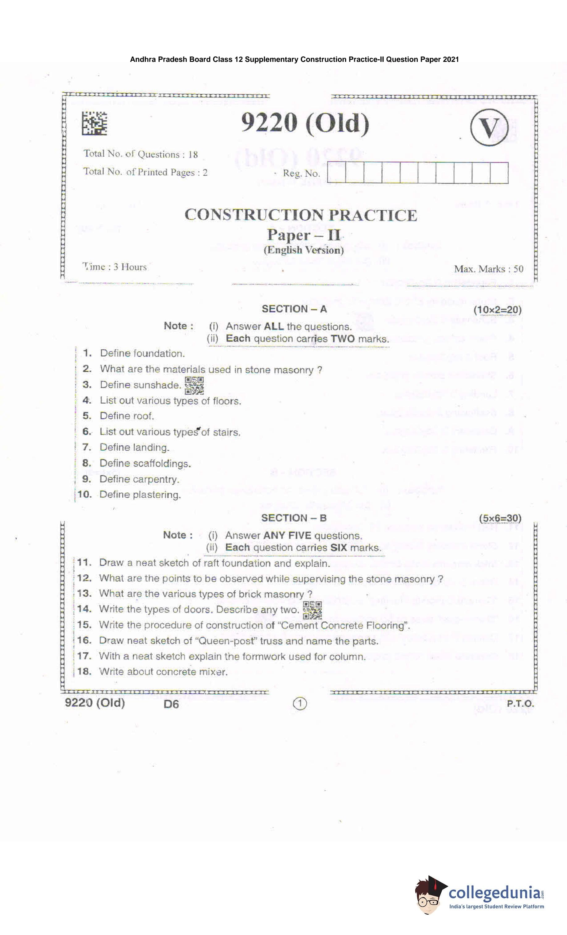 AP Intermediate 2nd year Construction Practice Supplementary Question Paper 2021 with Answer Key is available for download. The exam was conducted by the Andhra Pradesh Board of Intermediate Education (APBIE) . The medium of paper was English and Telugu. The question paper comprised a total of 18 questions divided among 2 sections.