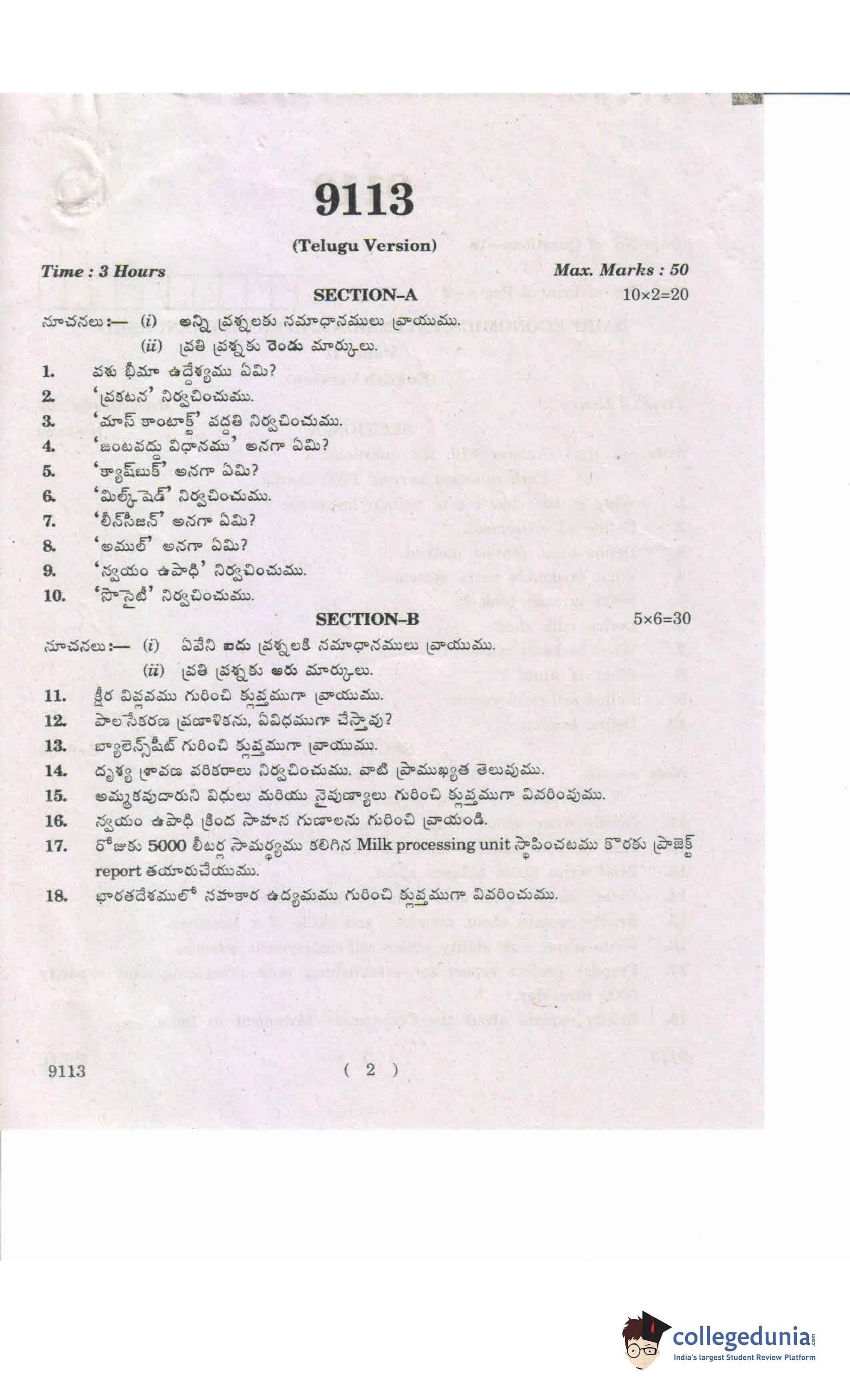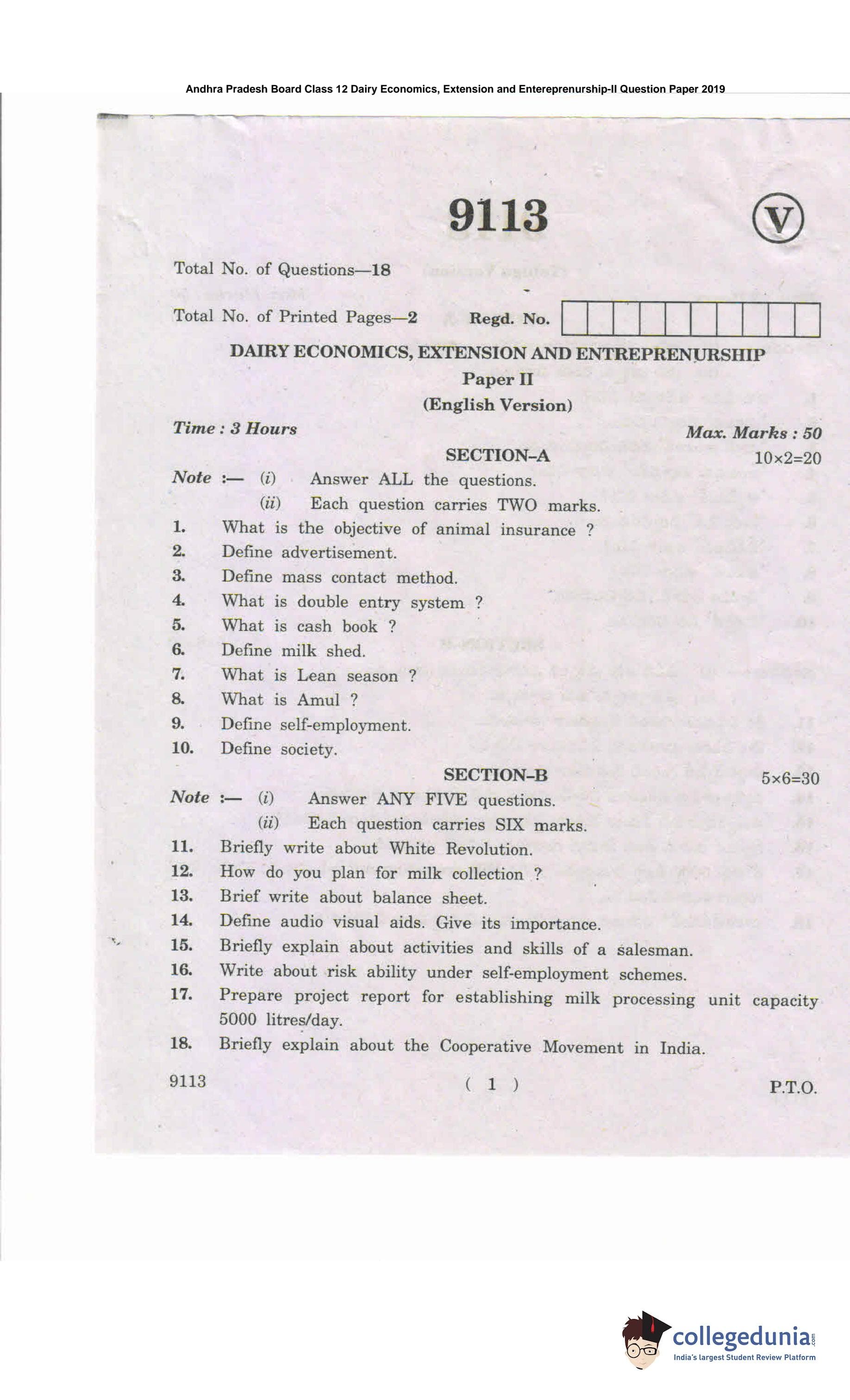 AP Intermediate 2nd year Dairy Economics, Extension and Entereprenurship Question Paper 2019 with Answer Key is available for download. The exam was conducted by the Andhra Pradesh Board of Intermediate Education (APBIE) . The medium of paper was English and Telugu.The question paper comprised a total of 18 questions divided among 2 sections.