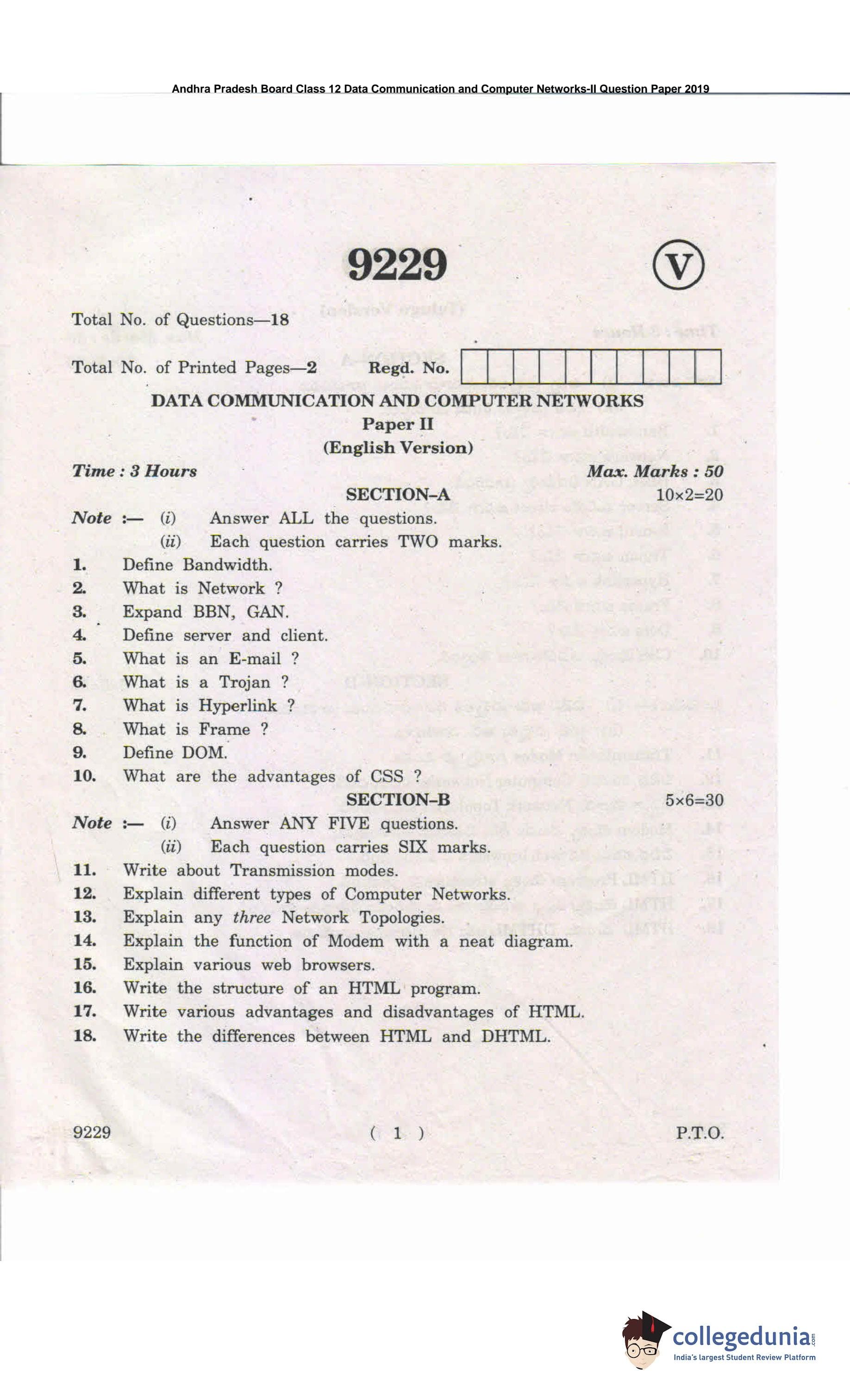 AP Intermediate 2nd year Data Communication and Computer Networks Question Paper 2019 with Answer Key is available for download. The exam was conducted by the Andhra Pradesh Board of Intermediate Education (APBIE) . The medium of paper was English and Telugu.The question paper comprised a total of 18 questions divided among 2 sections.
