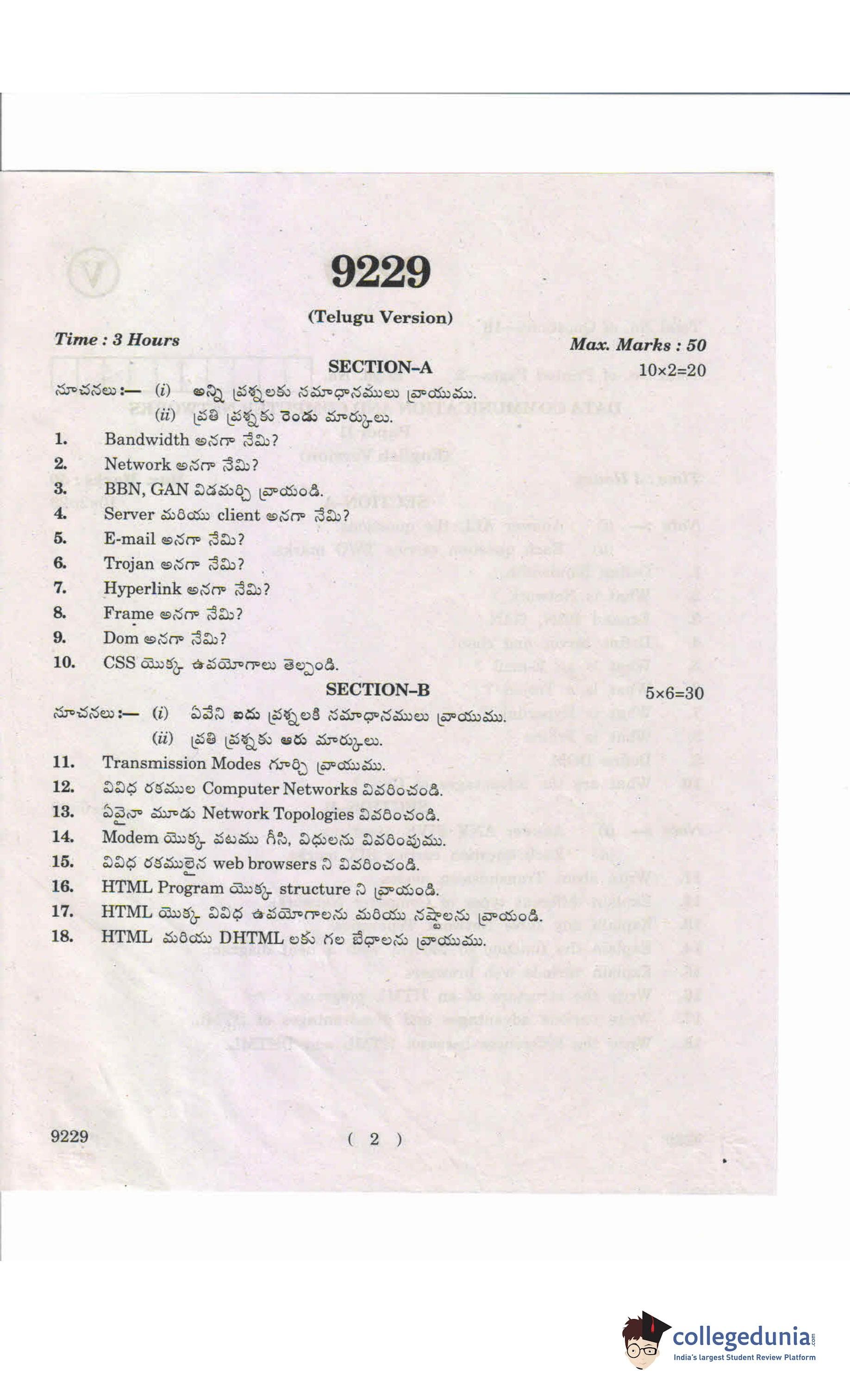 AP Intermediate 2nd year Data Communication and Computer Networks Question Paper 2019 with Answer Key
