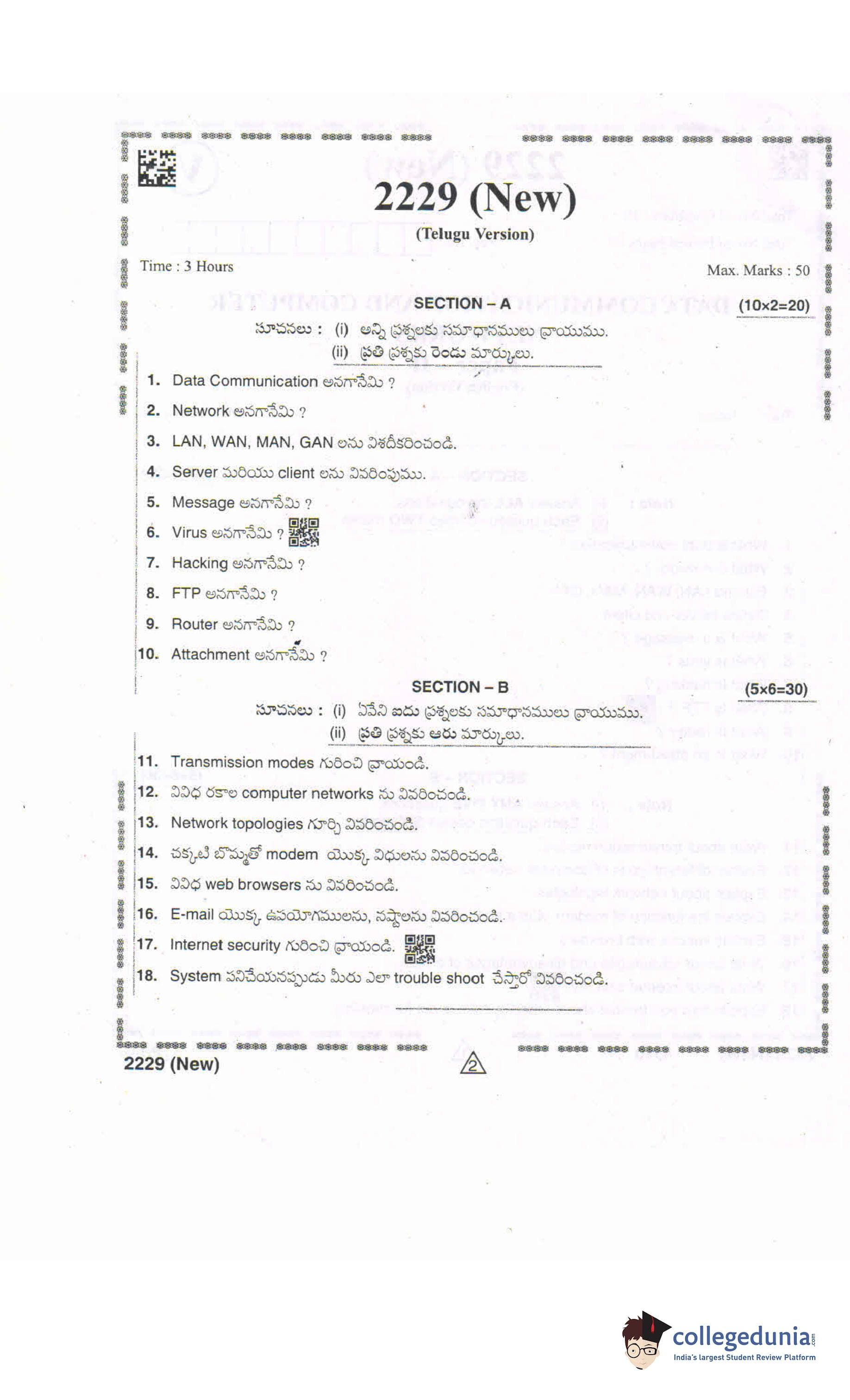 AP Intermediate 2nd year Data Communication and Computer Networks Supplementary Question Paper 2021 with Answer Key is available for download. The exam was conducted by the Andhra Pradesh Board of Intermediate Education (APBIE) . The medium of paper was English and Telugu. The question paper comprised a total of 18 questions divided among 2 sections.