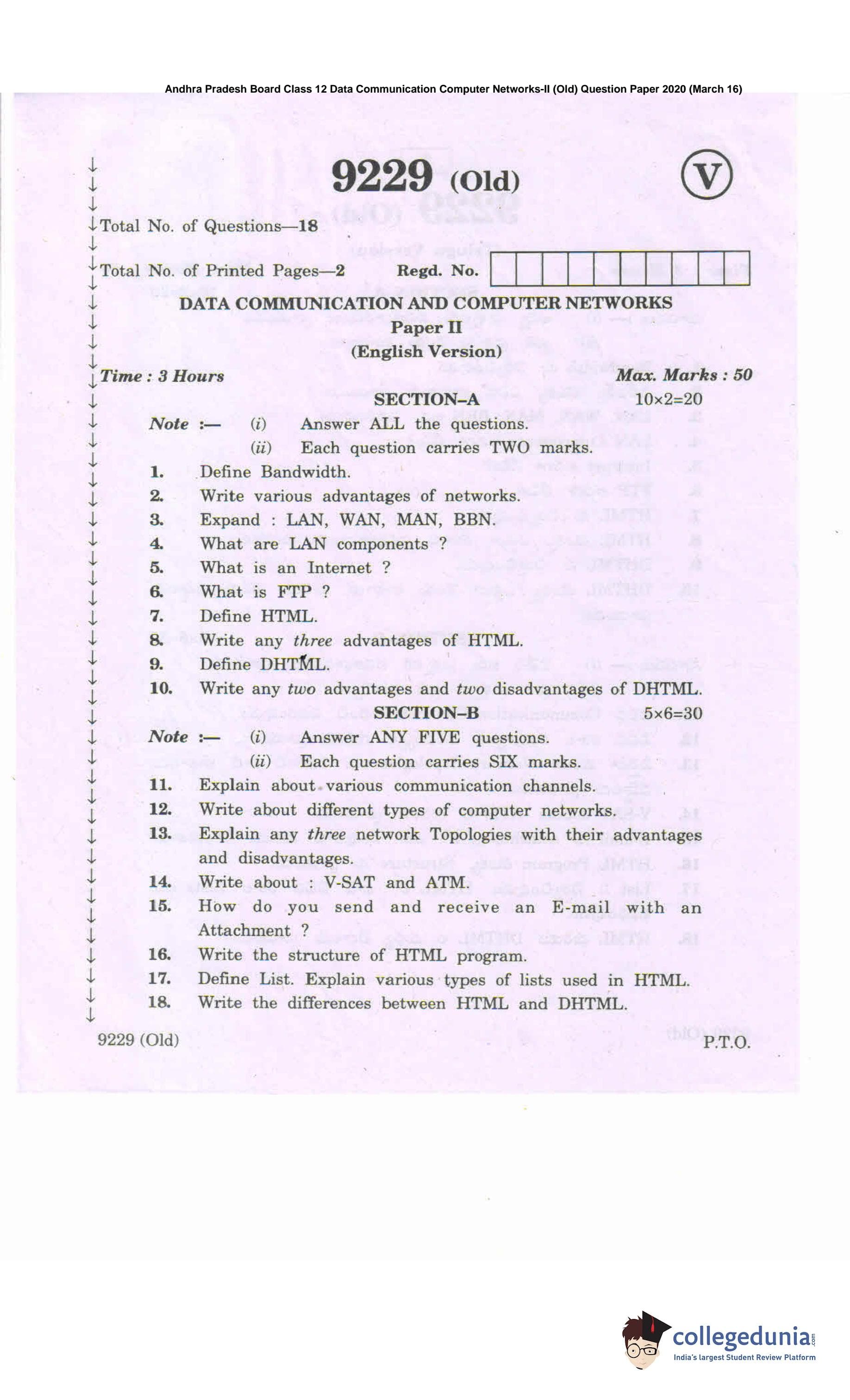 AP Intermediate 2nd year Data Communication Computer Networks (Old) Question Paper 2020 with Answer Key (March 16)
