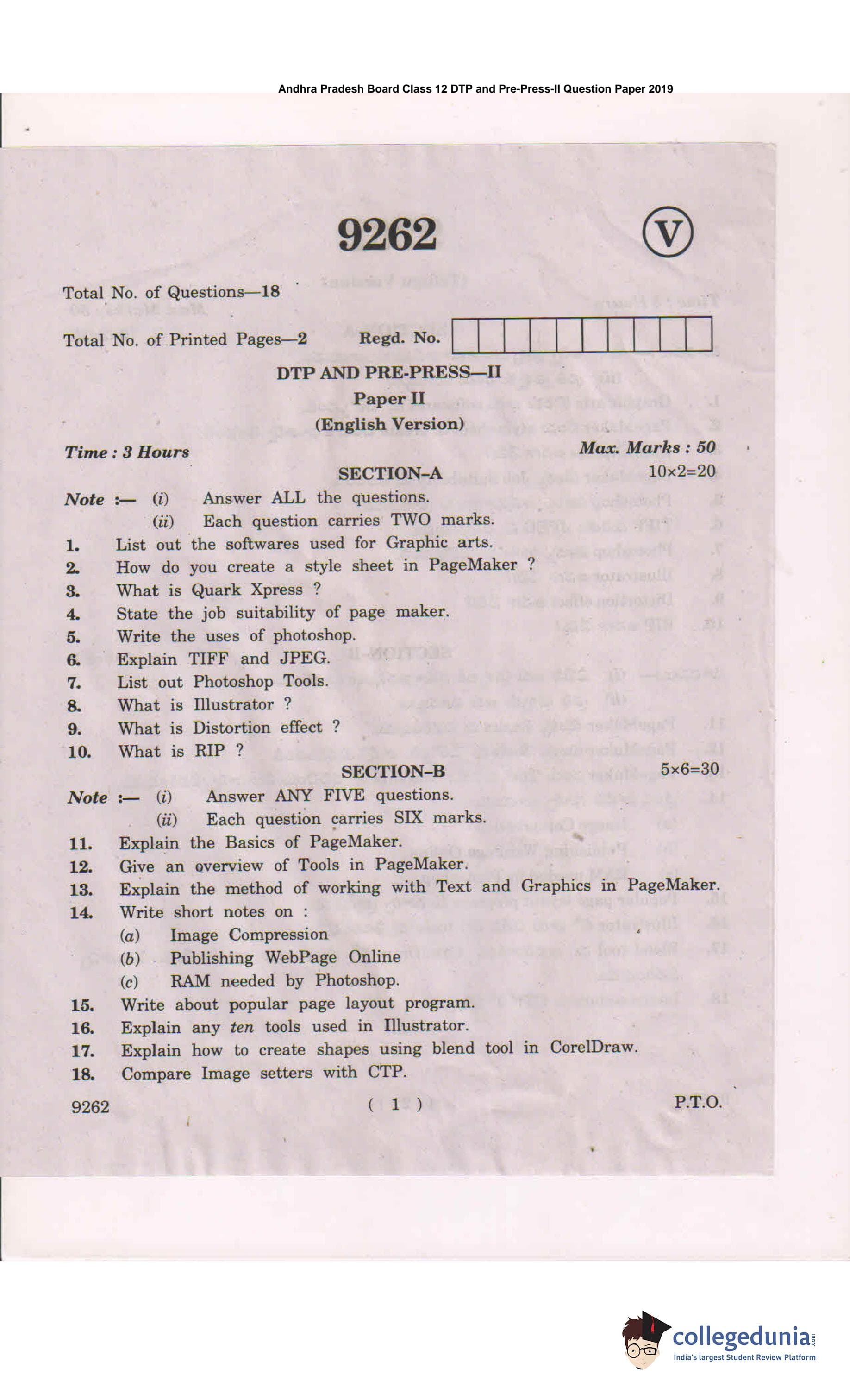 AP Intermediate 2nd year DTP and Pre-Press Question Paper 2019 with Answer Key is available for download. The exam was conducted by the Andhra Pradesh Board of Intermediate Education (APBIE) . The medium of paper was English and Telugu.The question paper comprised a total of 18 questions divided among 2 sections.