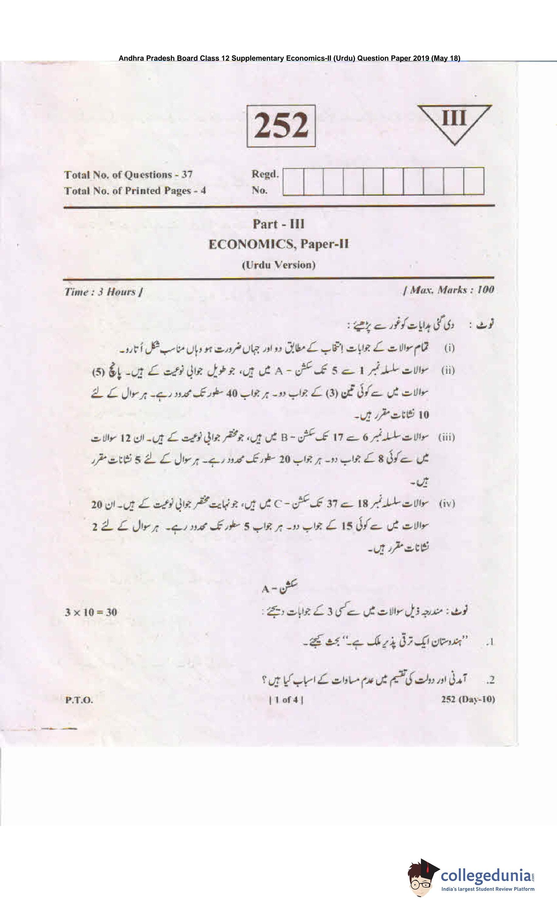 AP Intermediate 2nd year Economics (Urdu) 252 Supplementary Question Paper 2019 (May 18)