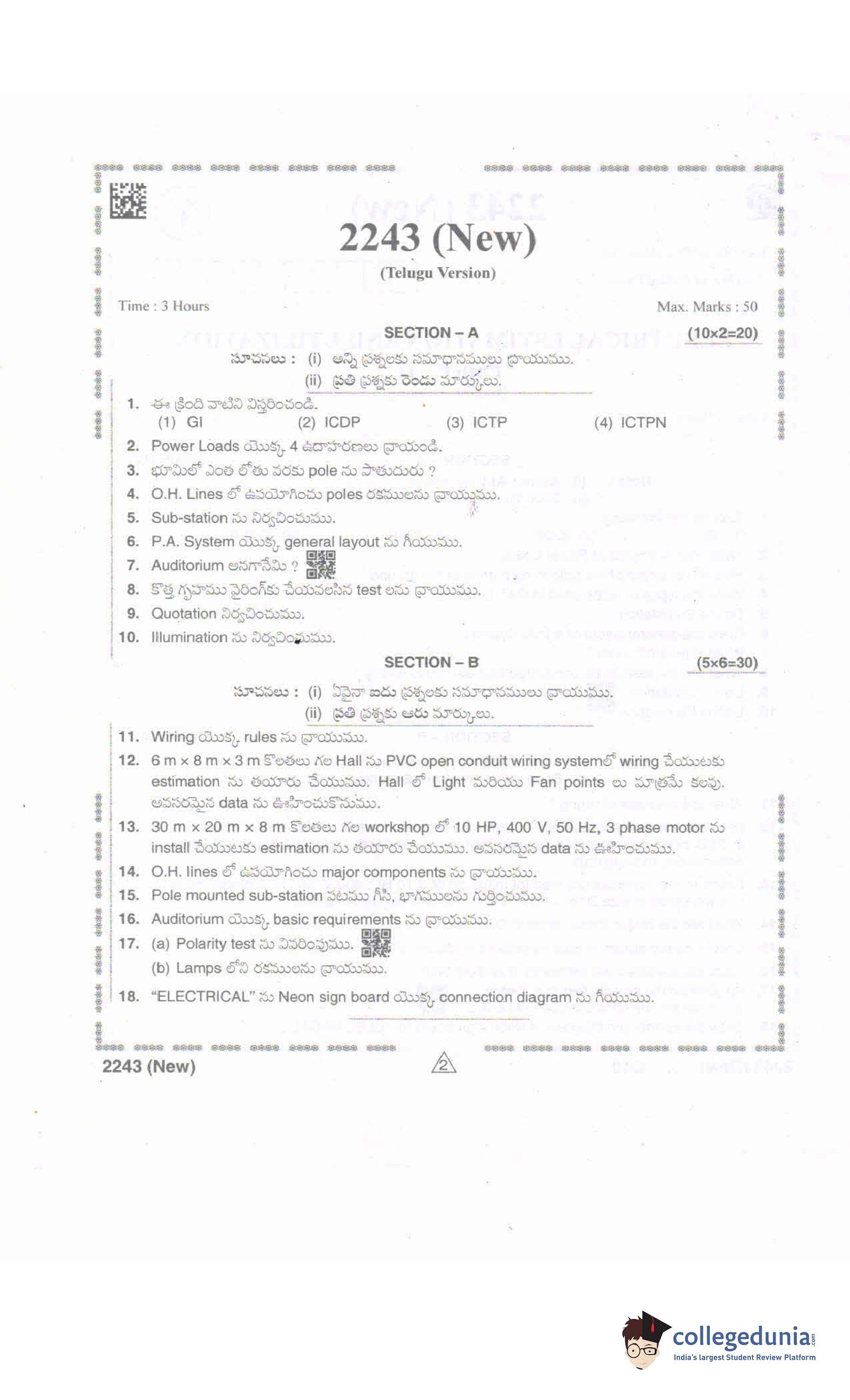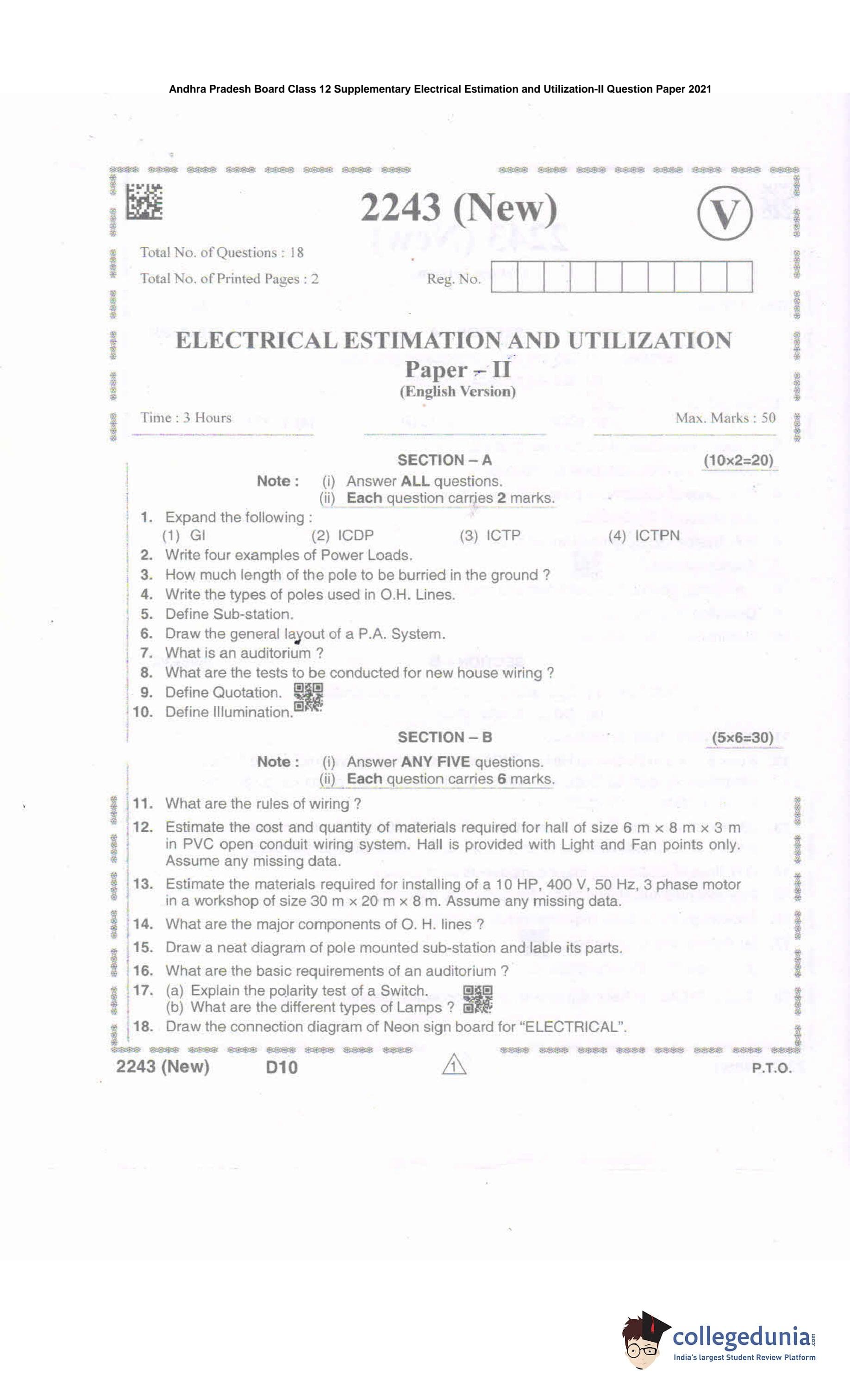 AP Intermediate 2nd year Electrical Estimation and Utilization Supplementary Question Paper 2021 with Answer Key is available for download. The exam was conducted by the Andhra Pradesh Board of Intermediate Education (APBIE) . The medium of paper was English and Telugu. The question paper comprised a total of 18 questions divided among 2 sections.