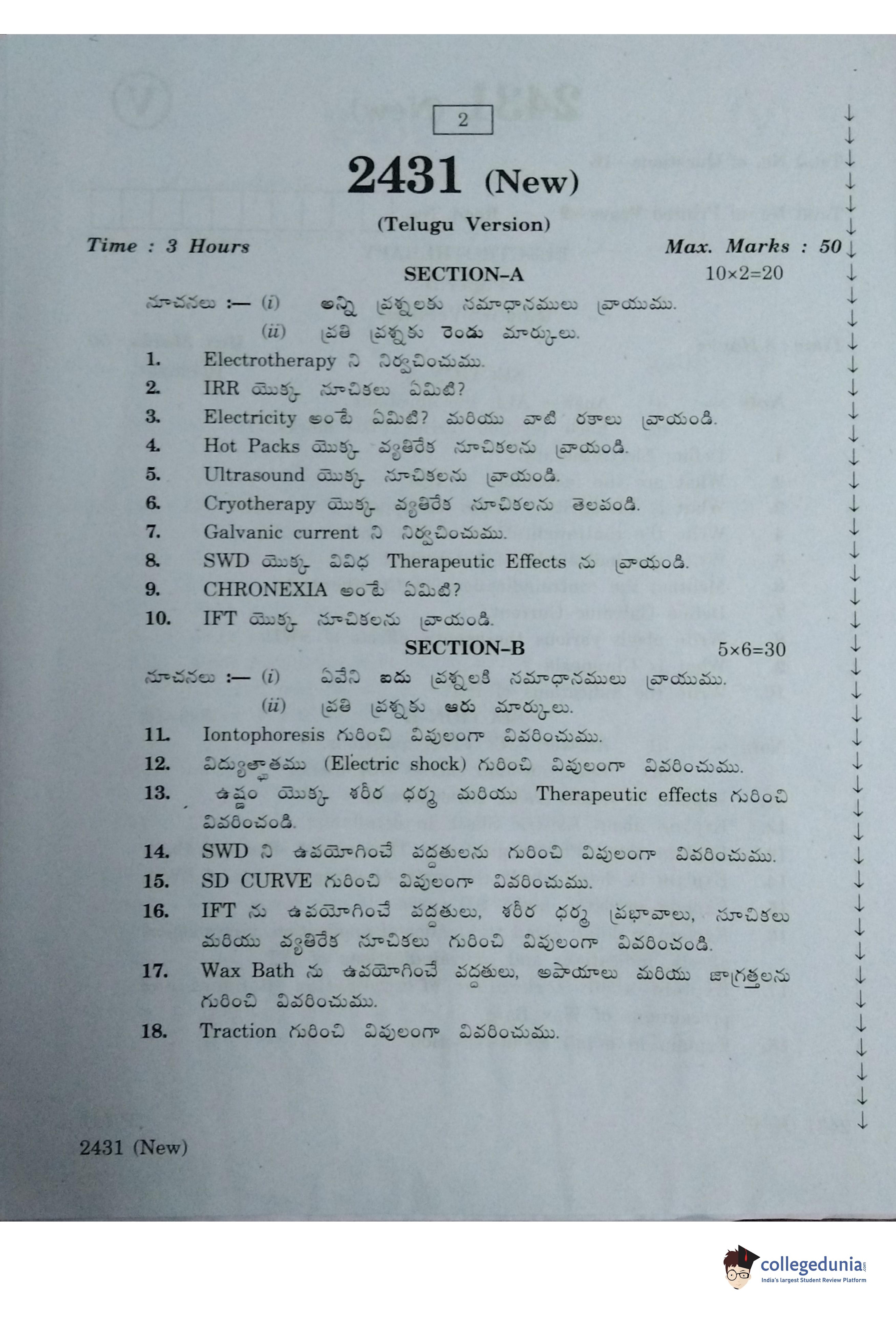 AP Intermediate 2nd year Electro Therapy (New) Question Paper 2020 with Answer Key is available for download. The exam was conducted by the Andhra Pradesh Board of Intermediate Education (APBIE) on March 16, 2020 in the Morning Session 9 AM to 12 PM. The medium of paper was English and Telugu. The question paper comprised a total of 18 questions divided among 2 sections.