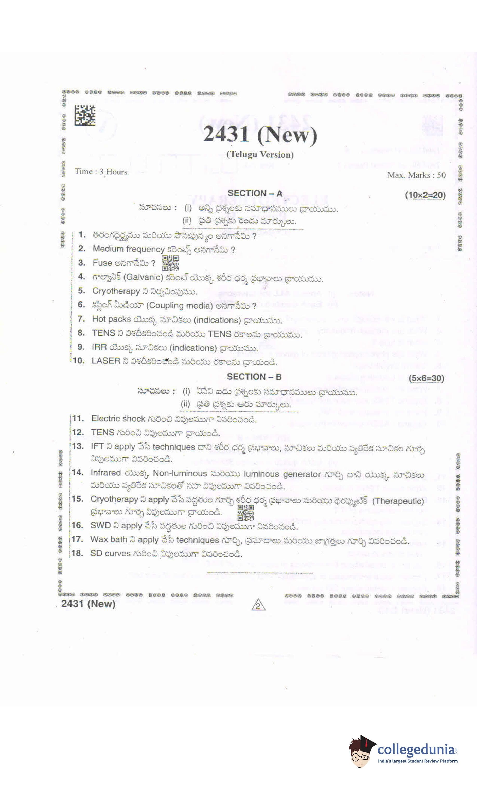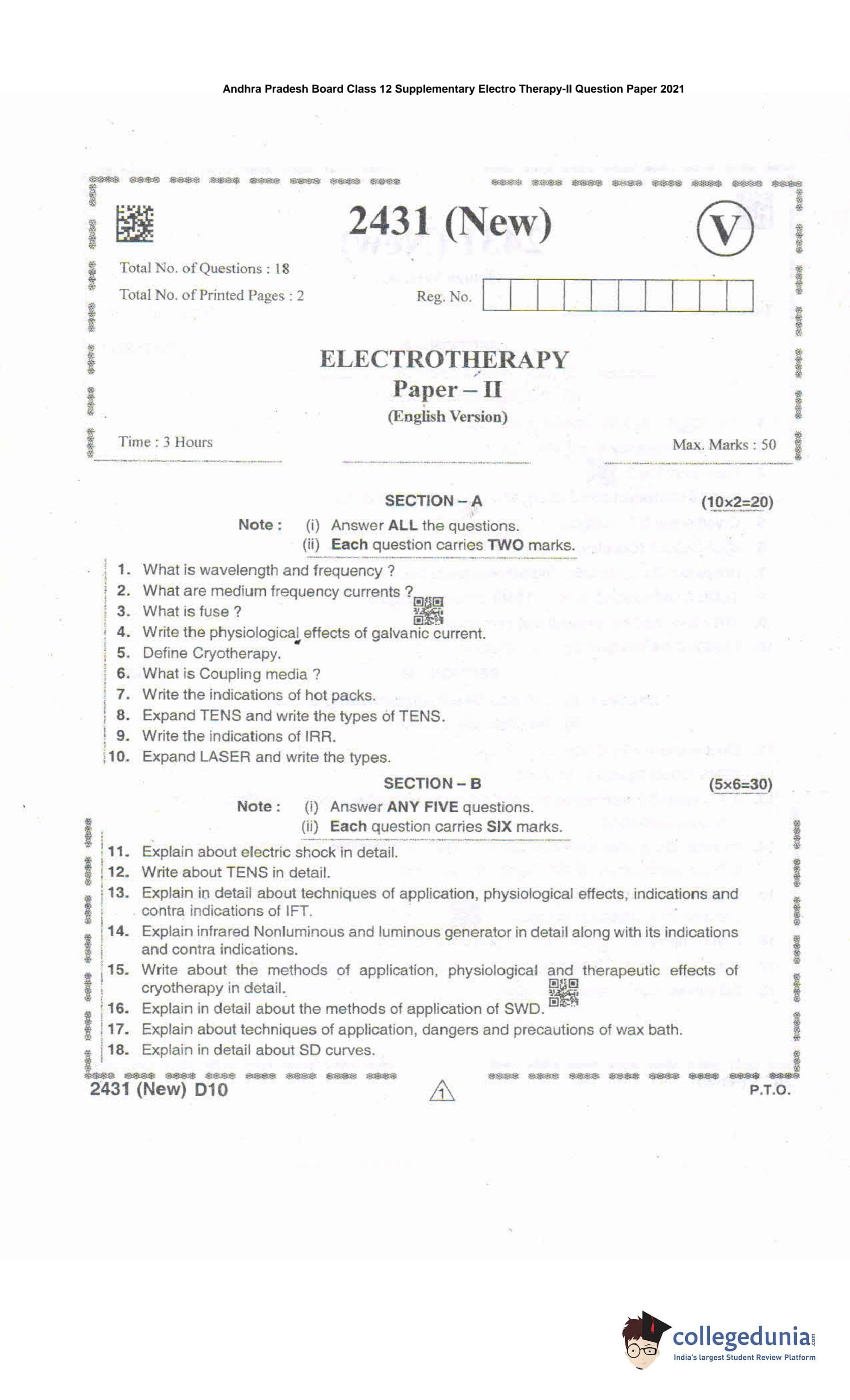 AP Intermediate 2nd year Electro Therapy Supplementary Question Paper 2021 with Answer Key is available for download. The exam was conducted by the Andhra Pradesh Board of Intermediate Education (APBIE). The medium of paper was English and Telugu. The question paper comprised a total of 18 questions divided among 2 sections.