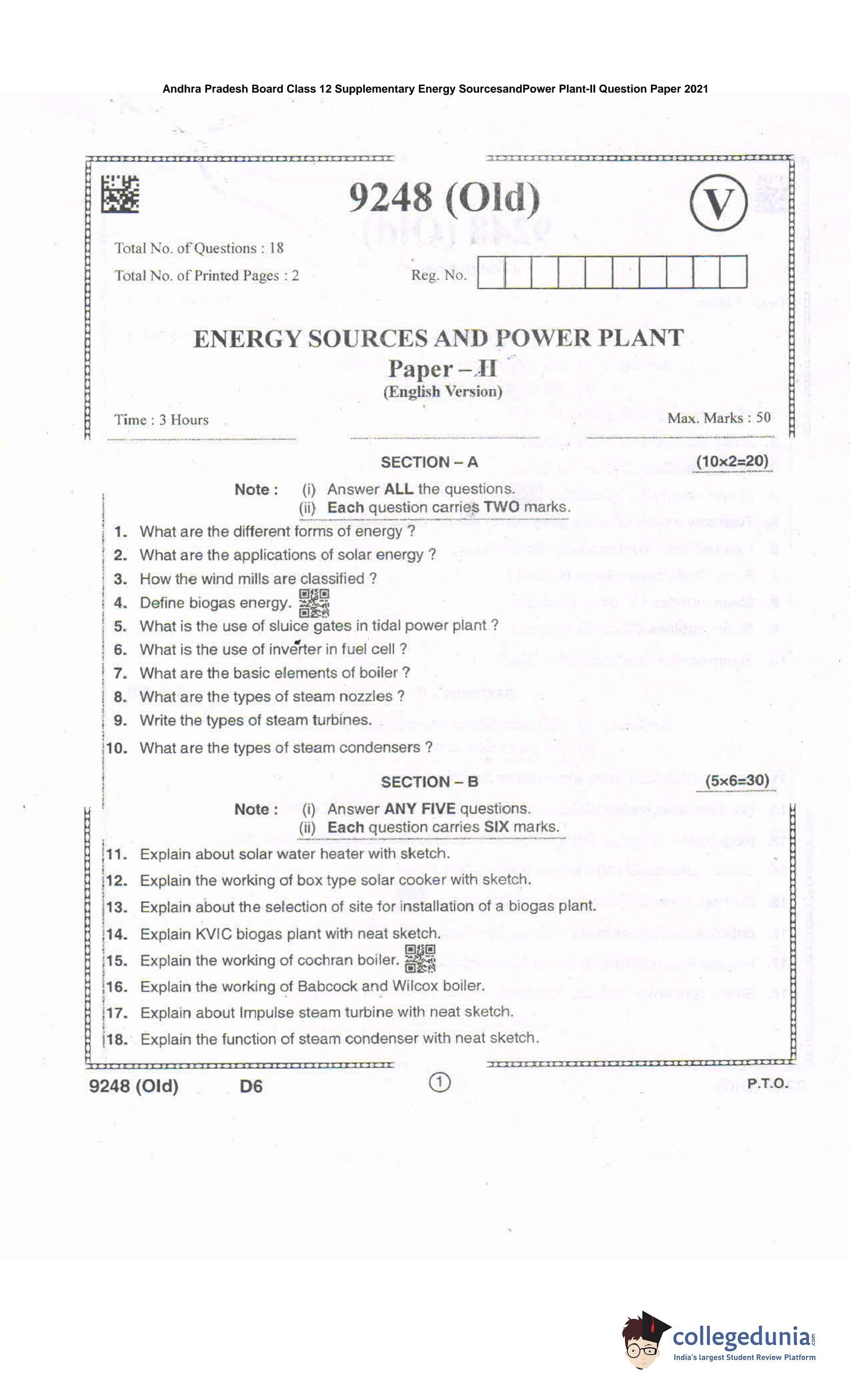 AP Intermediate 2nd year Energy Sources and Power Plant Supplementary Question Paper 2021 with Answer Key is available for download. The exam was conducted by the Andhra Pradesh Board of Intermediate Education (APBIE). The medium of paper was English and Telugu. The question paper comprised a total of 18 questions divided among 2 sections.
