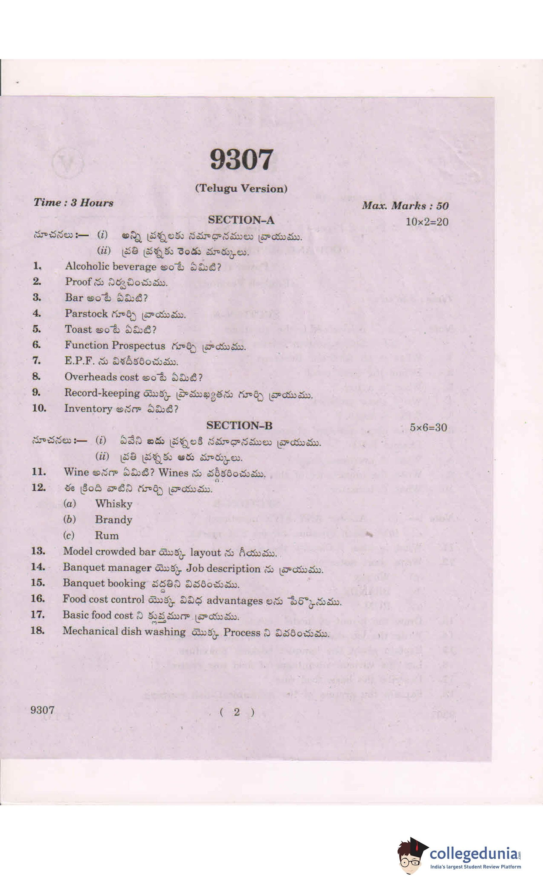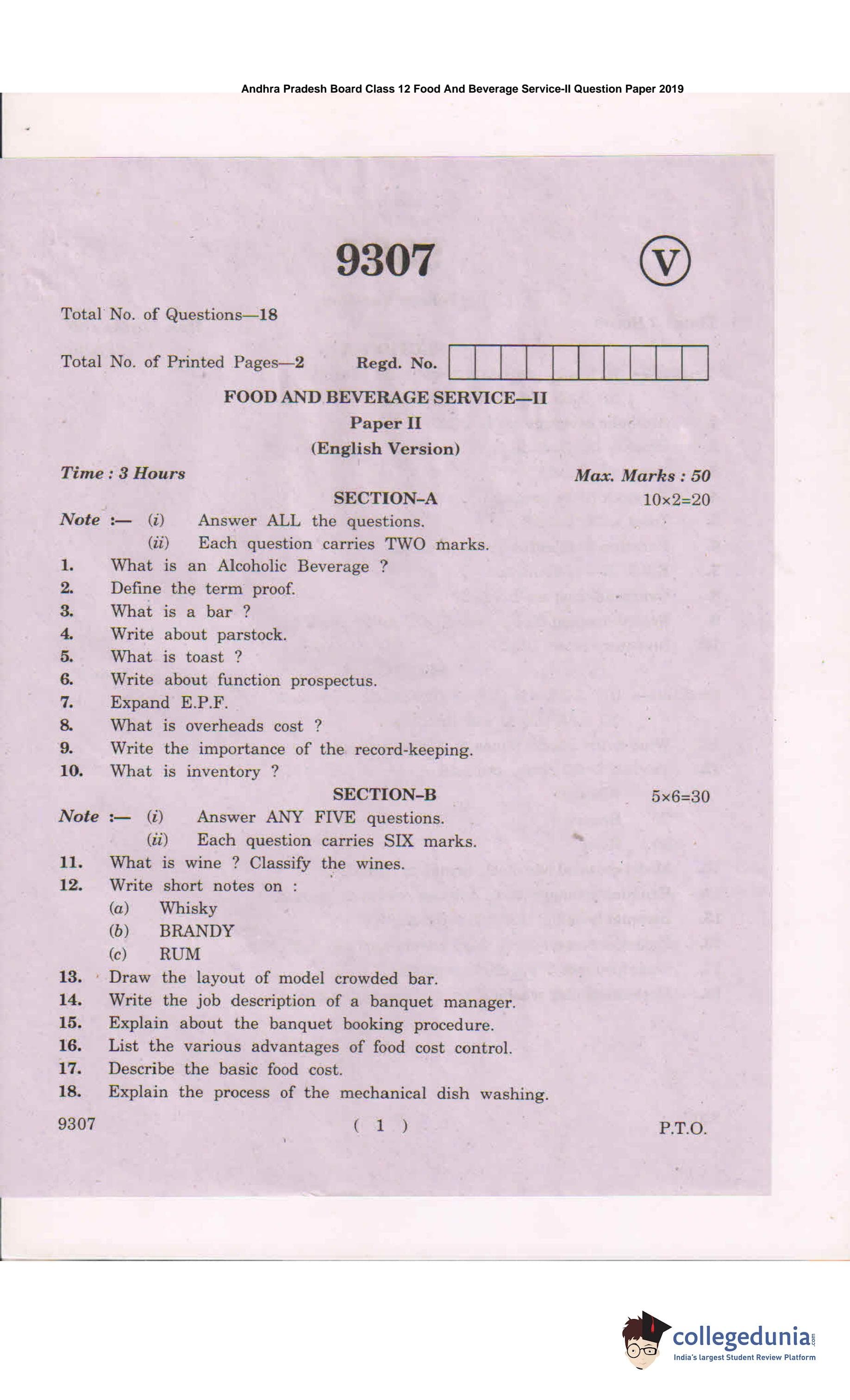 AP Intermediate 2nd year Food And Beverage Service Question Paper 2019 with Answer Key