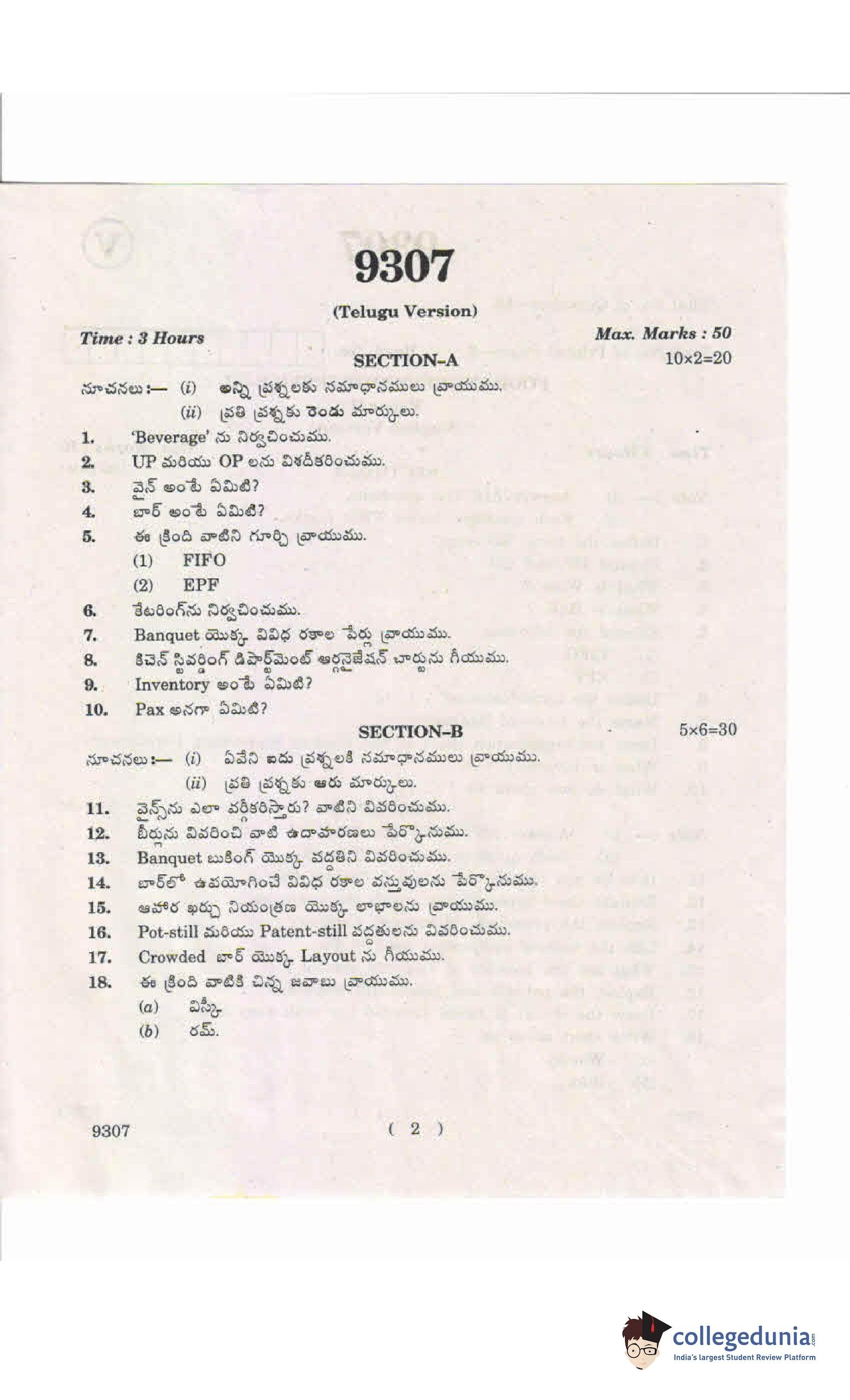 AP Intermediate 2nd year Food and Beverage Service Supplementary Question Paper 2019 with Answer Key 9307 is available for download. The exam was conducted by the Andhra Pradesh Board of Intermediate Education (APBIE). The medium of paper was English and Telugu. The question paper comprised a total of 18 questions divided among 2 sections.