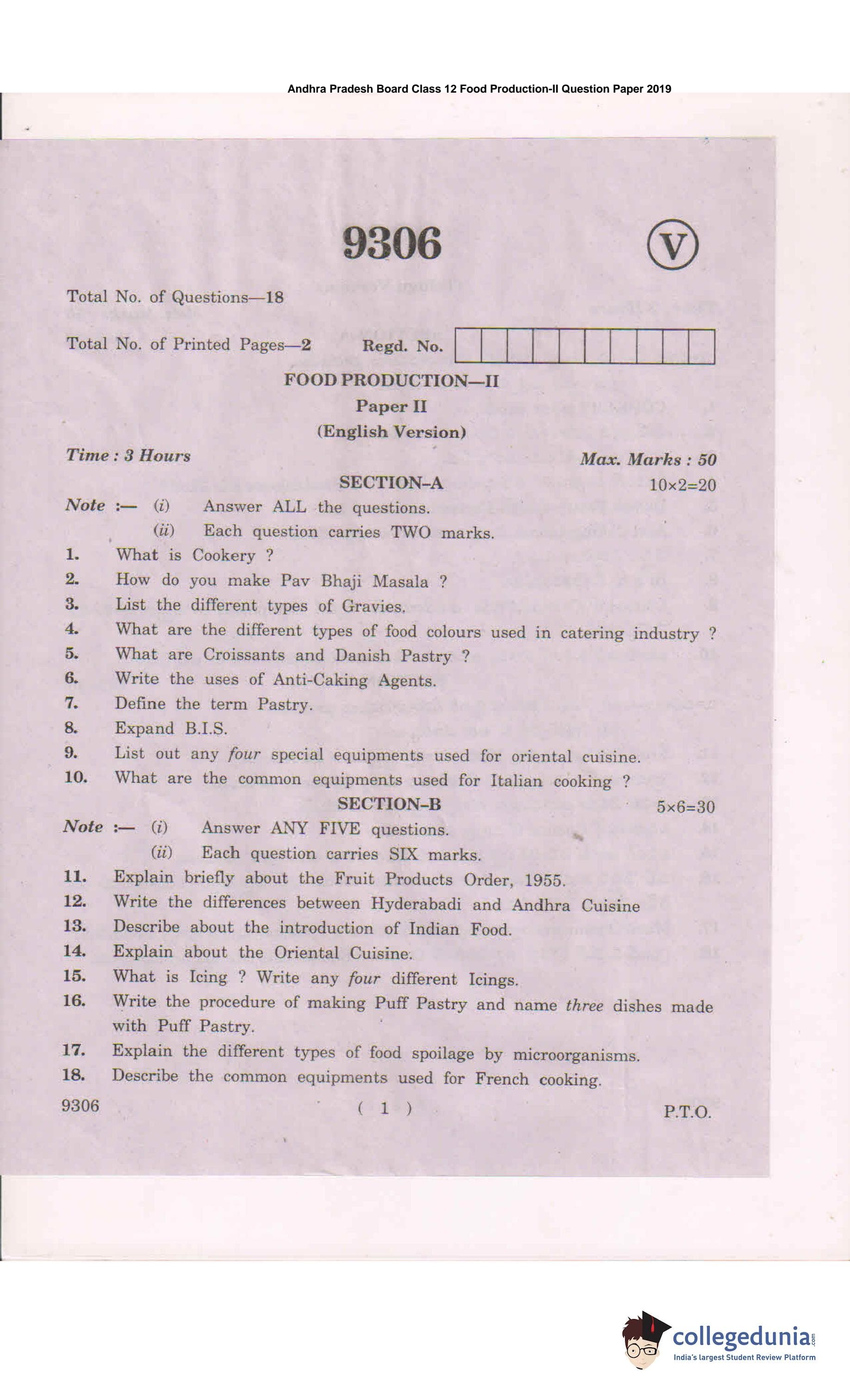 AP Intermediate 2nd year Food Production Question Paper 2019 with Answer Key is available for download. The exam was conducted by the Andhra Pradesh Board of Intermediate Education (APBIE) . The medium of paper was English and Telugu.The question paper comprised a total of 18 questions divided among 2 sections.