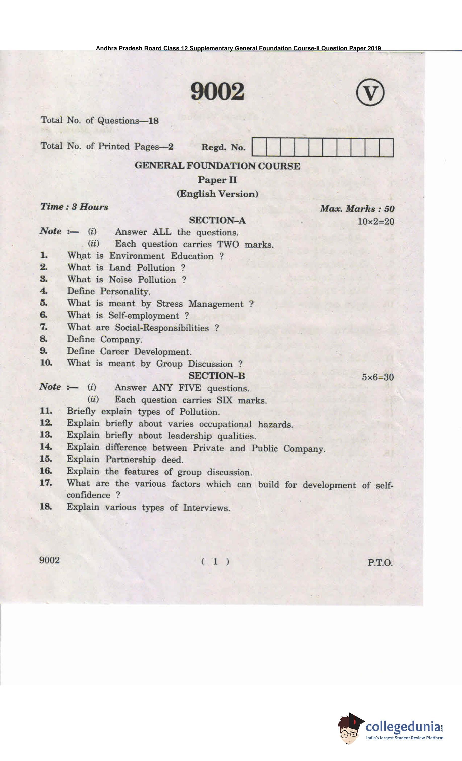 AP Intermediate 2nd year General Foundation Course Supplementary Question Paper 2019 with Answer Key 9002 is available for download. The exam was conducted by the Andhra Pradesh Board of Intermediate Education (APBIE). The medium of paper was English and Telugu. The question paper comprised a total of 18 questions divided among 2 sections.