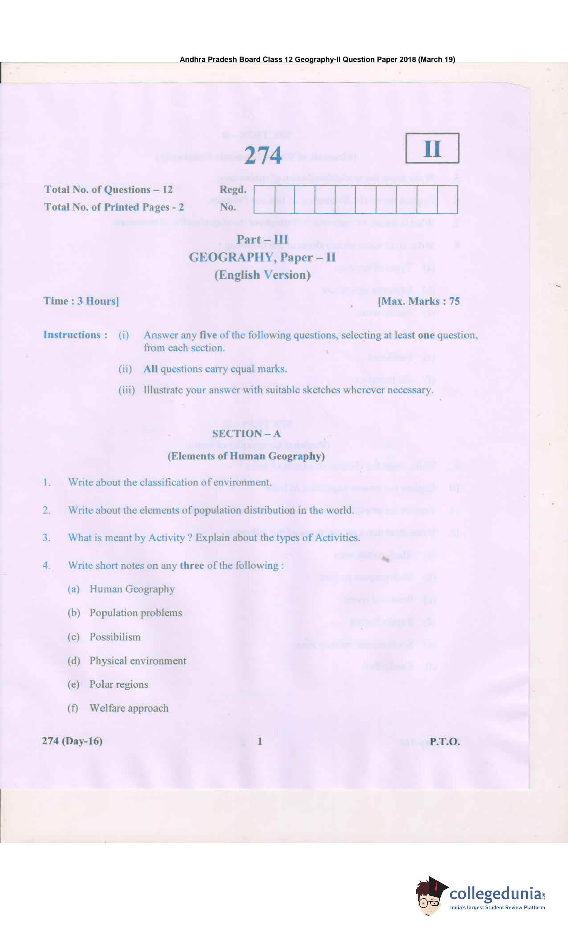 AP Intermediate 2nd year Geography Question Paper 2018 with Answer Key (March 19)