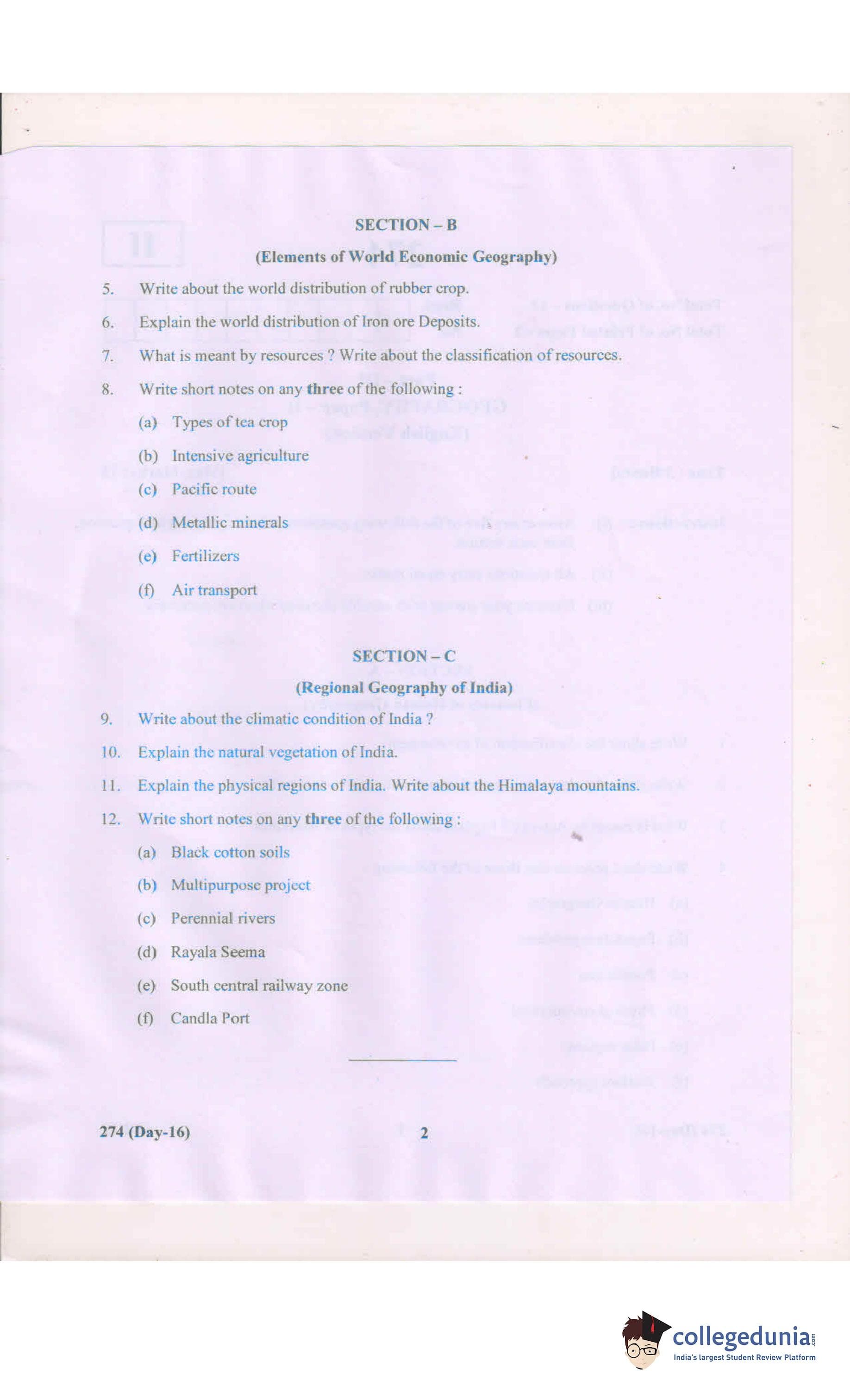 AP Intermediate 2nd year Geography Question Paper 2018 with Answer Key is available for download. The exam was conducted by the Andhra Pradesh Board of Intermediate Education (APBIE) on March 19, 2018 in the Morning Session 9 AM to 12 PM. The medium of paper was English.The question paper comprised a total of 12 questions divided among 3 sections.