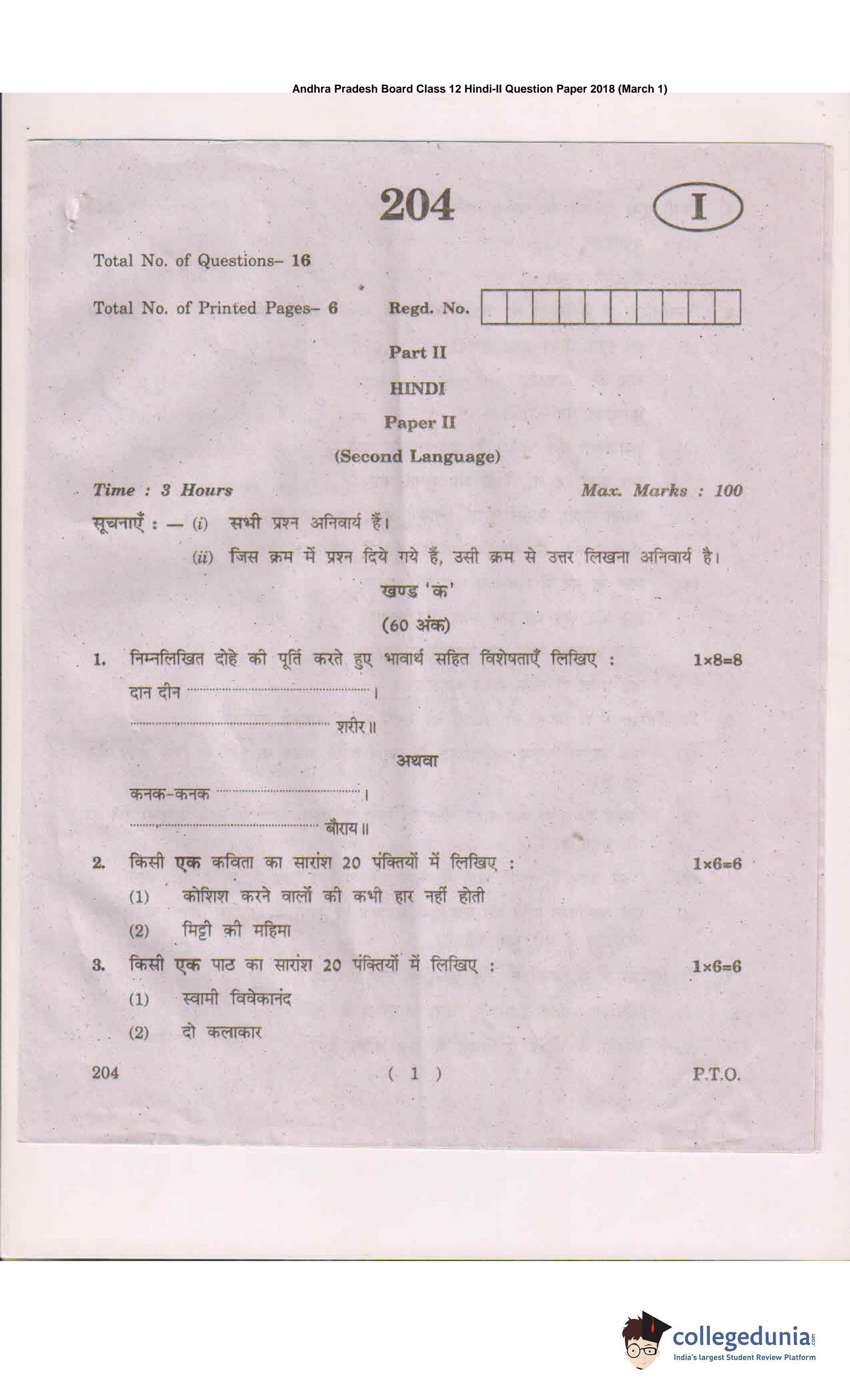 AP Intermediate 2nd year Hindi Question Paper 2018 with Answer Key (March 1)