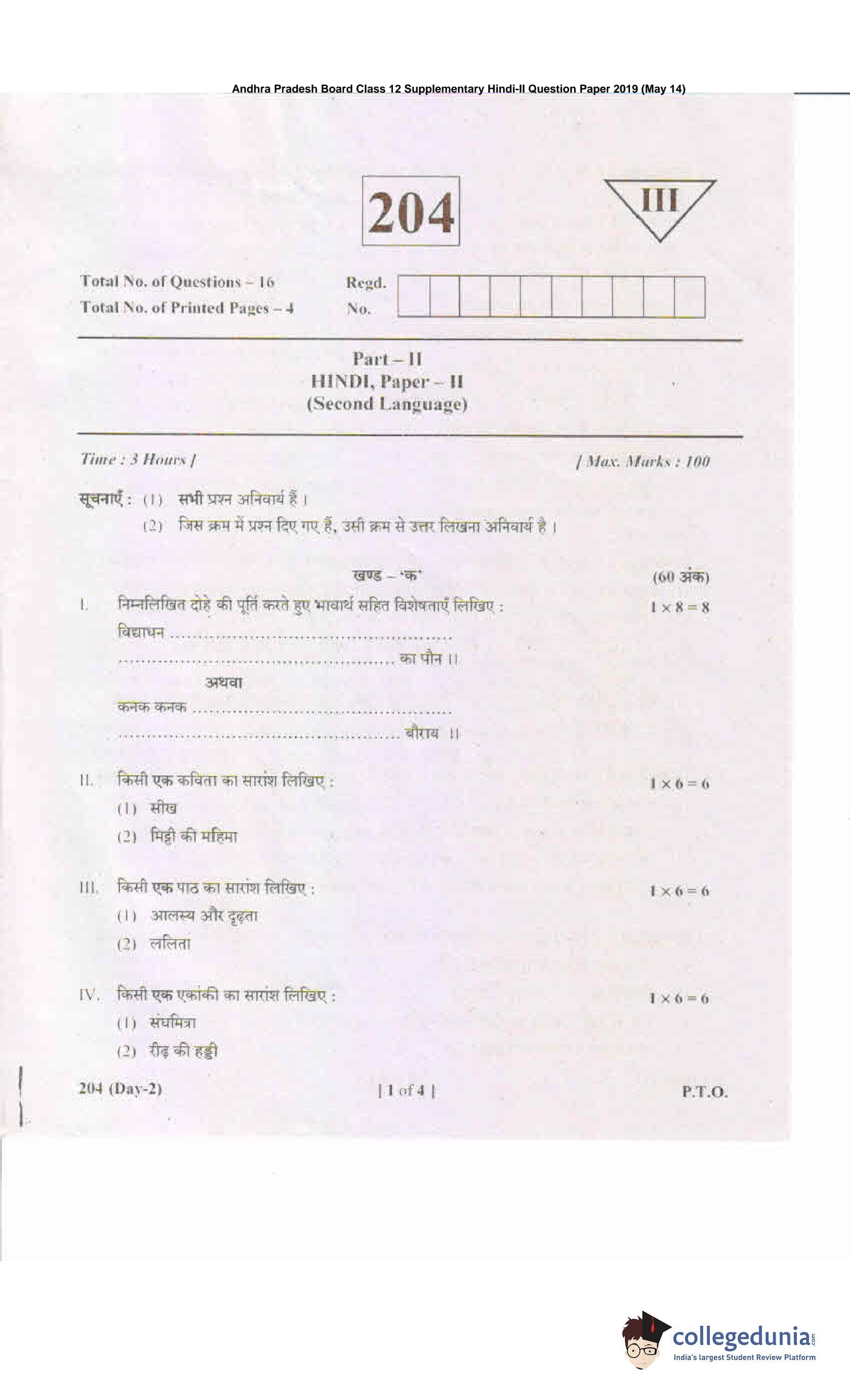 AP Intermediate 2nd year Hindi 204 Supplementary Question Paper 2019 (May 14)
