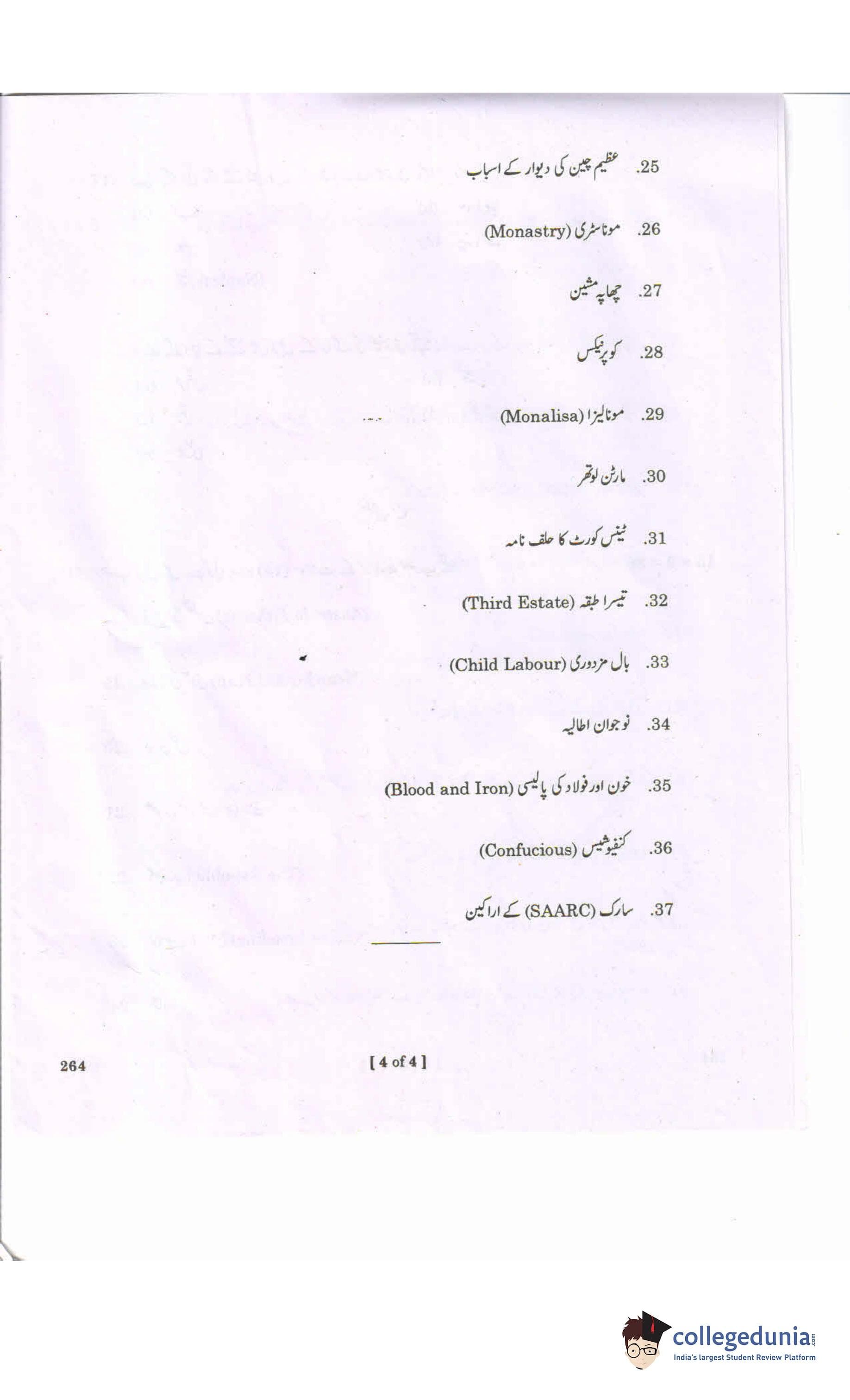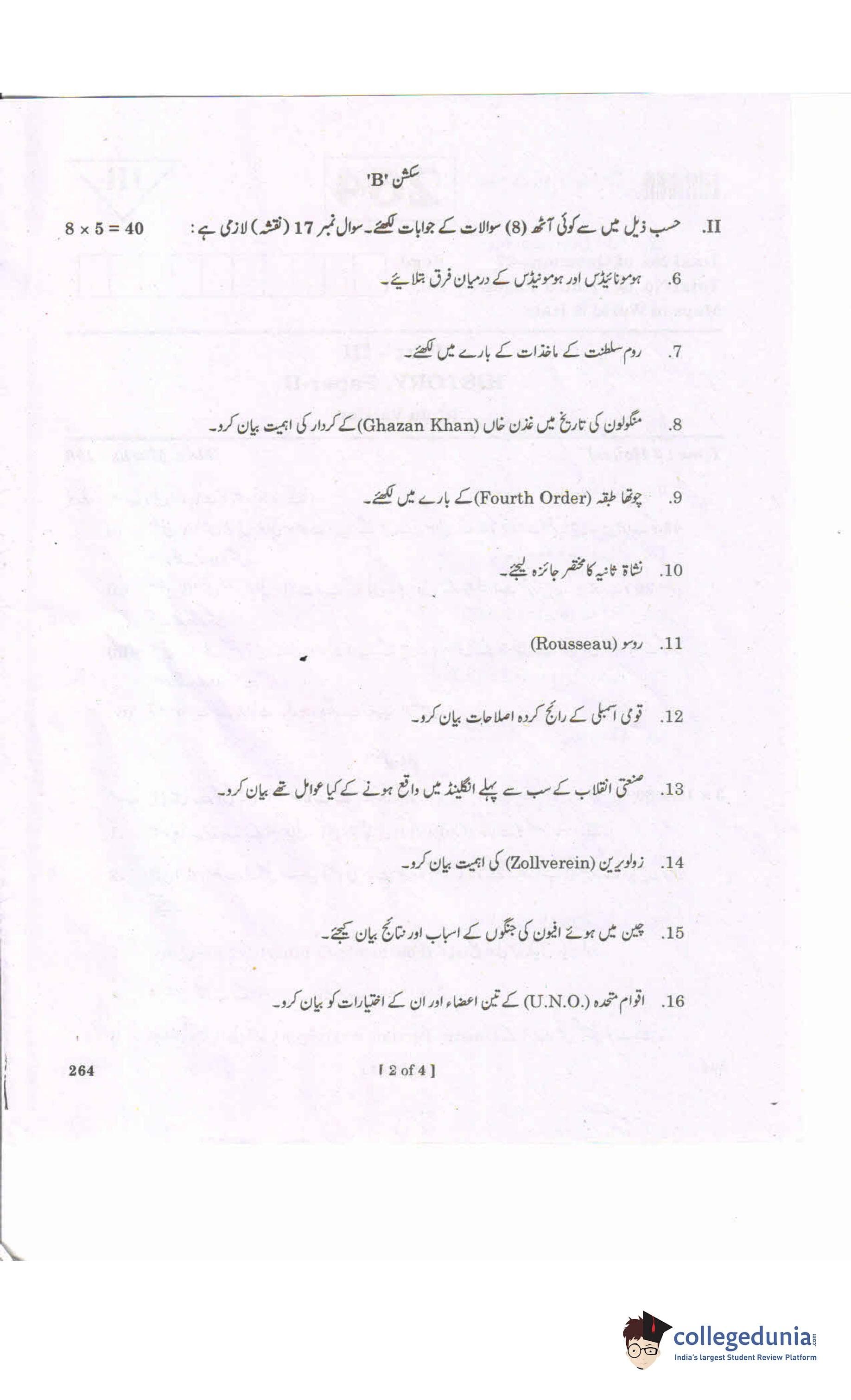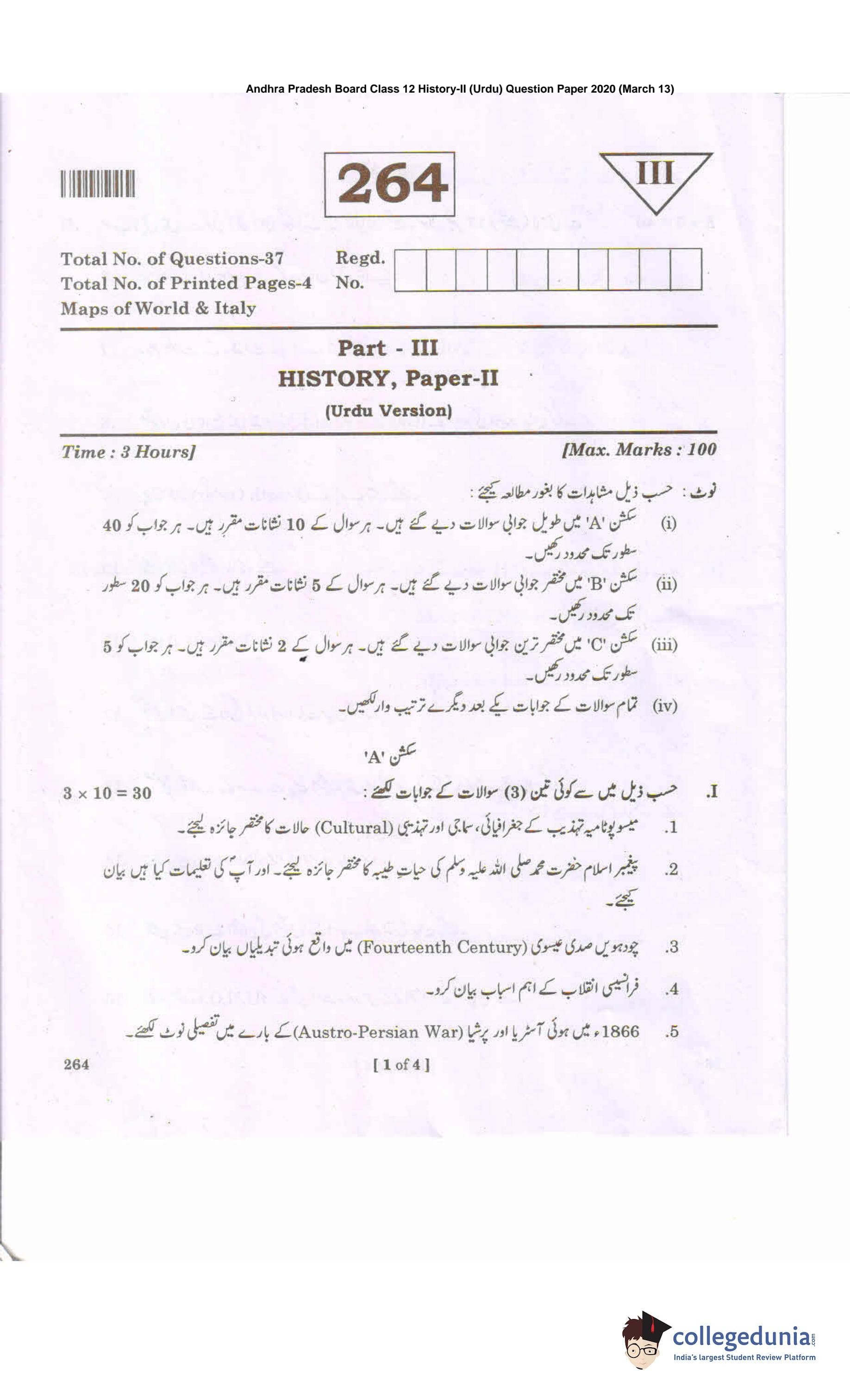AP Intermediate 2nd year History (Urdu) Question Paper 2020 with Answer Key 264 is available for download. The exam was conducted by the Andhra Pradesh Board of Intermediate Education (APBIE) on March 13, 2020 in the Morning Session 9 AM to 12 PM. The medium of paper was Urdu.The question paper comprised a total of 37 questions divided among 3 sections.