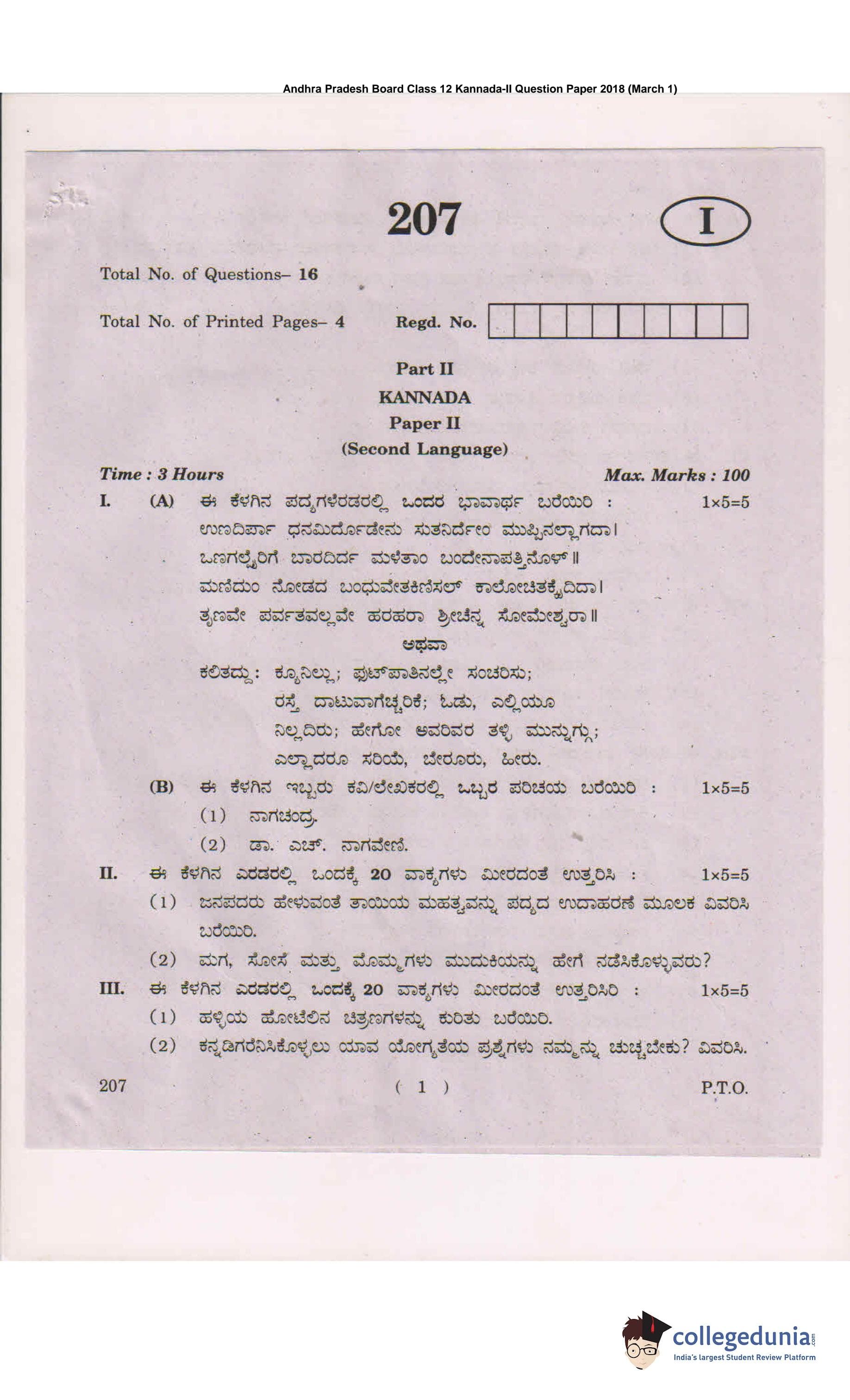 AP Intermediate 2nd year Kannada Question Paper 2018 with Answer Key (March 1)