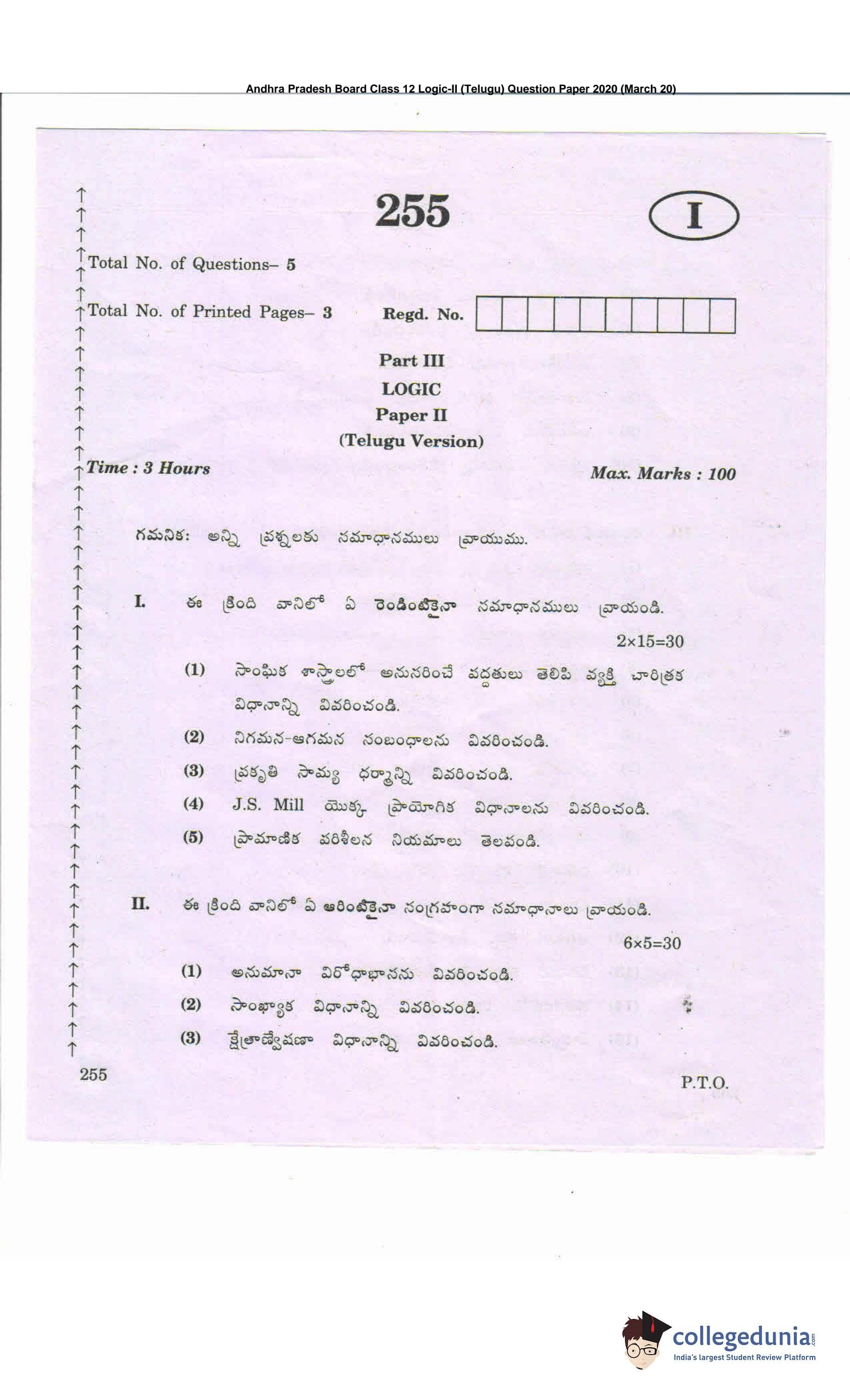 AP Intermediate 2nd year Logic (Telugu) Question Paper 2020 with Answer Key 255 is available for download. The exam was conducted by the Andhra Pradesh Board of Intermediate Education (APBIE) on March 20, 2020 in the Morning Session 9 AM to 12 PM. The medium of paper was Telugu.The question paper comprised a total of 5 questions.