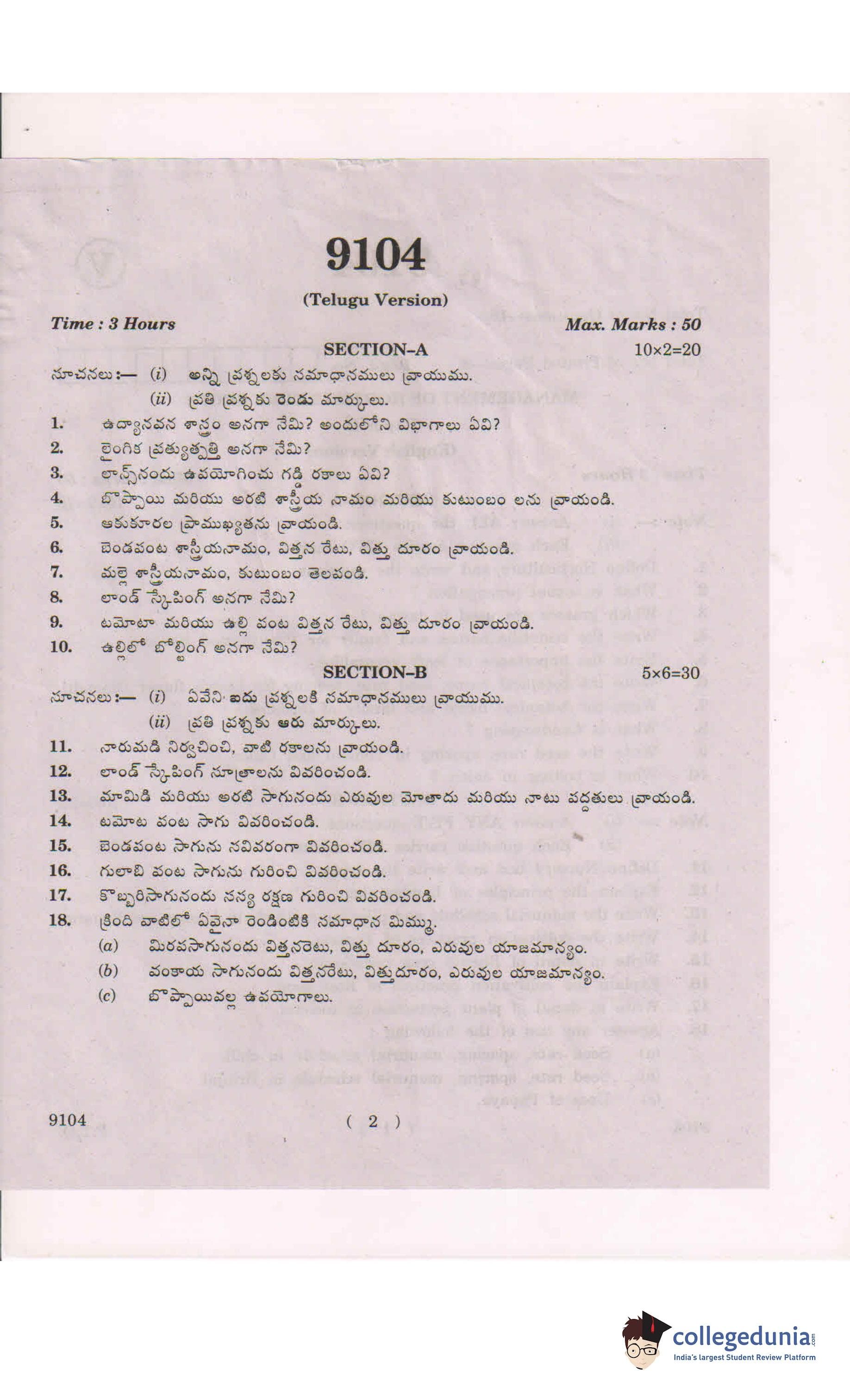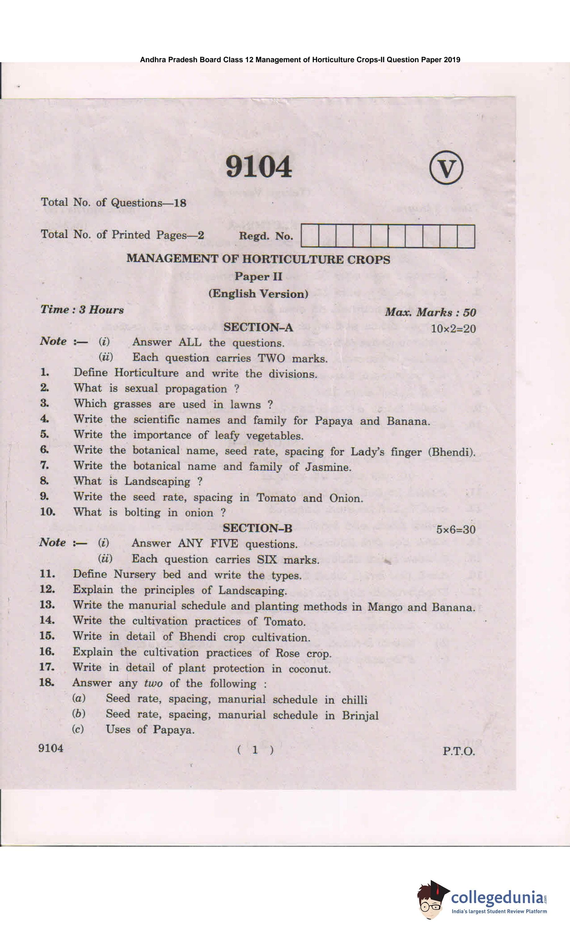 AP Intermediate 2nd year Management of Horticulture Crops Question Paper 2019 with Answer Key is available for download. The exam was conducted by the Andhra Pradesh Board of Intermediate Education (APBIE) . The medium of paper was English and Telugu.The question paper comprised a total of 18 questions divided among 2 sections.