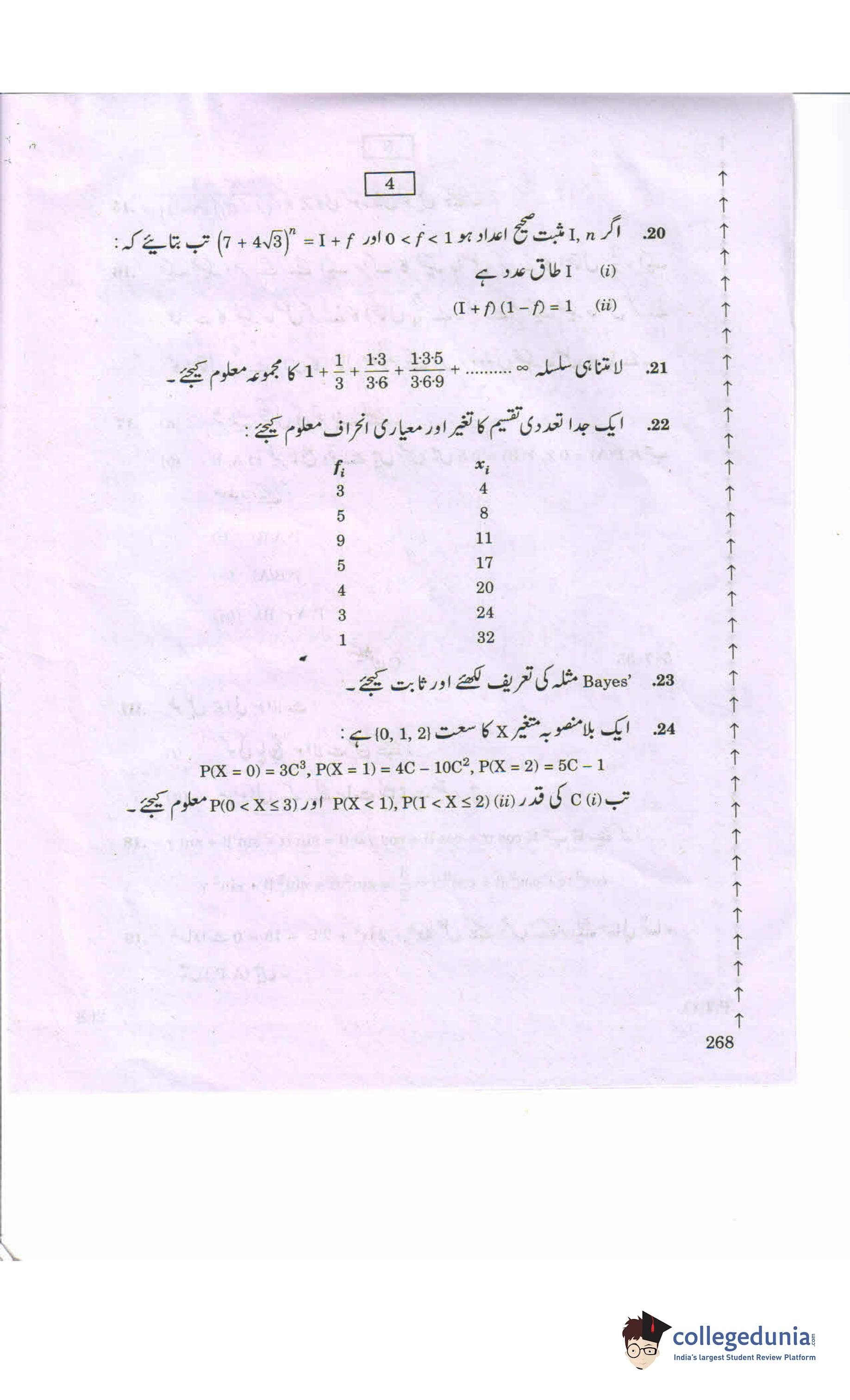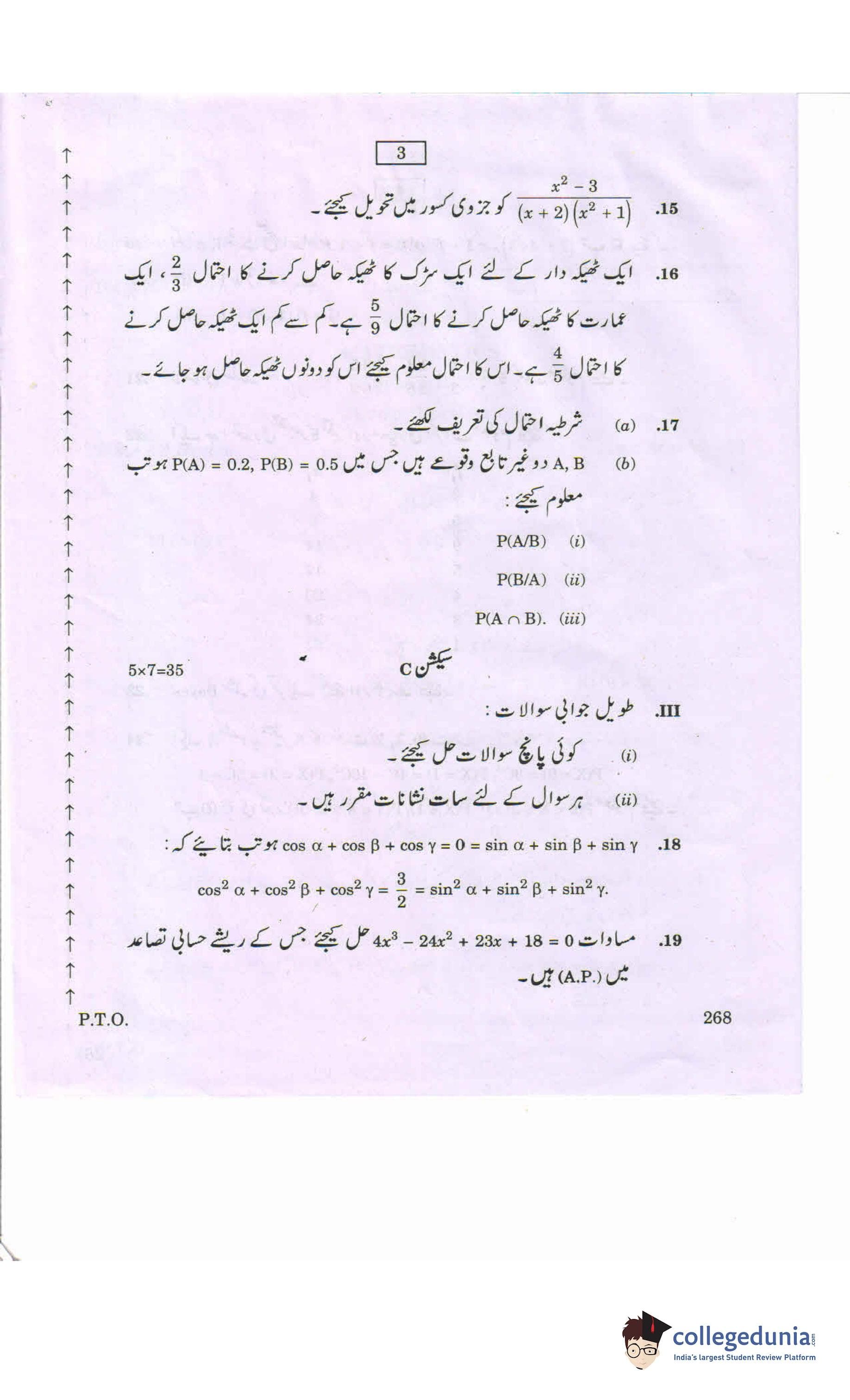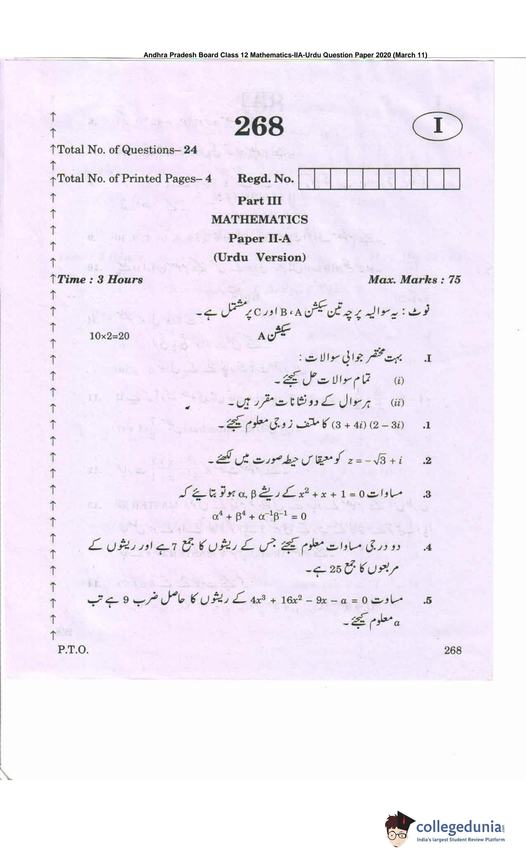 AP Intermediate 2nd year MathematicsA-Urdu Question Paper 2020 with Answer Key 268 is available for download. The exam was conducted by the Andhra Pradesh Board of Intermediate Education (APBIE) on March 11, 2020 in the Morning Session 9 AM to 12 PM. The medium of paper was Urdu.The question paper comprised a total of 24 questions divided among 3 sections.