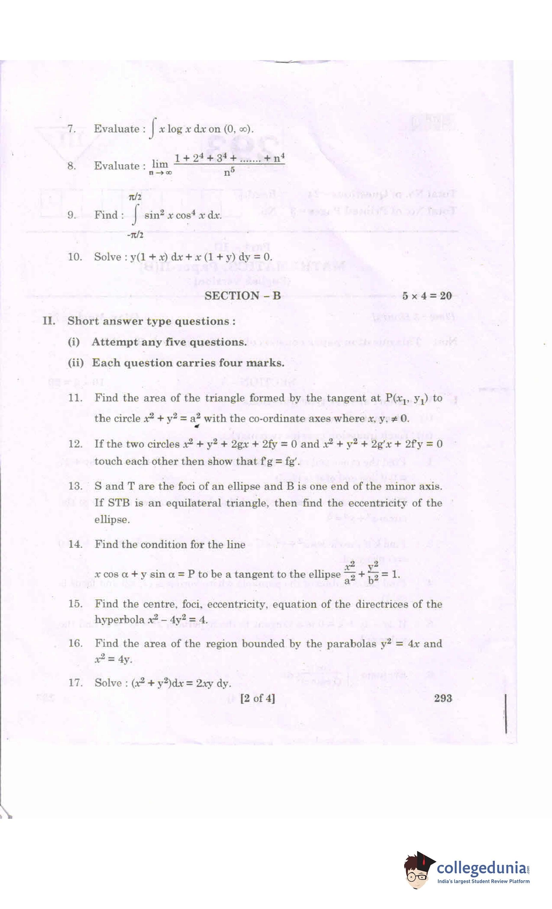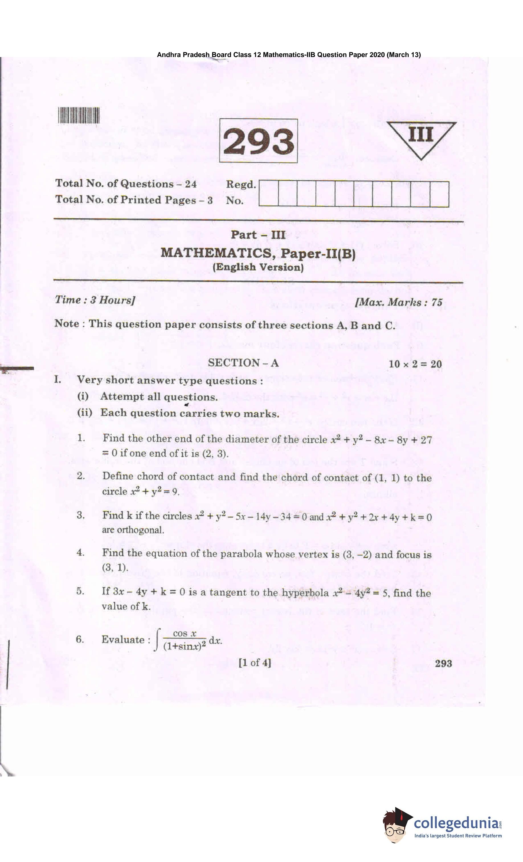 AP Intermediate 2nd year MathematicsB Question Paper 2020 with Answer Key 293 is available for download. The exam was conducted by the Andhra Pradesh Board of Intermediate Education (APBIE) on March 13, 2020 in the Morning Session 9 AM to 12 PM. The medium of paper was English.The question paper comprised a total of 24 questions divided among 3 sections.