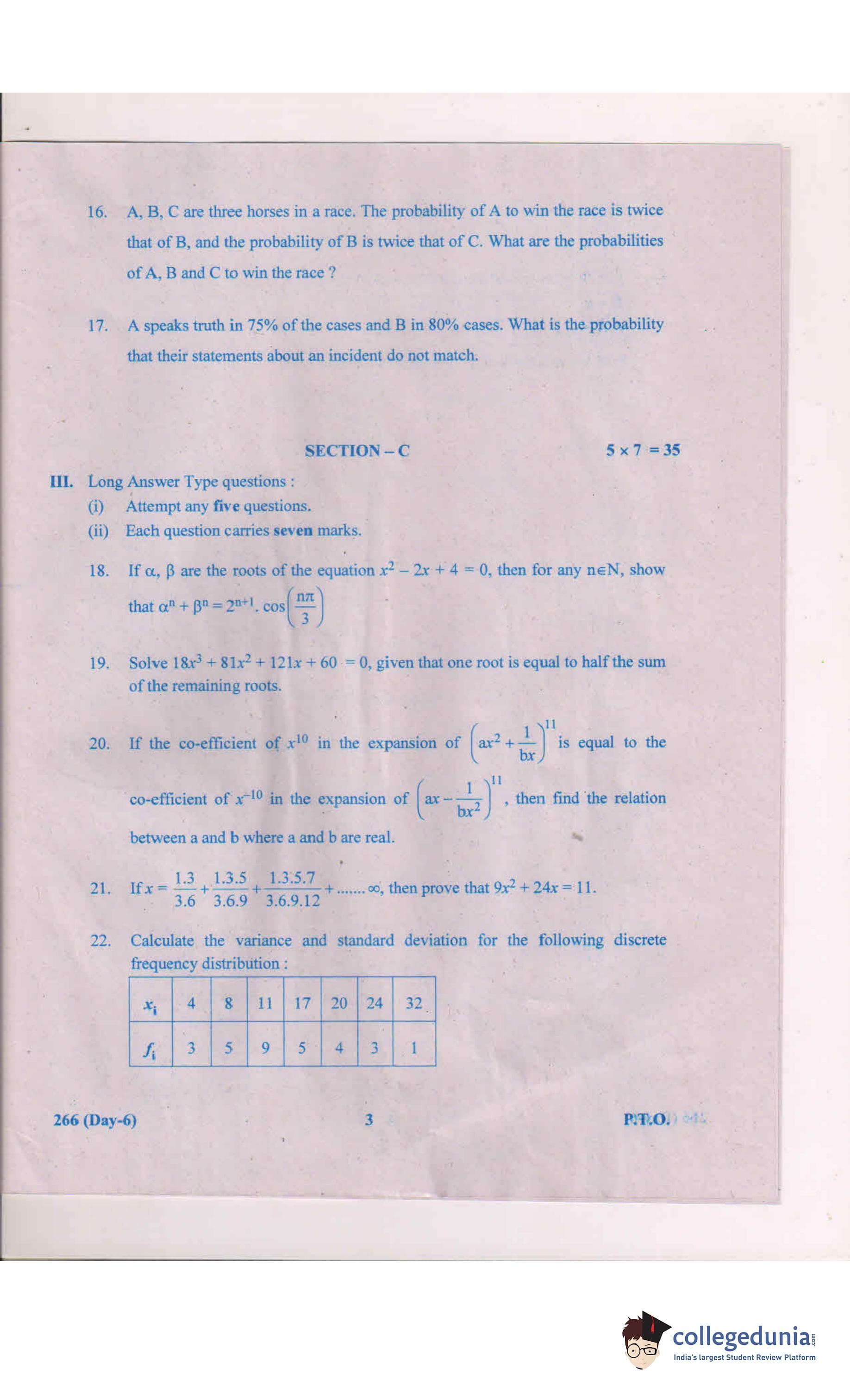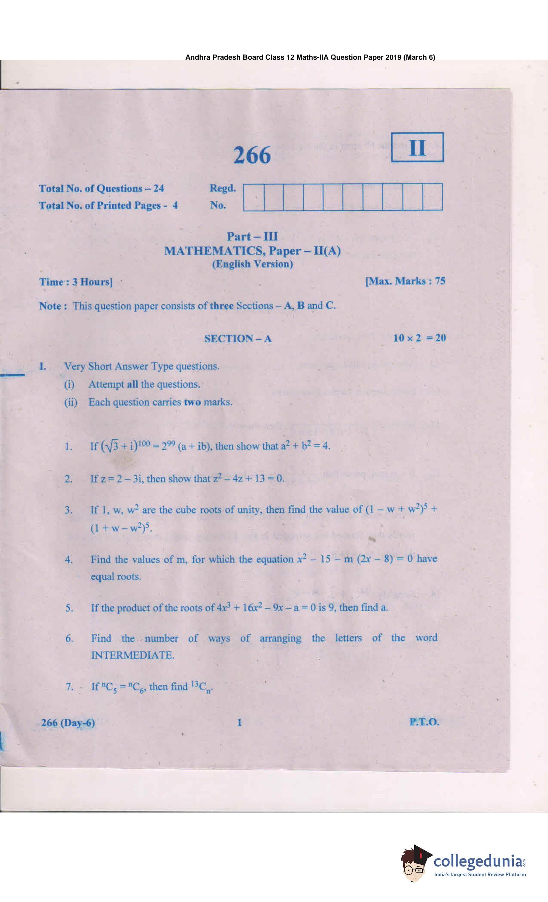 AP Intermediate 2nd year MathsA Question Paper 2019 with Answer Key 266 is available for download. The exam was conducted by the Andhra Pradesh Board of Intermediate Education (APBIE) on March 6, 2019 in the Morning Session 9 AM to 12 PM. The medium of paper was English.The question paper comprised a total of 24 questions divided among 3 sections.