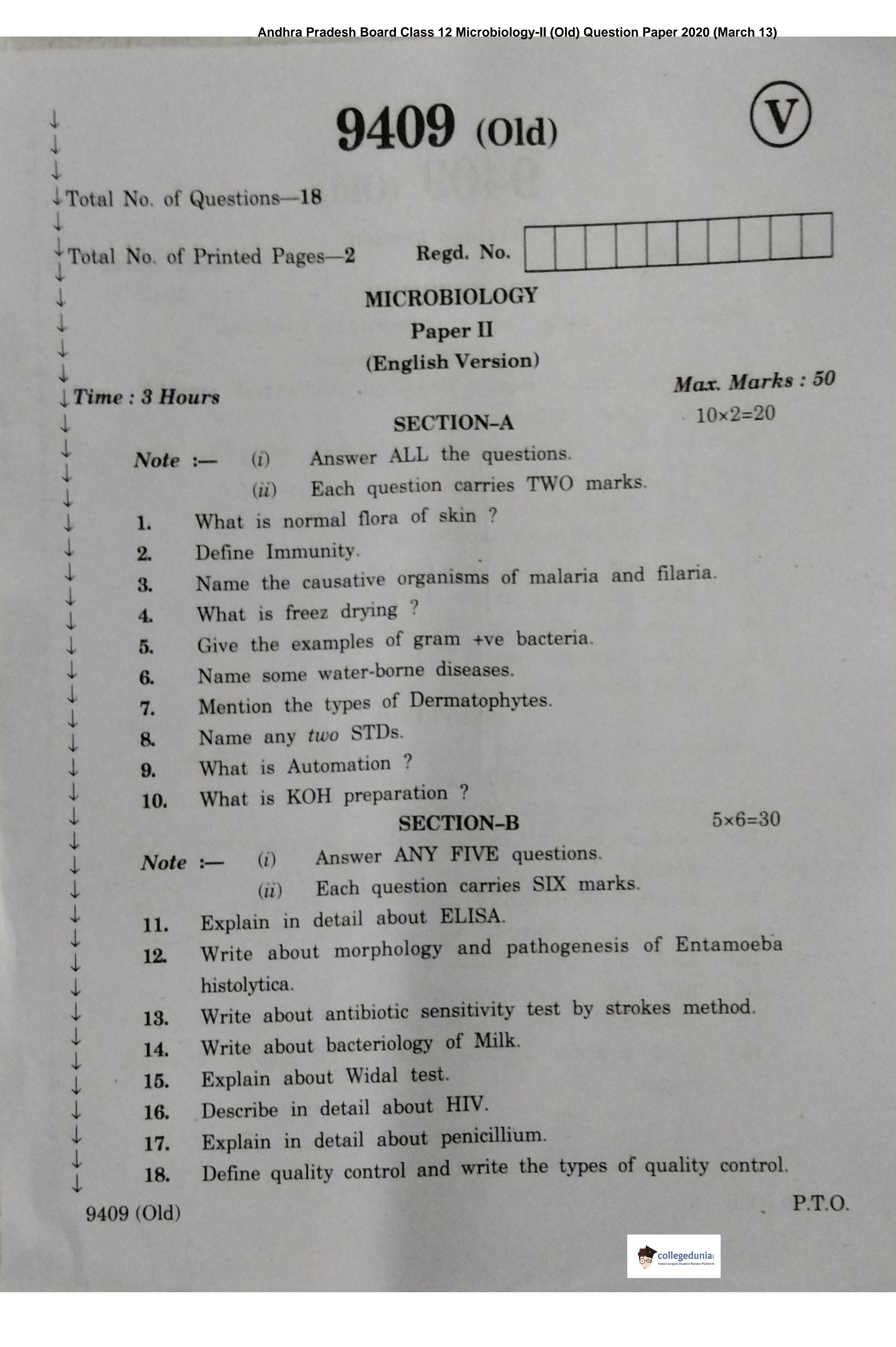 AP Intermediate 2nd year Microbiology (Old) Question Paper 2020 with Answer Key is available for download. The exam was conducted by the Andhra Pradesh Board of Intermediate Education (APBIE) on March 13, 2020 in the Morning Session 9 AM to 12 PM. The medium of paper was English and Telugu.The question paper comprised a total of 18 questions divided among 2 sections.