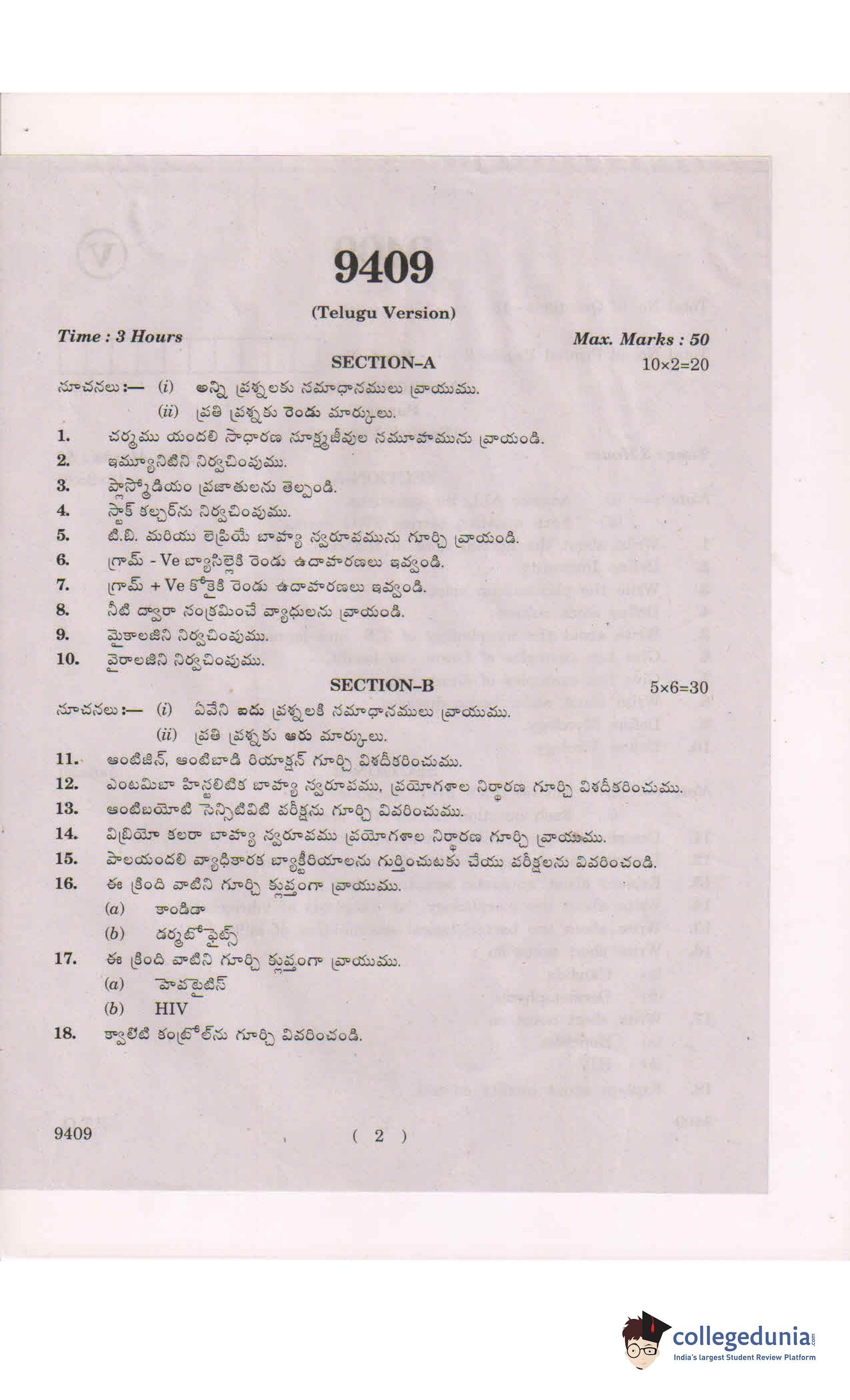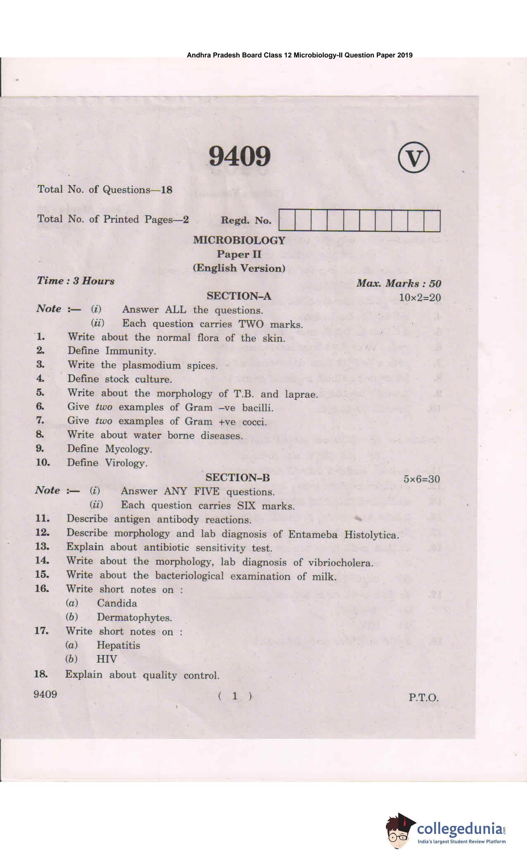 AP Intermediate 2nd year Microbiology Question Paper 2019 with Answer Key is available for download. The exam was conducted by the Andhra Pradesh Board of Intermediate Education (APBIE) . The medium of paper was English and Telugu.The question paper comprised a total of 18 questions divided among 2 sections.