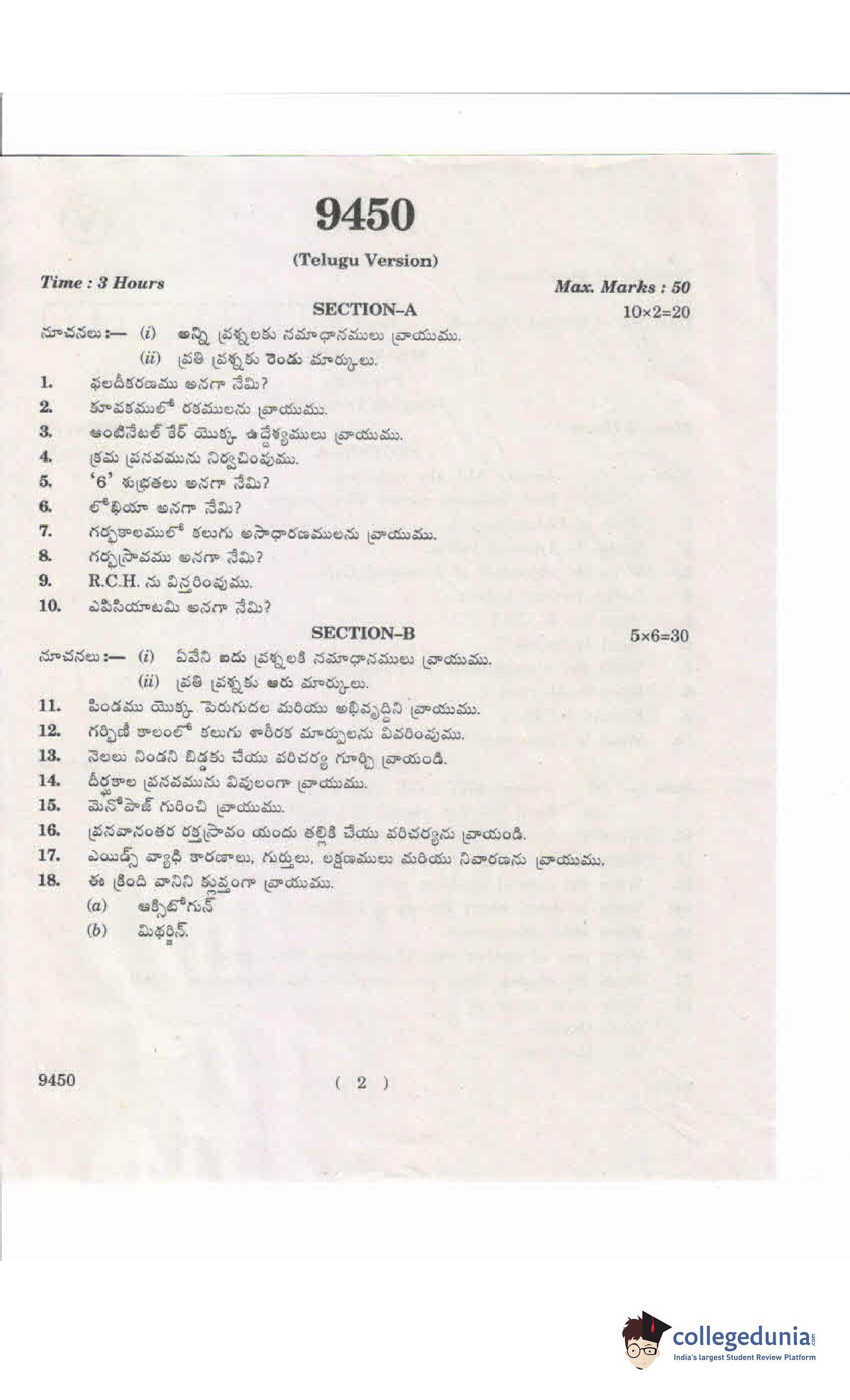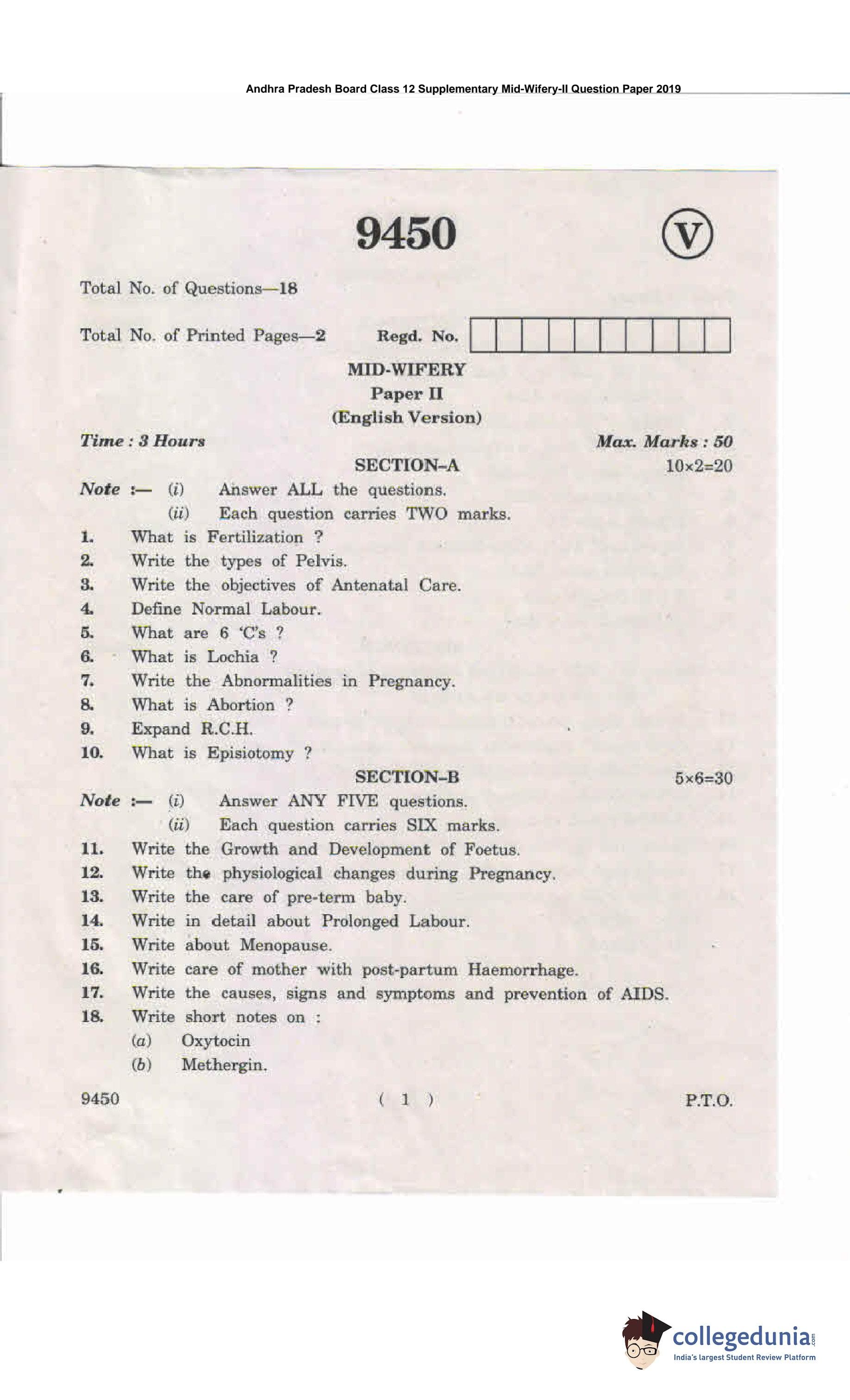AP Intermediate 2nd year Mid-Wifery Supplementary Question Paper 2019 with Answer Key 9450 is available for download. The exam was conducted by the Andhra Pradesh Board of Intermediate Education (APBIE). The medium of paper was English and Telugu. The question paper comprised a total of 18 questions divided among 2 sections.