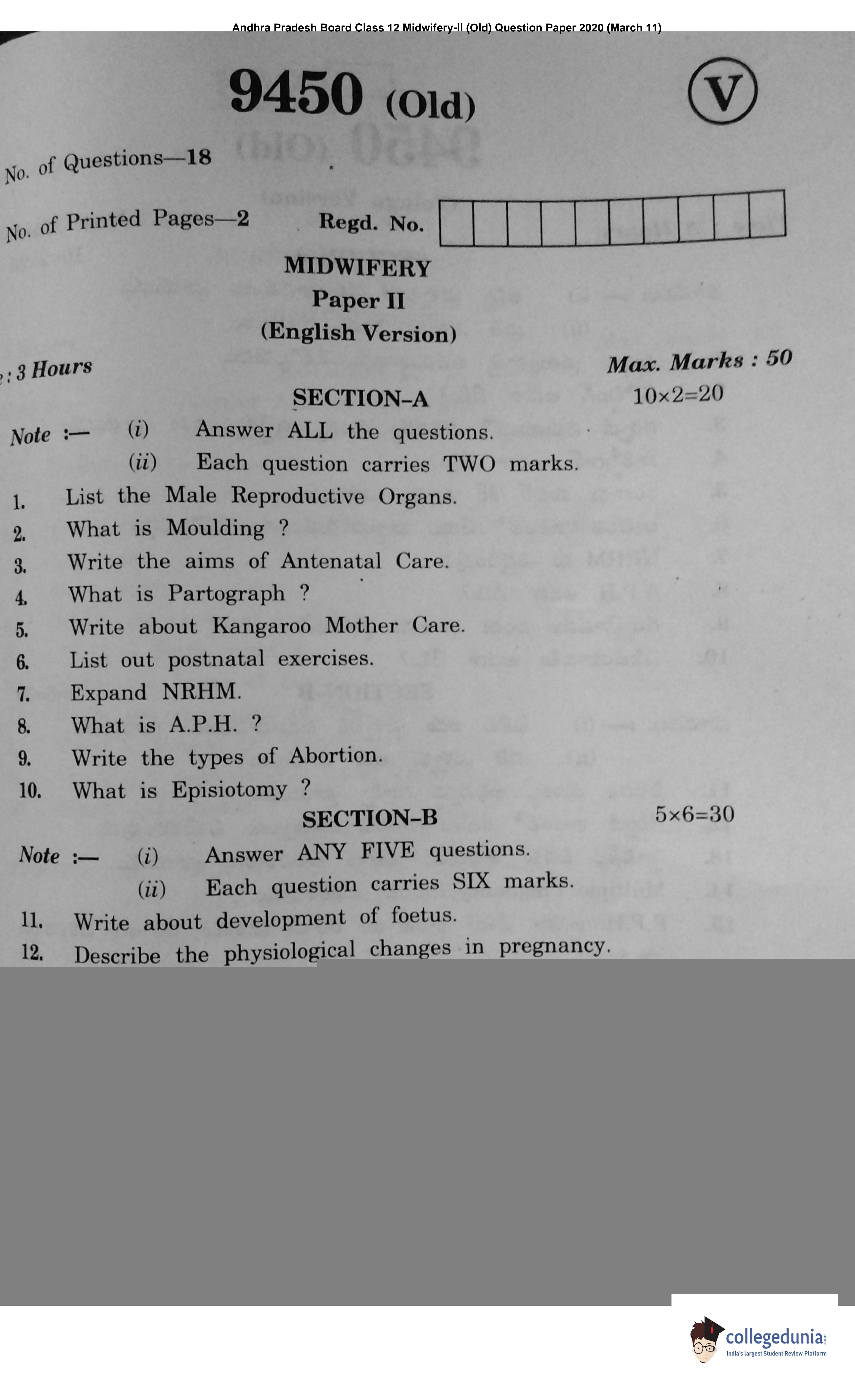 AP Intermediate 2nd year Midwifery (Old) Question Paper 2020 with Answer Key is available for download. The exam was conducted by the Andhra Pradesh Board of Intermediate Education (APBIE) on March 11, 2020 in the Morning Session 9 AM to 12 PM. The medium of paper was English and Telugu.The question paper comprised a total of 18 questions divided among 2 sections.
