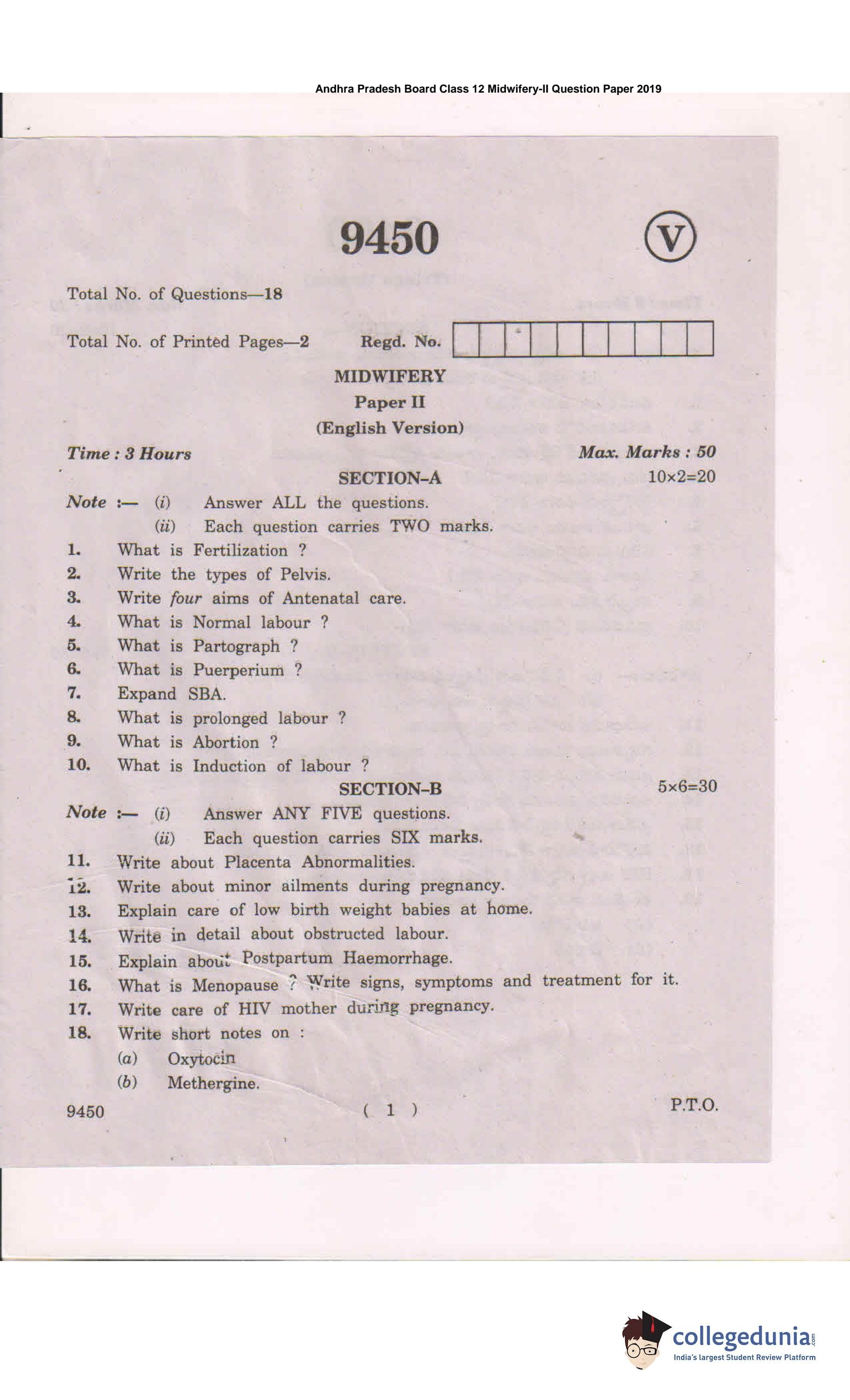 AP Intermediate 2nd year Midwifery Question Paper 2019 with Answer Key is available for download. The exam was conducted by the Andhra Pradesh Board of Intermediate Education (APBIE) . The medium of paper was English and Telugu.The question paper comprised a total of 18 questions divided among 2 sections.