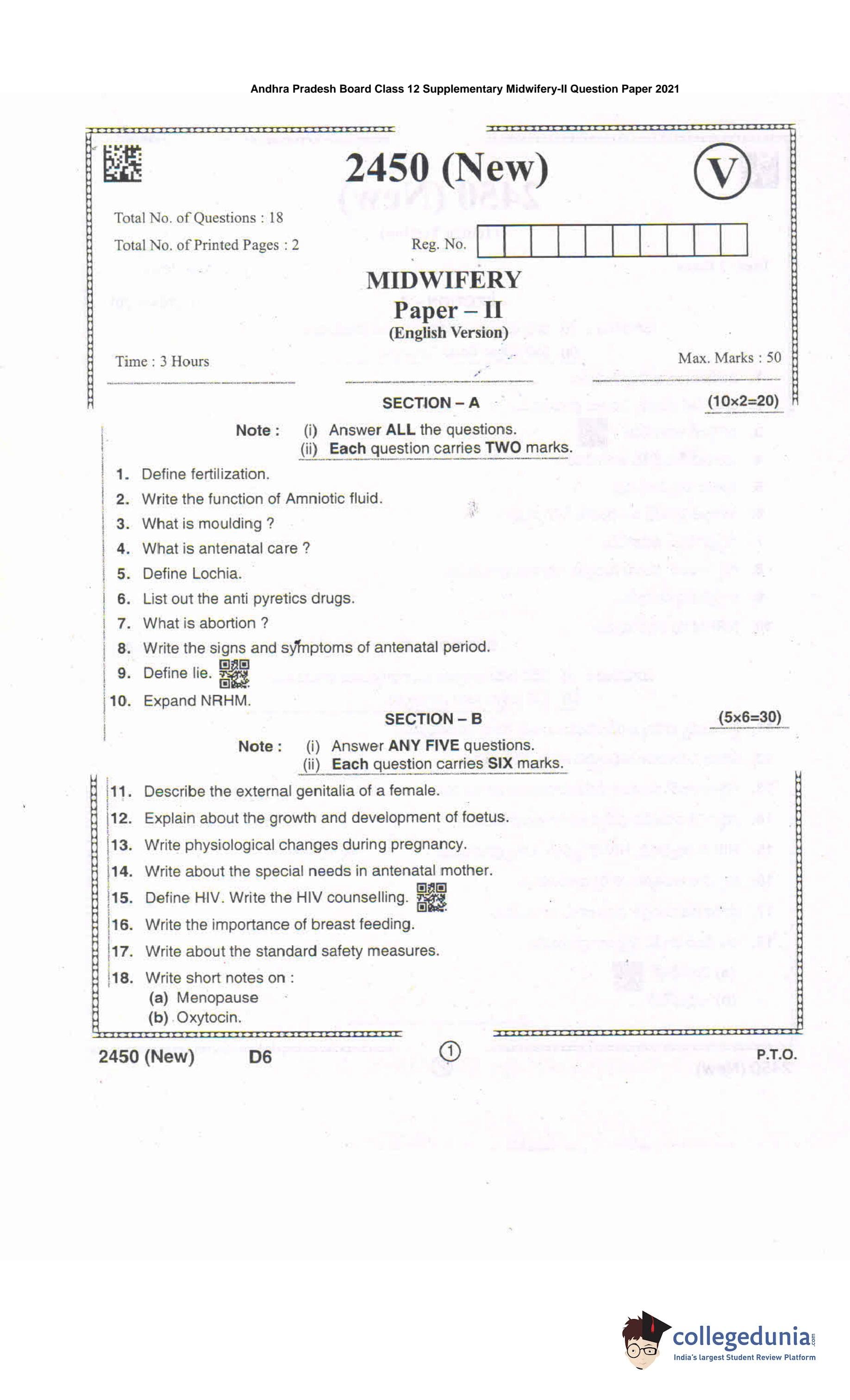 AP Intermediate 2nd year Midwifery Supplementary Question Paper 2021 with Answer Key is available for download. The exam was conducted by the Andhra Pradesh Board of Intermediate Education (APBIE). The medium of paper was English and Telugu. The question paper comprised a total of 18 questions divided among 2 sections.